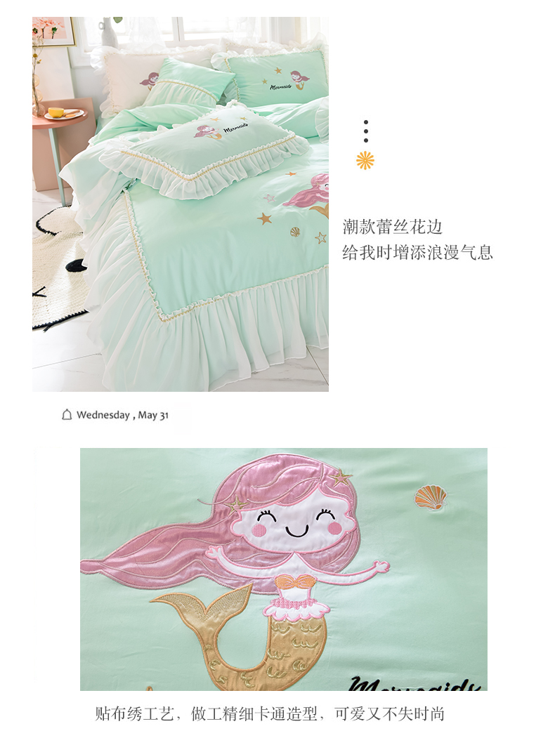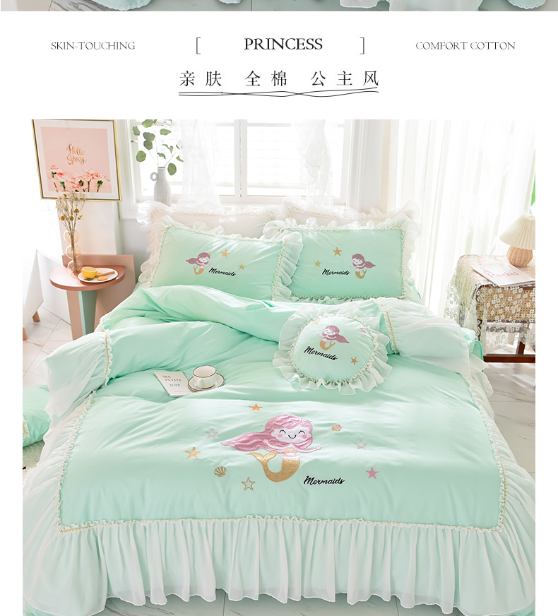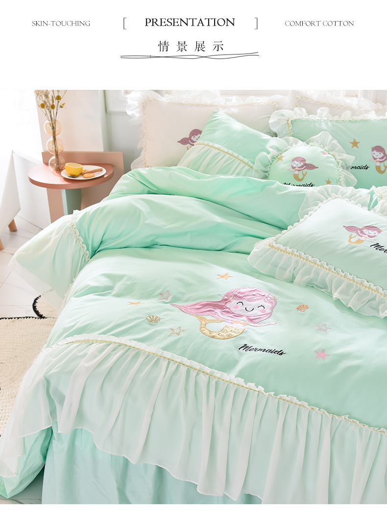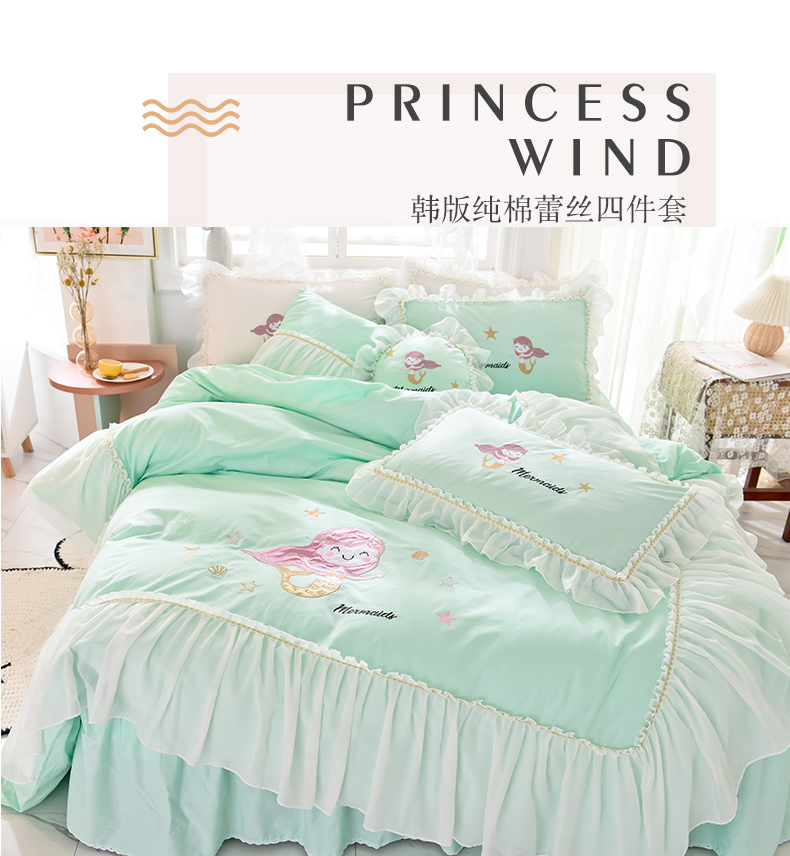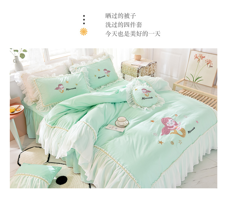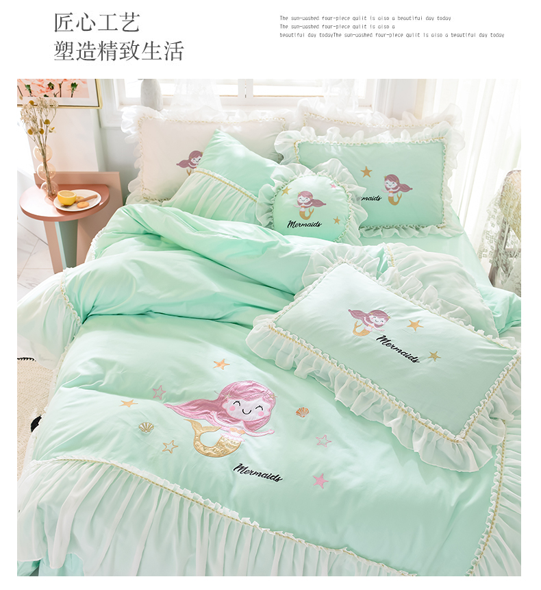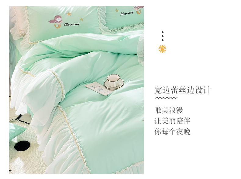 商品名称:花香四季家纺 2025新款13376纯棉贴布刺绣雪纺纱四件套-人鱼小姐 人鱼小姐绿