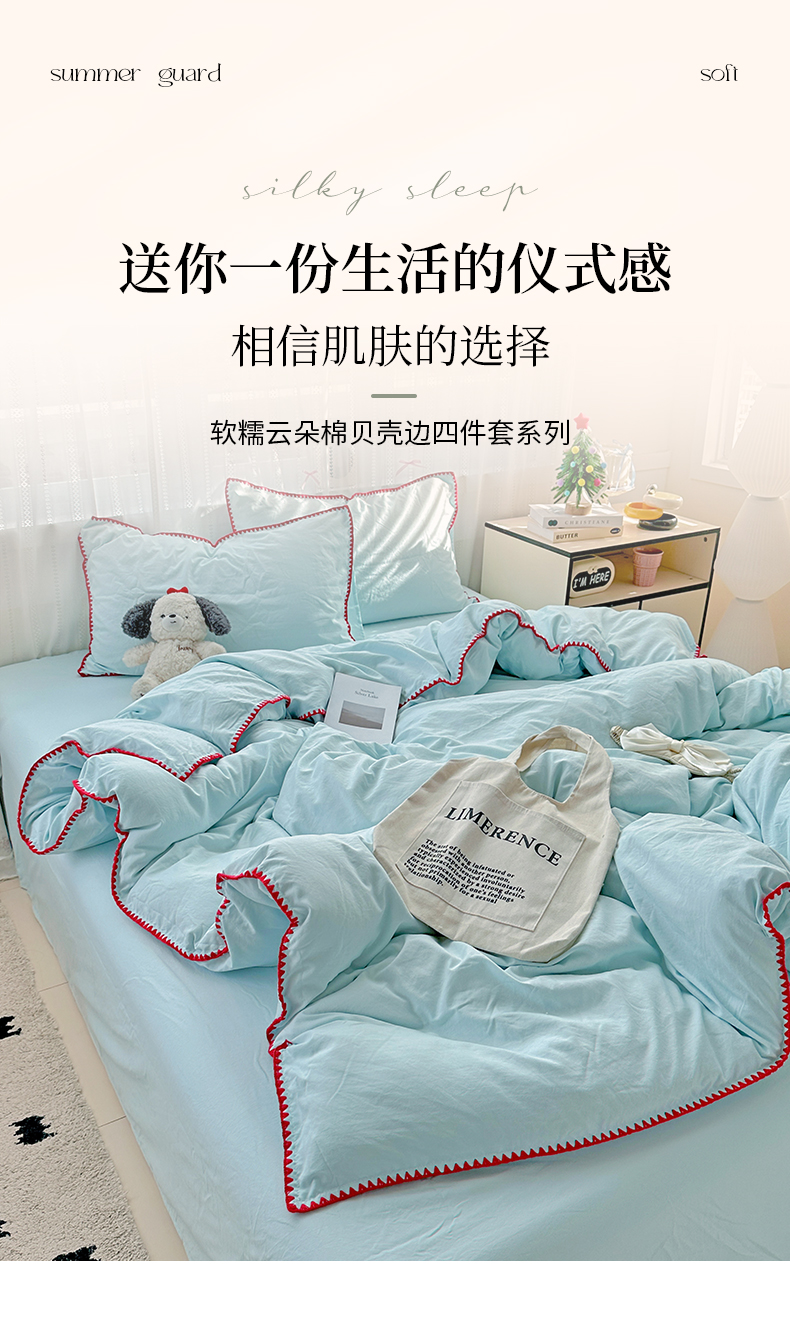 当前位置: 91家纺网 > 商品网购 > 床品套件 > 四件套 > 其它四件套 > 繁花家居 2025新款高克重云朵棉贝壳边系列四件套 绵绵-浅蓝