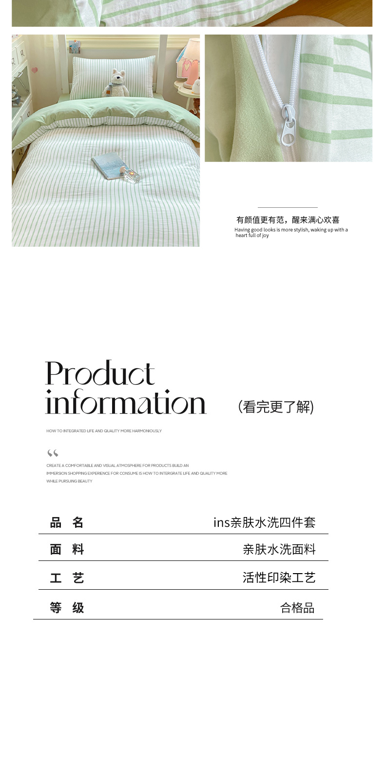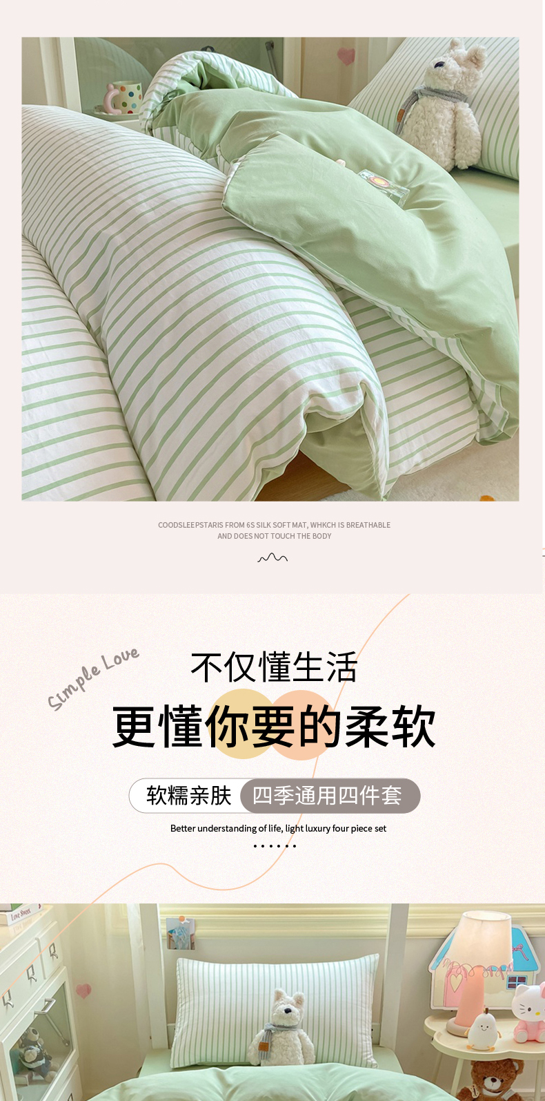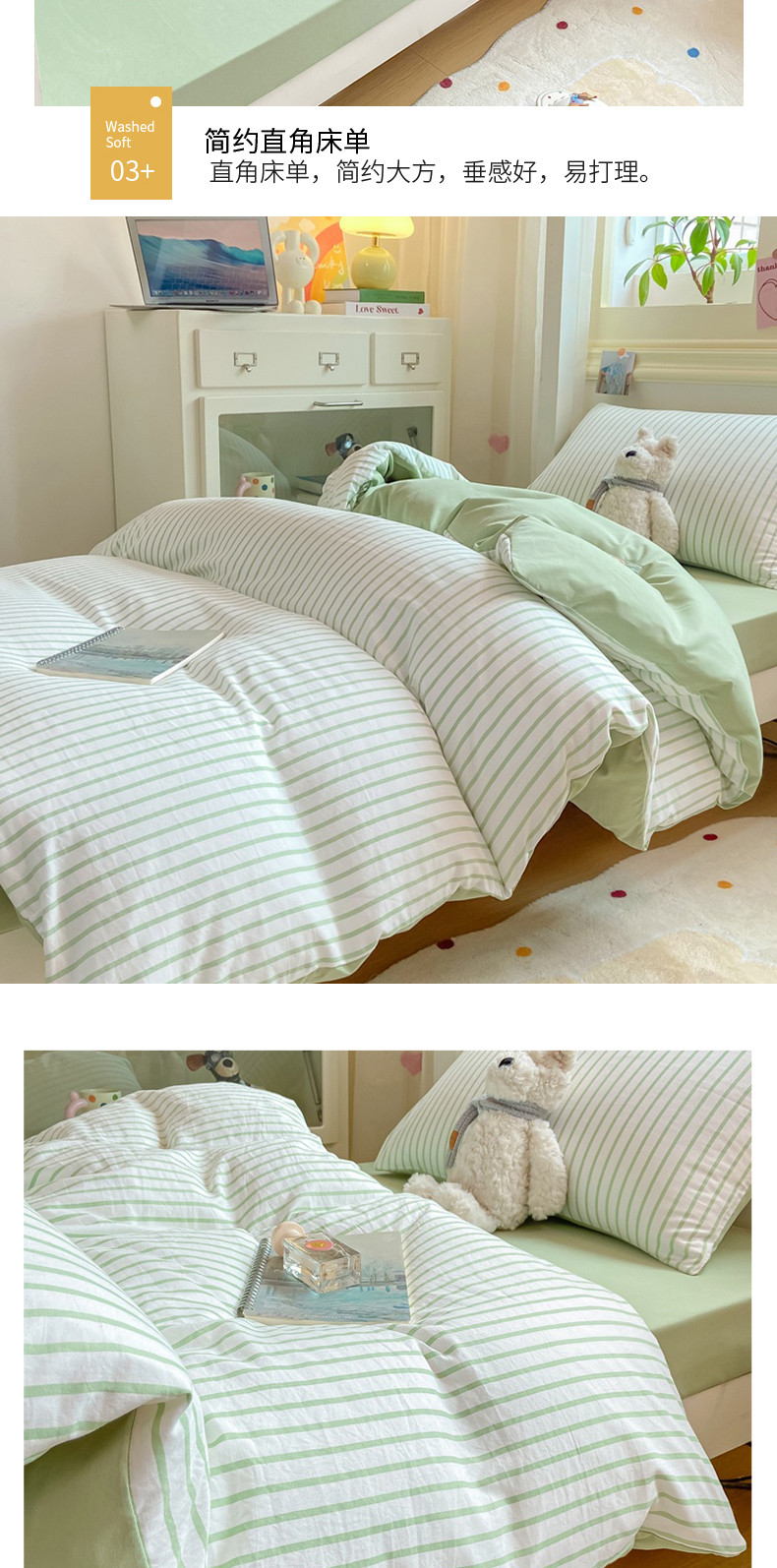 当前位置: 91家纺网 > 商品网购 > 床品套件 > 四件套 > 其它四件套 > 麒东家纺 2025新款开学季学生ins风条纹方格水洗四件套学生上下铺三件套 条纹绿色