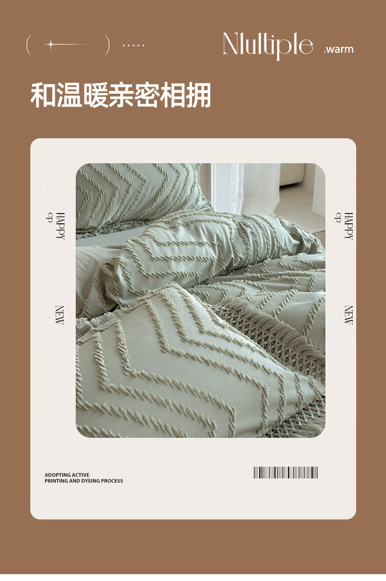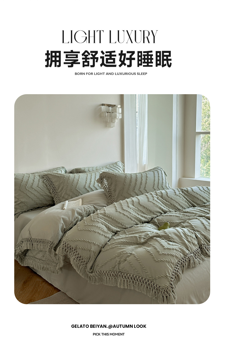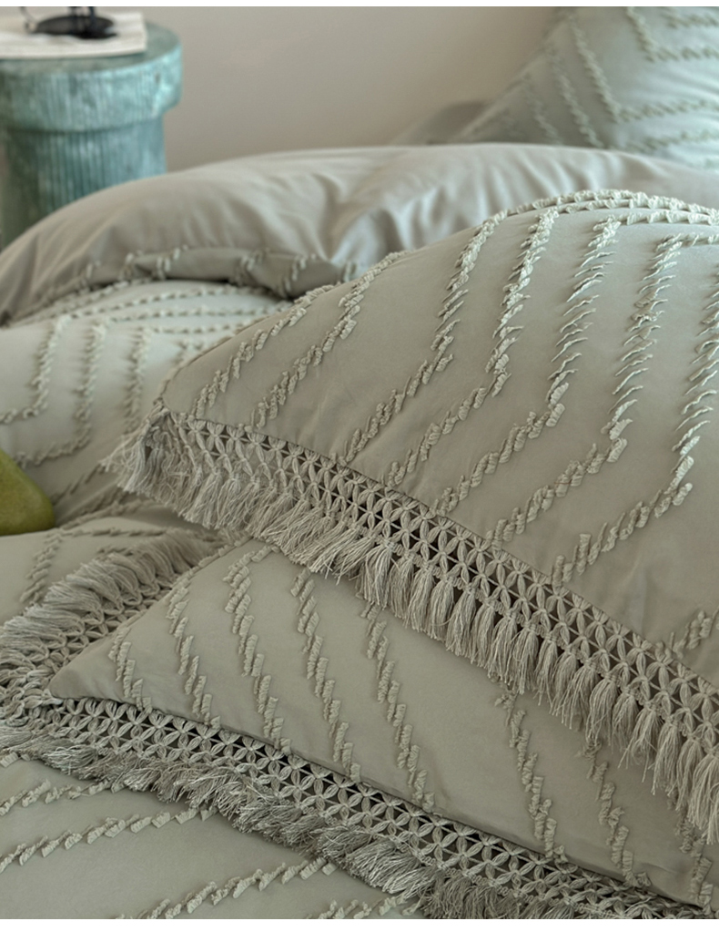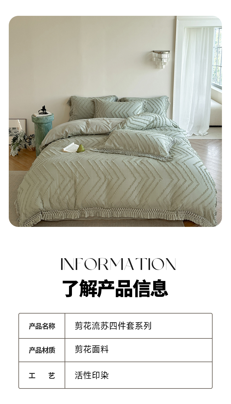 当前位置: 91家纺网 > 商品网购 > 床品套件 > 四件套 > 其它四件套 > 缘生活 2025新款素色简约立体剪花流苏四件套 剪花波浪+流苏旧绿