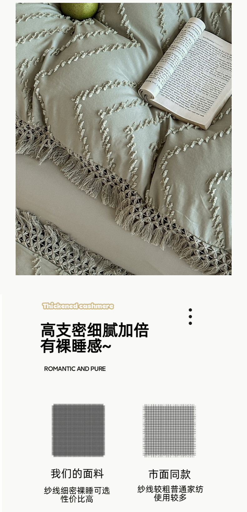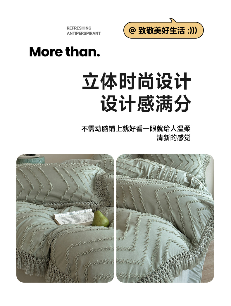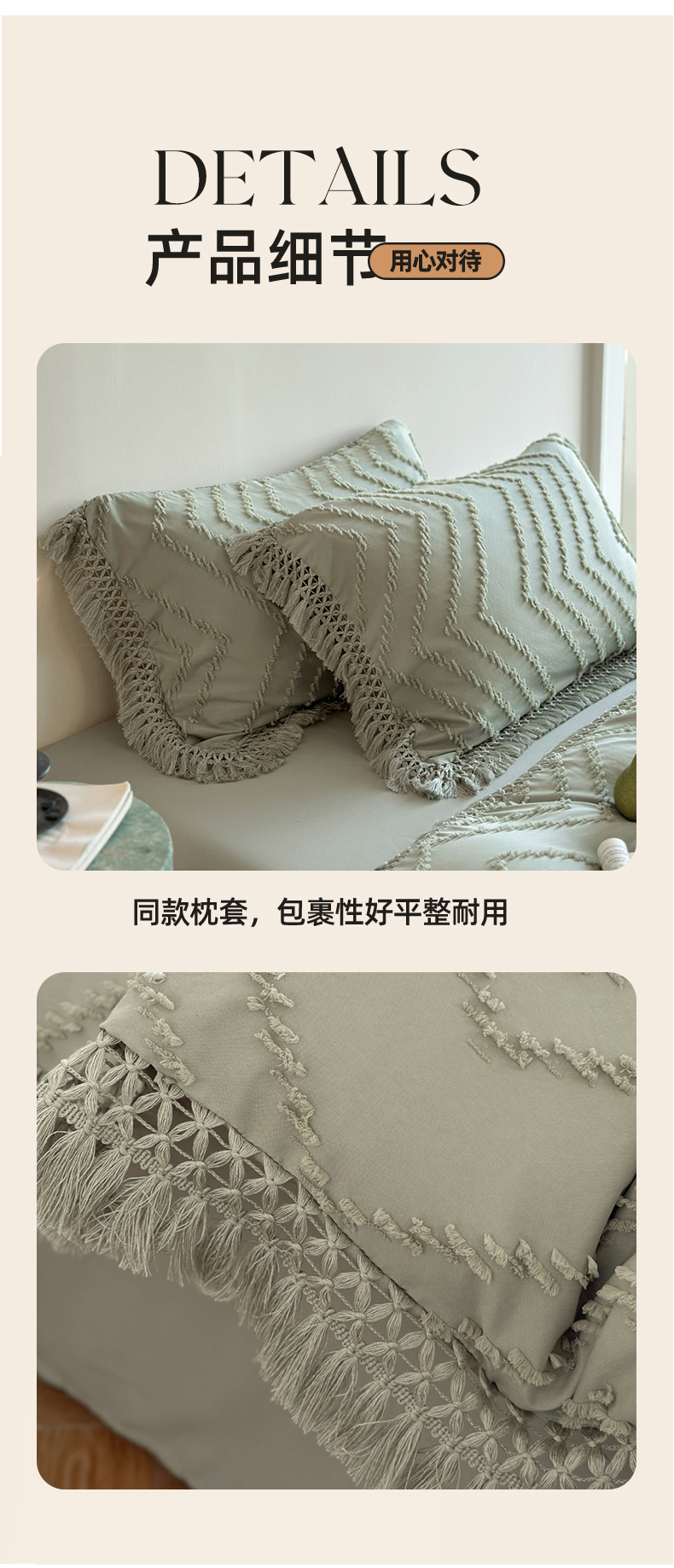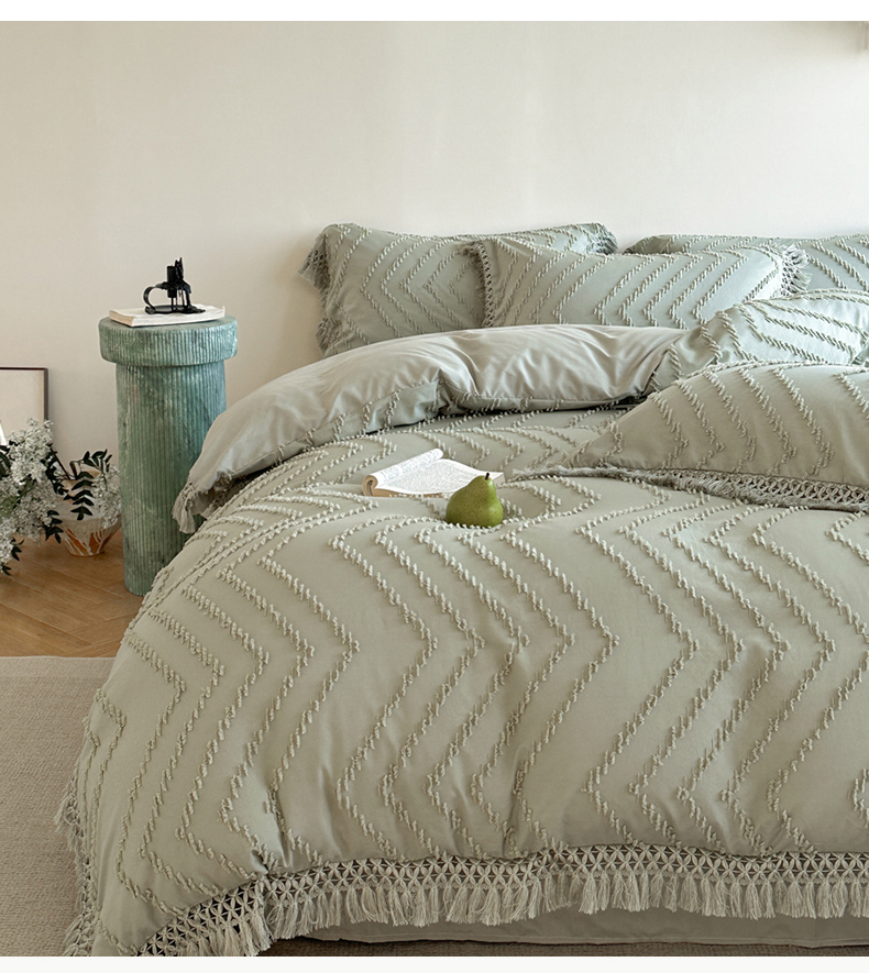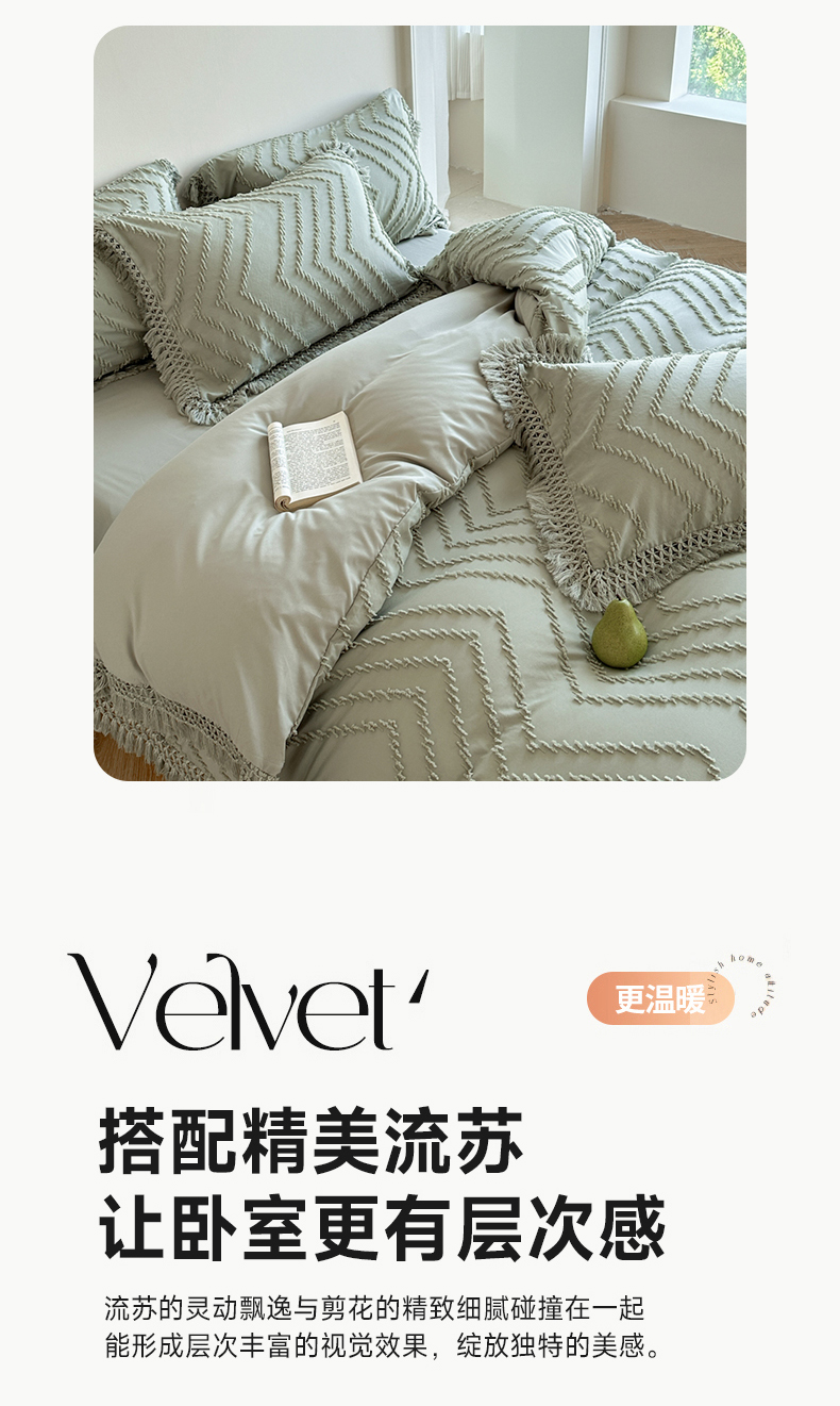 当前位置: 91家纺网 > 商品网购 > 床品套件 > 四件套 > 其它四件套 > 缘生活 2025新款素色简约立体剪花流苏四件套 剪花波浪+流苏旧绿