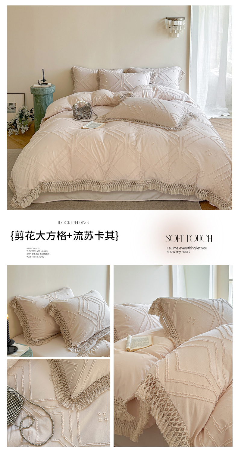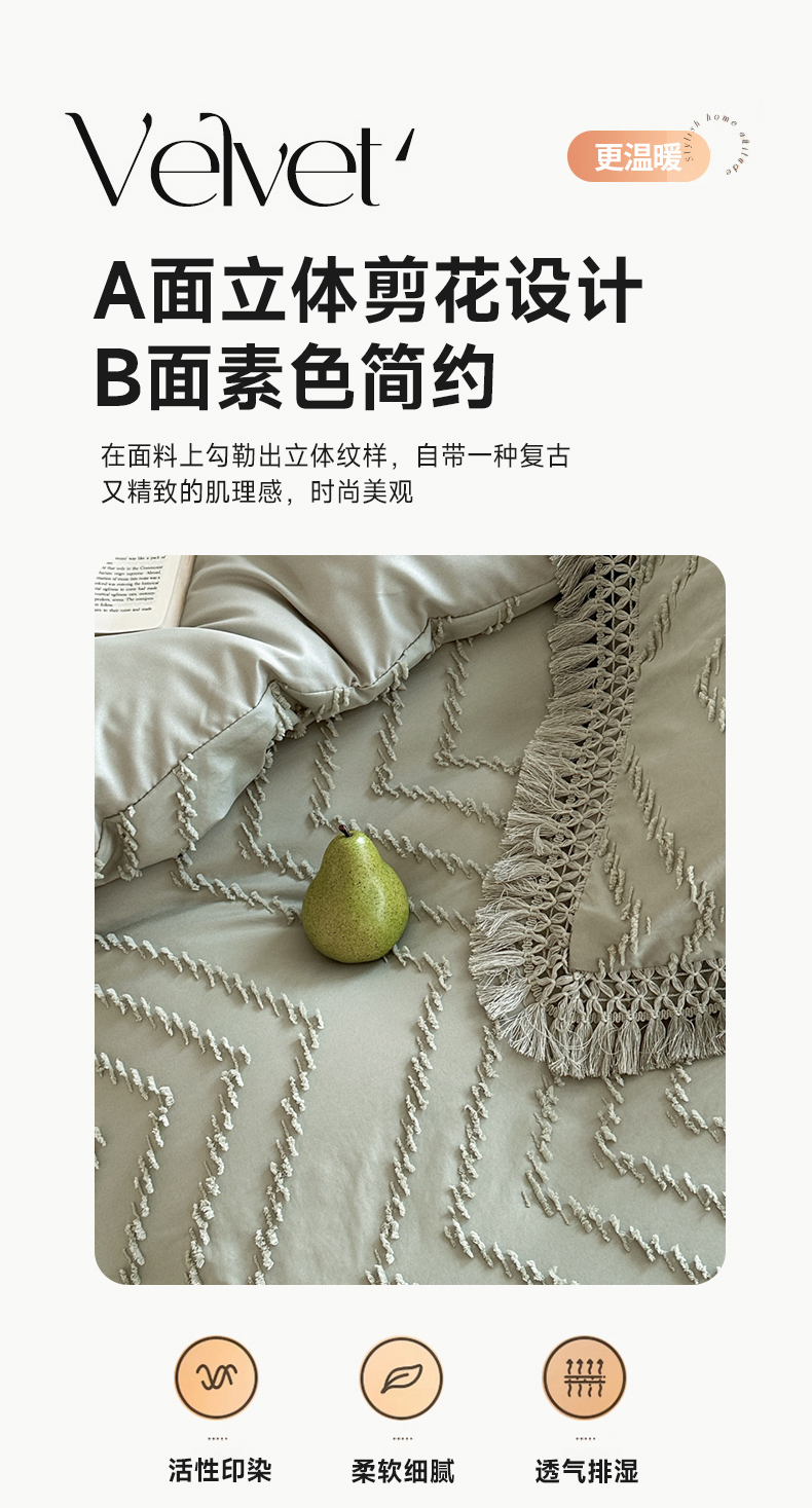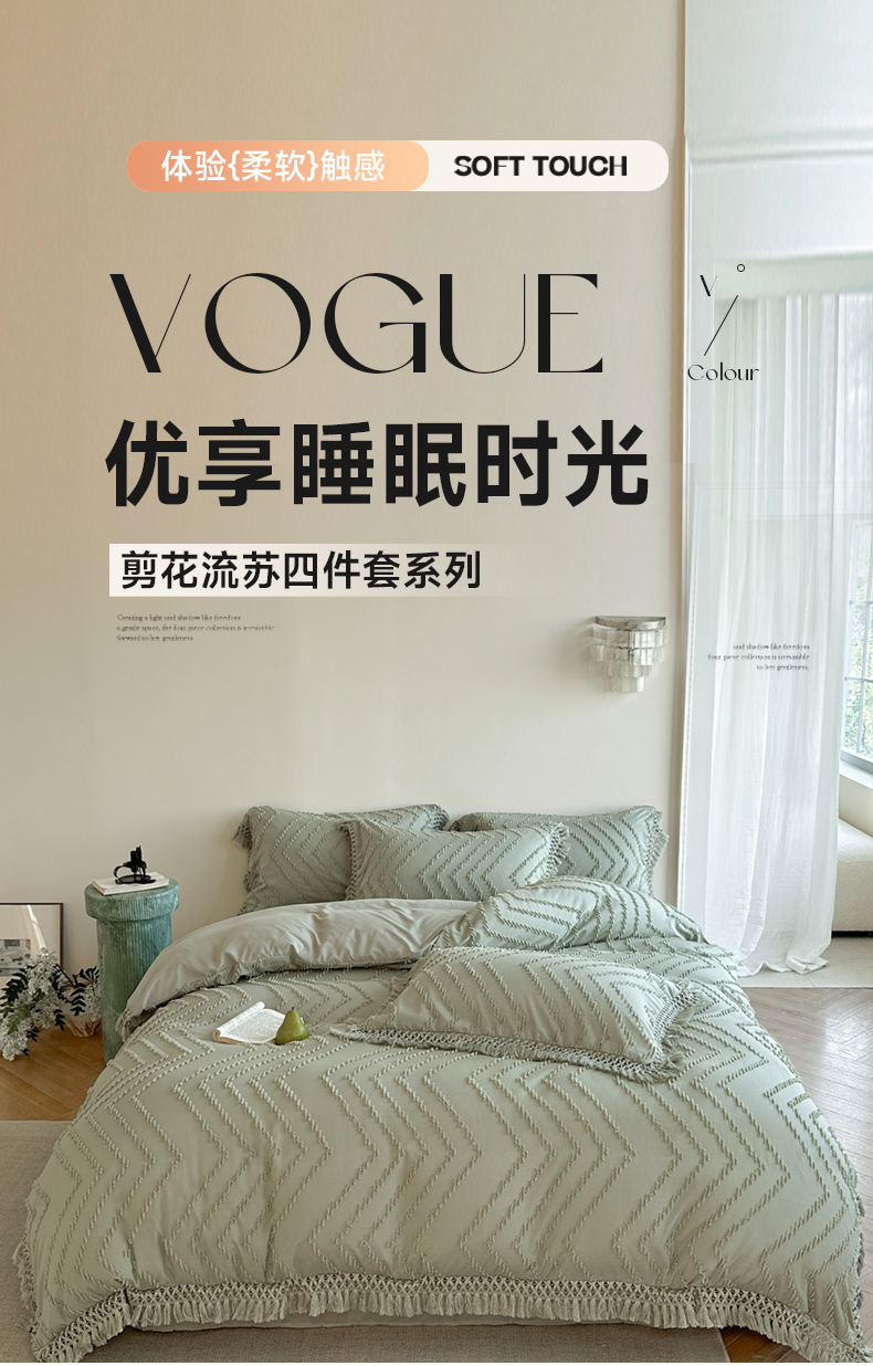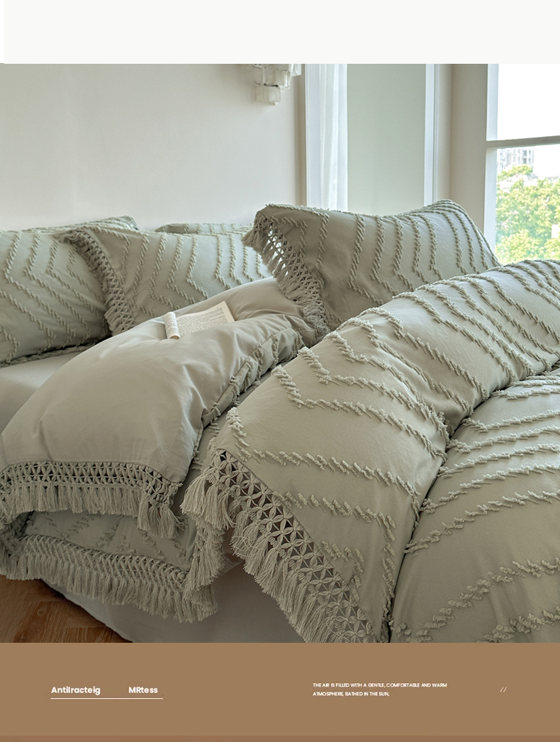 当前位置: 91家纺网 > 商品网购 > 床品套件 > 四件套 > 其它四件套 > 缘生活 2025新款素色简约立体剪花流苏四件套 剪花波浪+流苏旧绿
