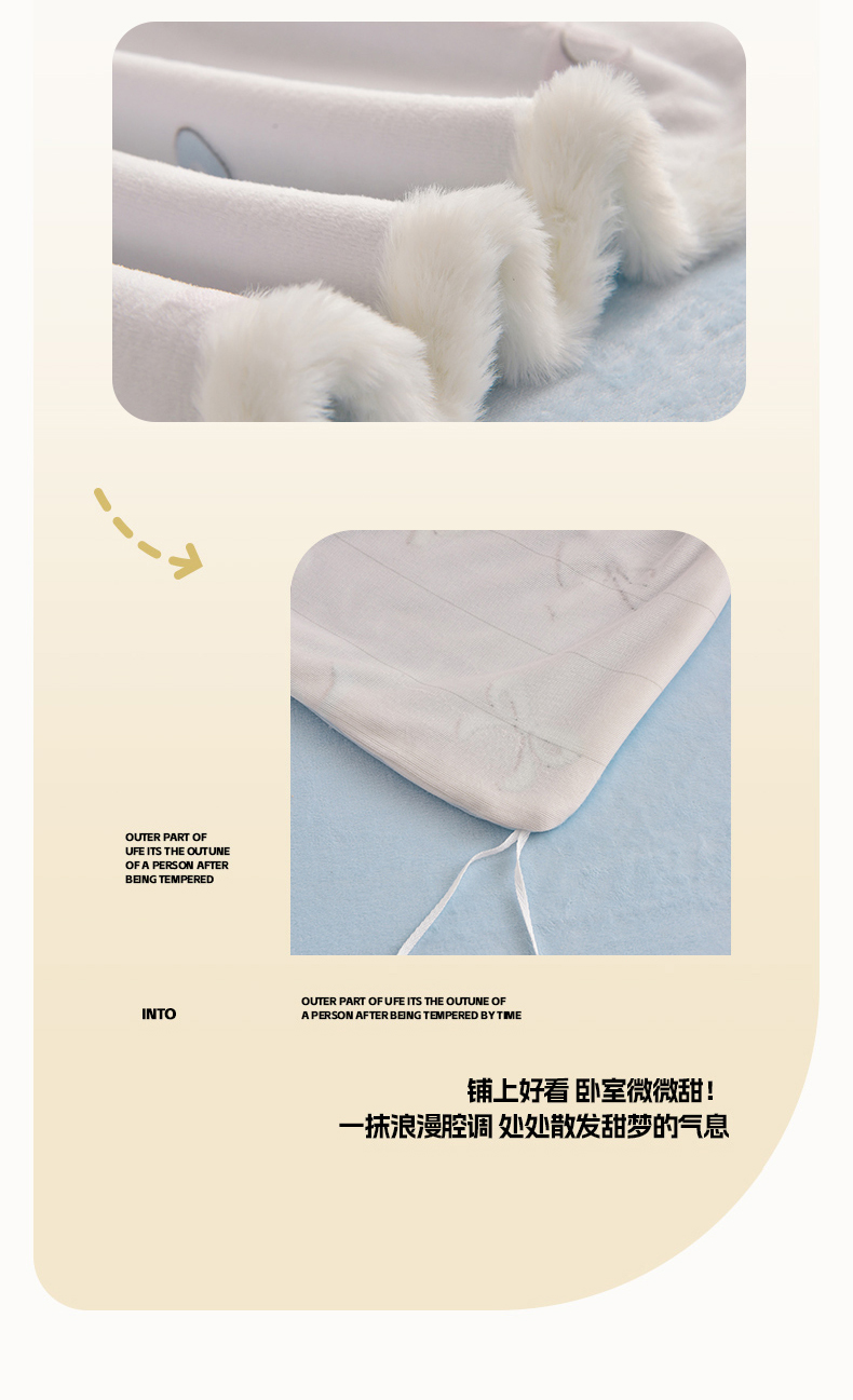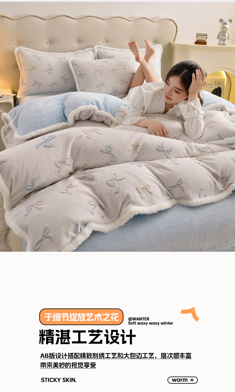 商品名称:芯诗曼家纺 2025新款兔毛绒兔兔绒大包边立体雕花绒印花牛奶绒四件套 多彩蝴蝶结