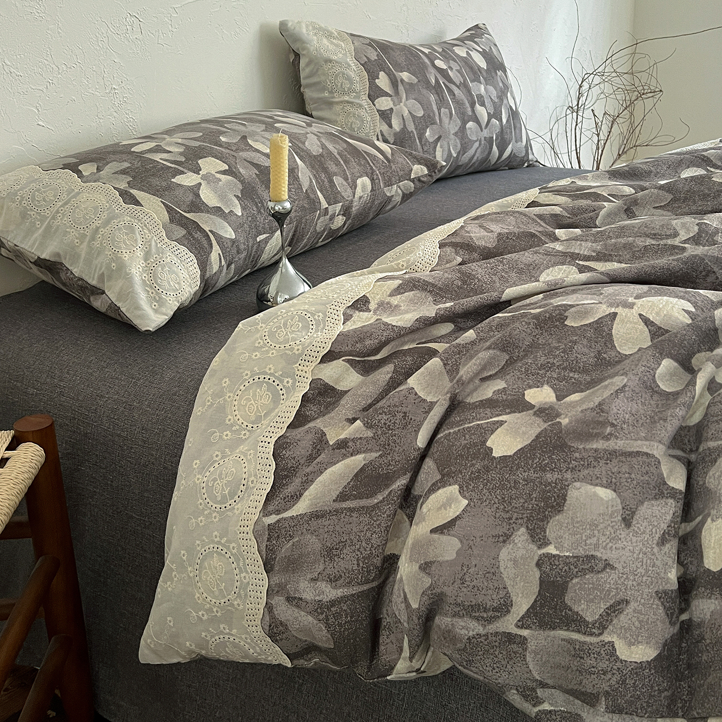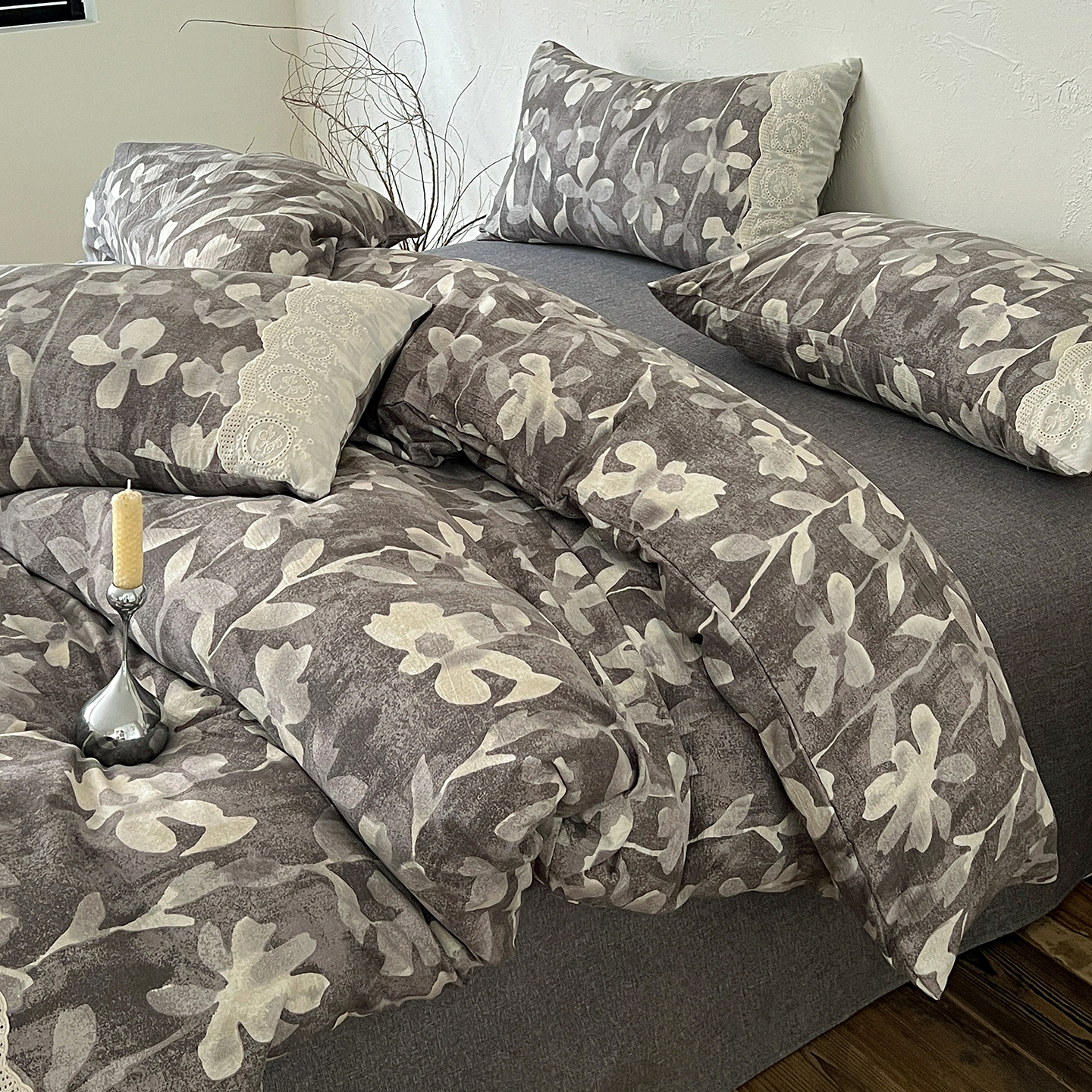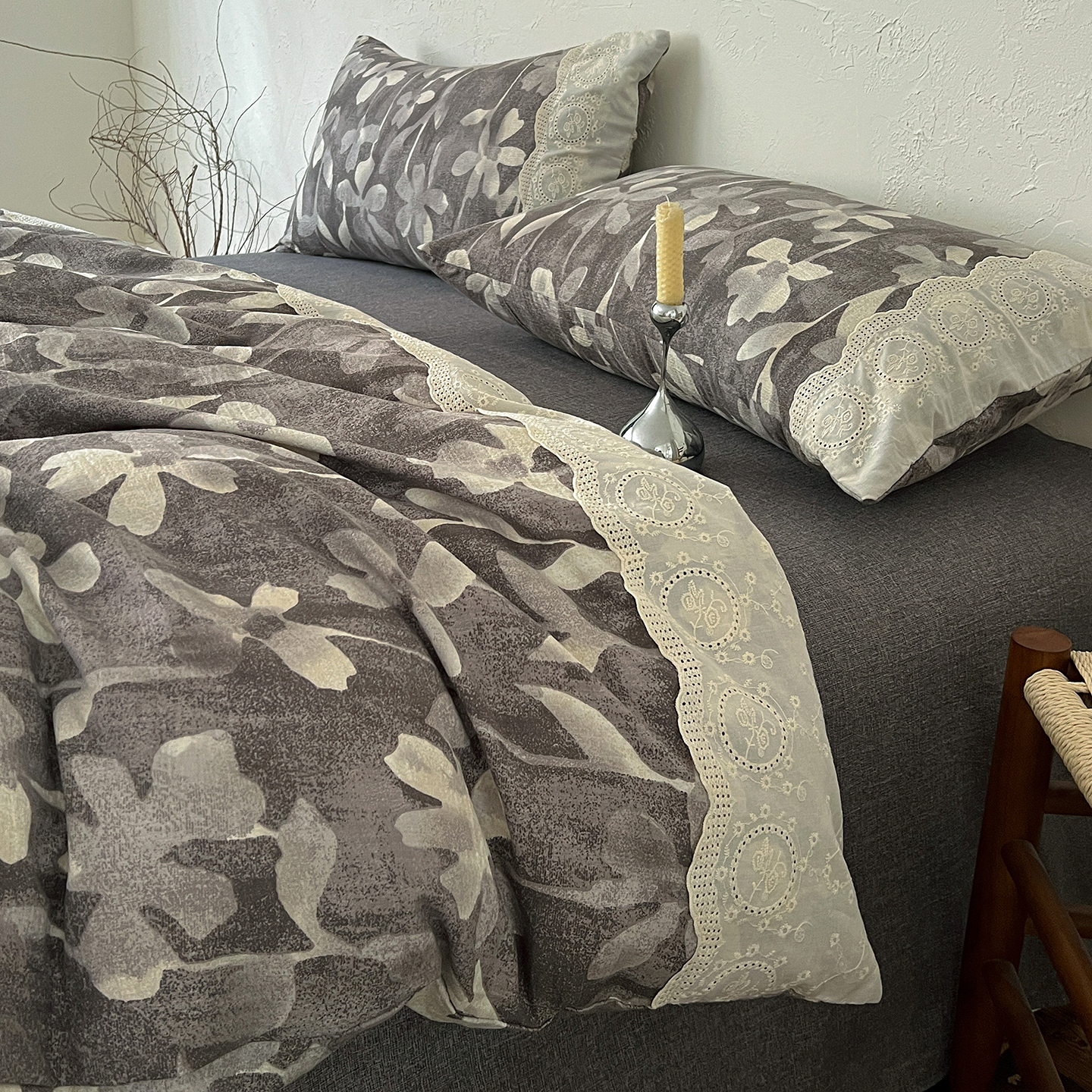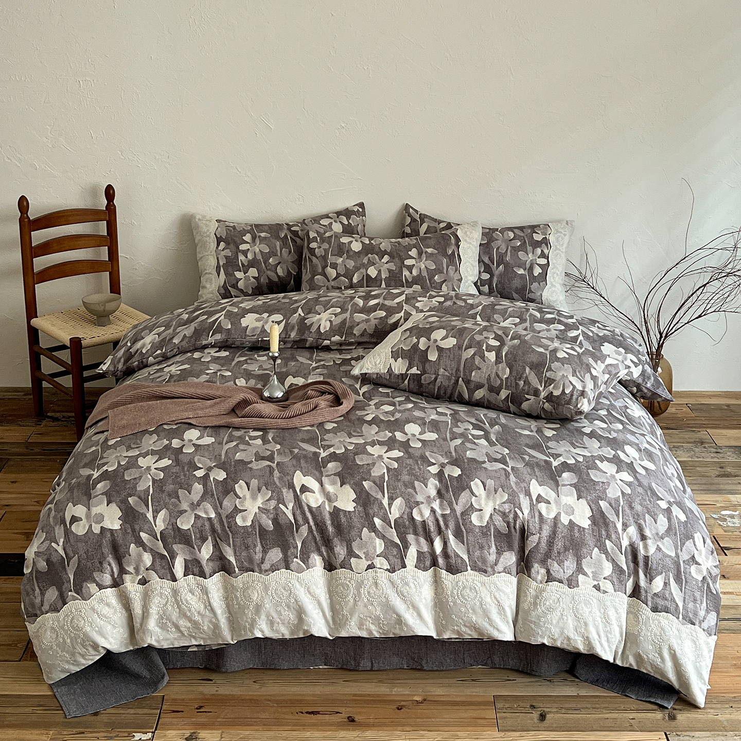 商品名称:一比一家纺 2025秋冬新品高克重原麻复古全棉花边棉麻侘寂风原麻四件套 (控价99元)花影灰