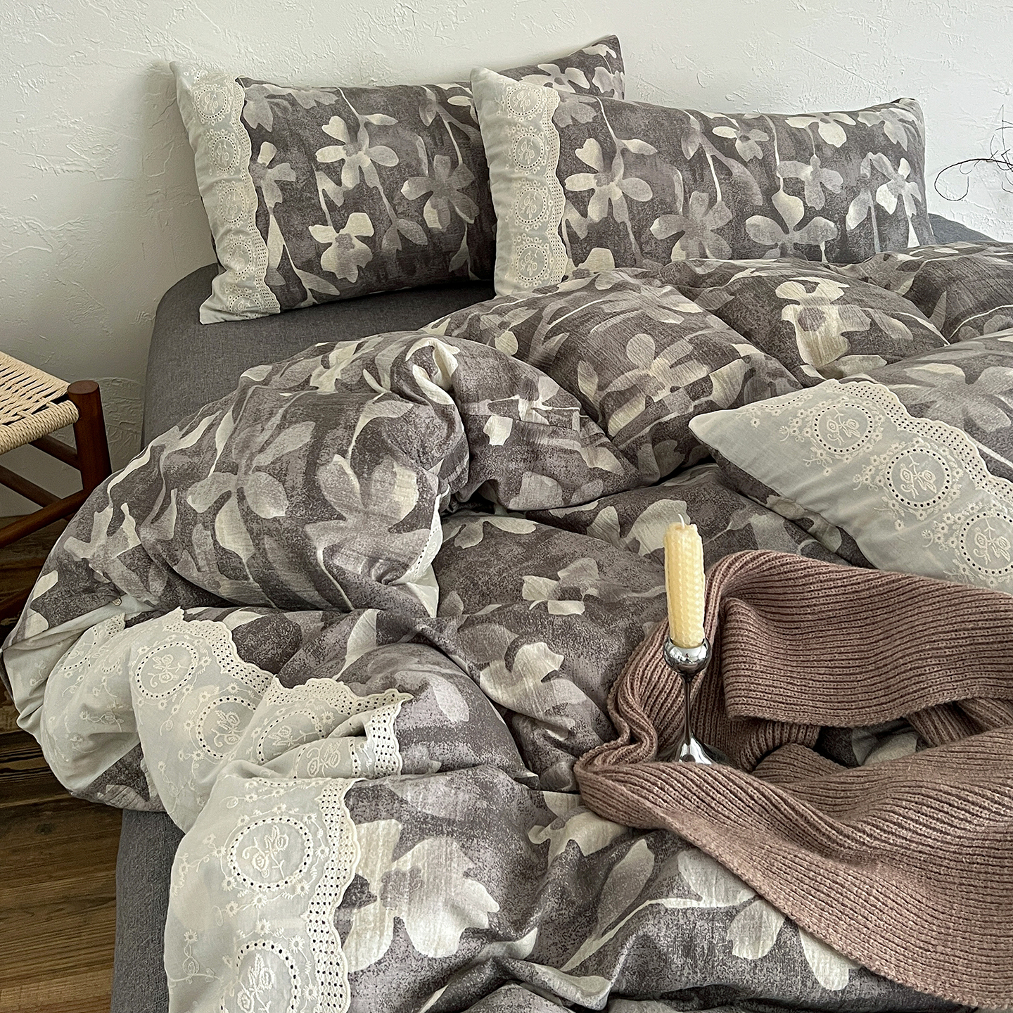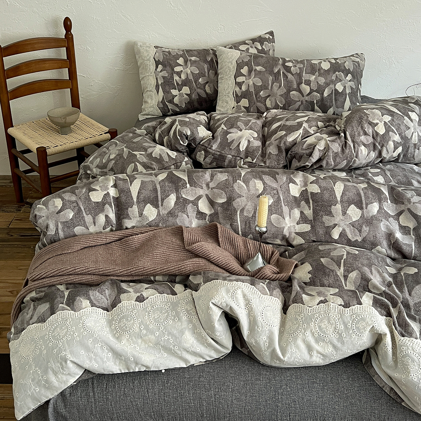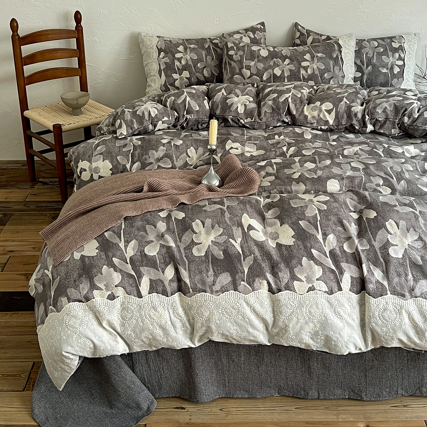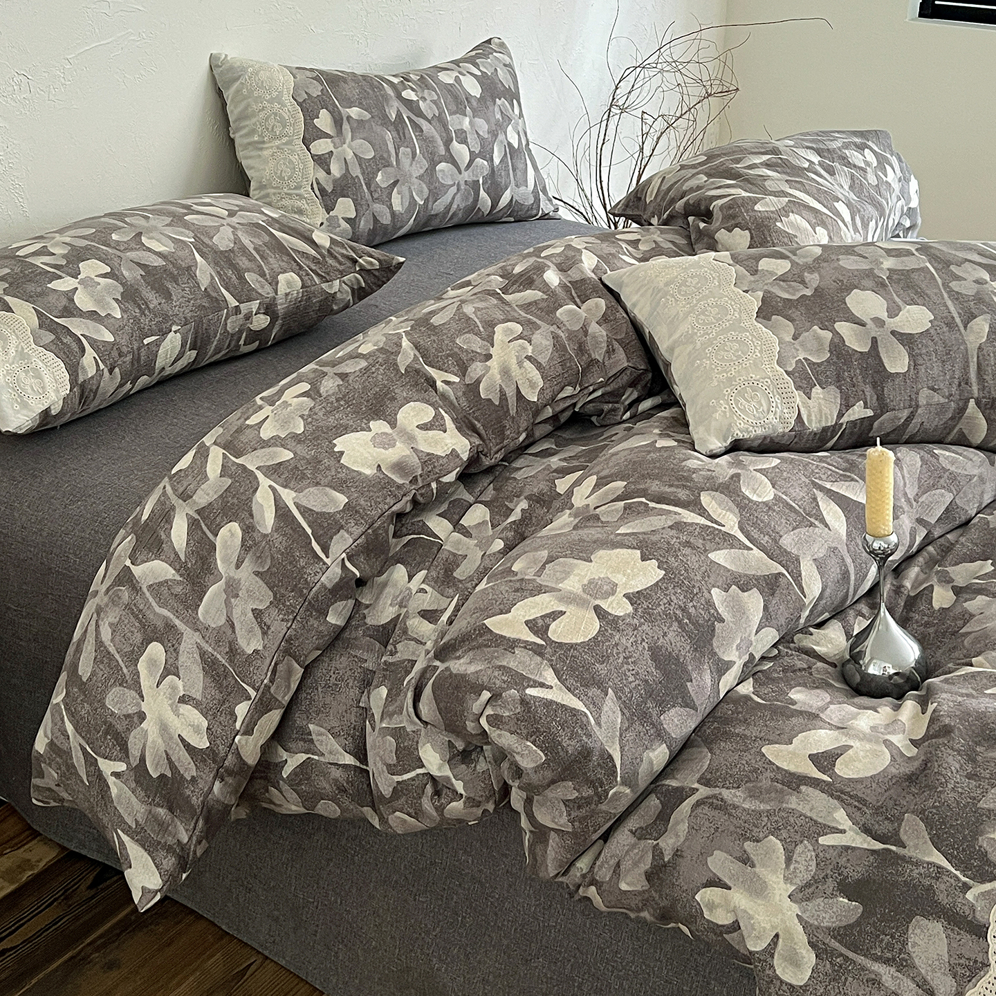 商品名称:一比一家纺 2025秋冬新品高克重原麻复古全棉花边棉麻侘寂风原麻四件套 (控价99元)花影灰