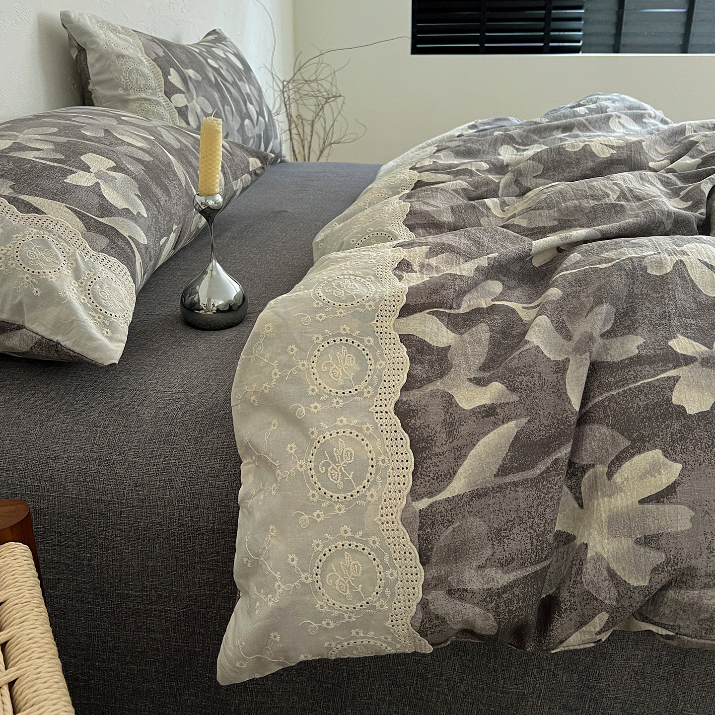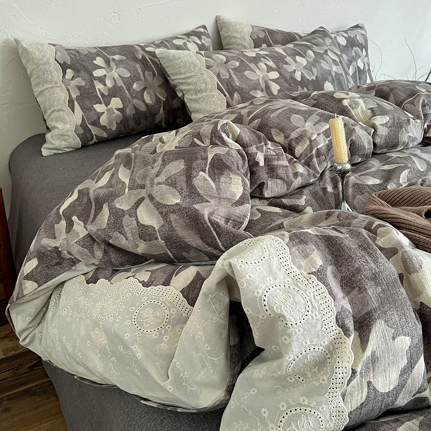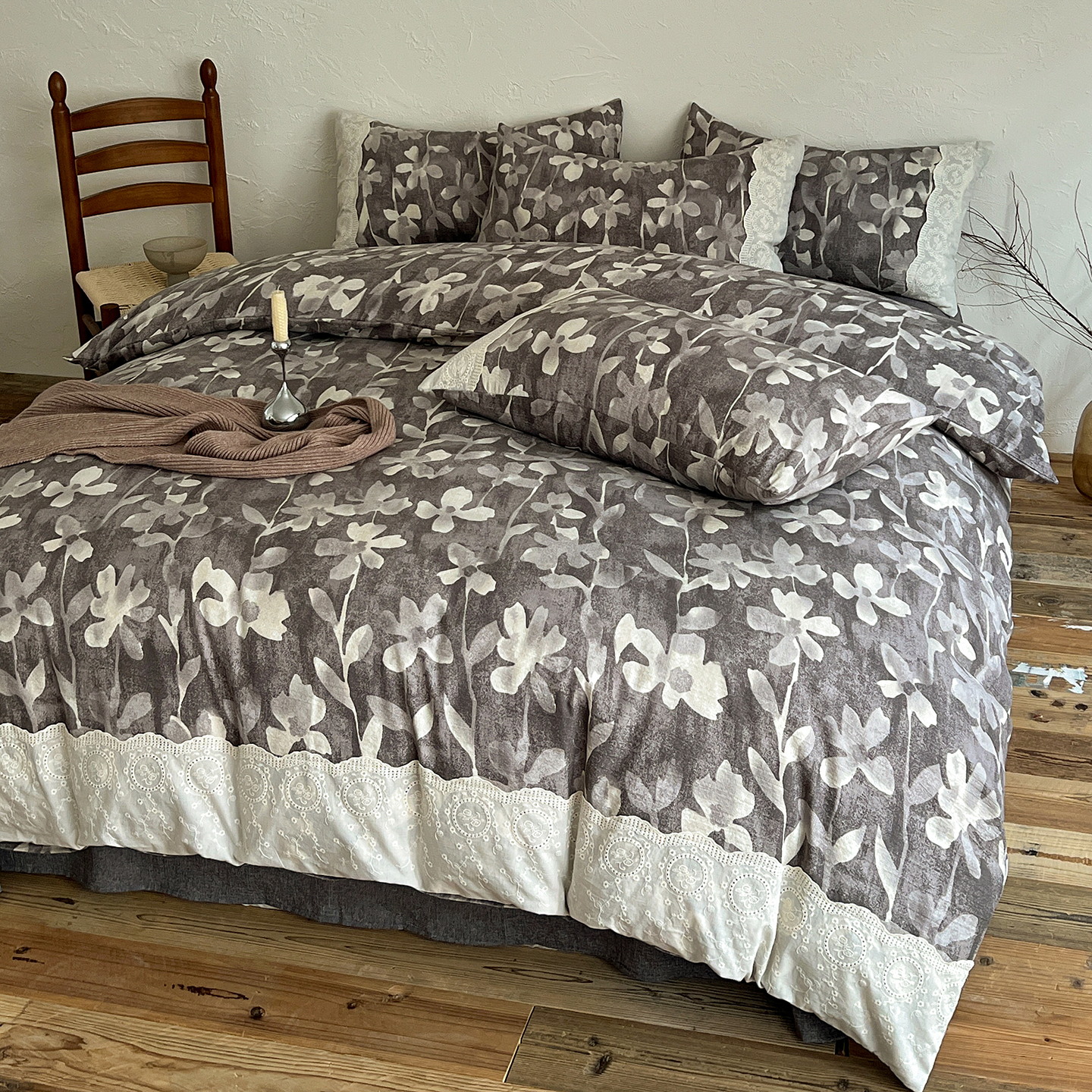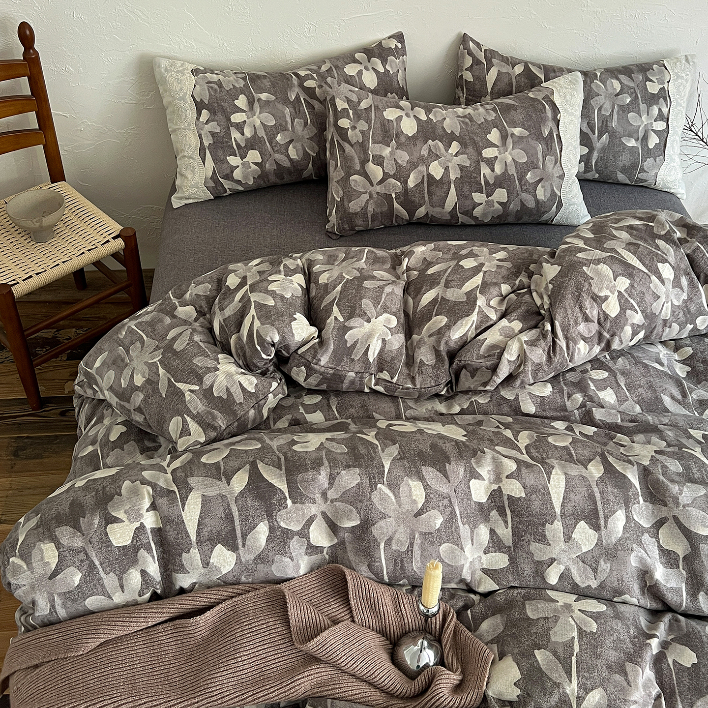 商品名称:一比一家纺 2025秋冬新品高克重原麻复古全棉花边棉麻侘寂风原麻四件套 (控价99元)花影灰