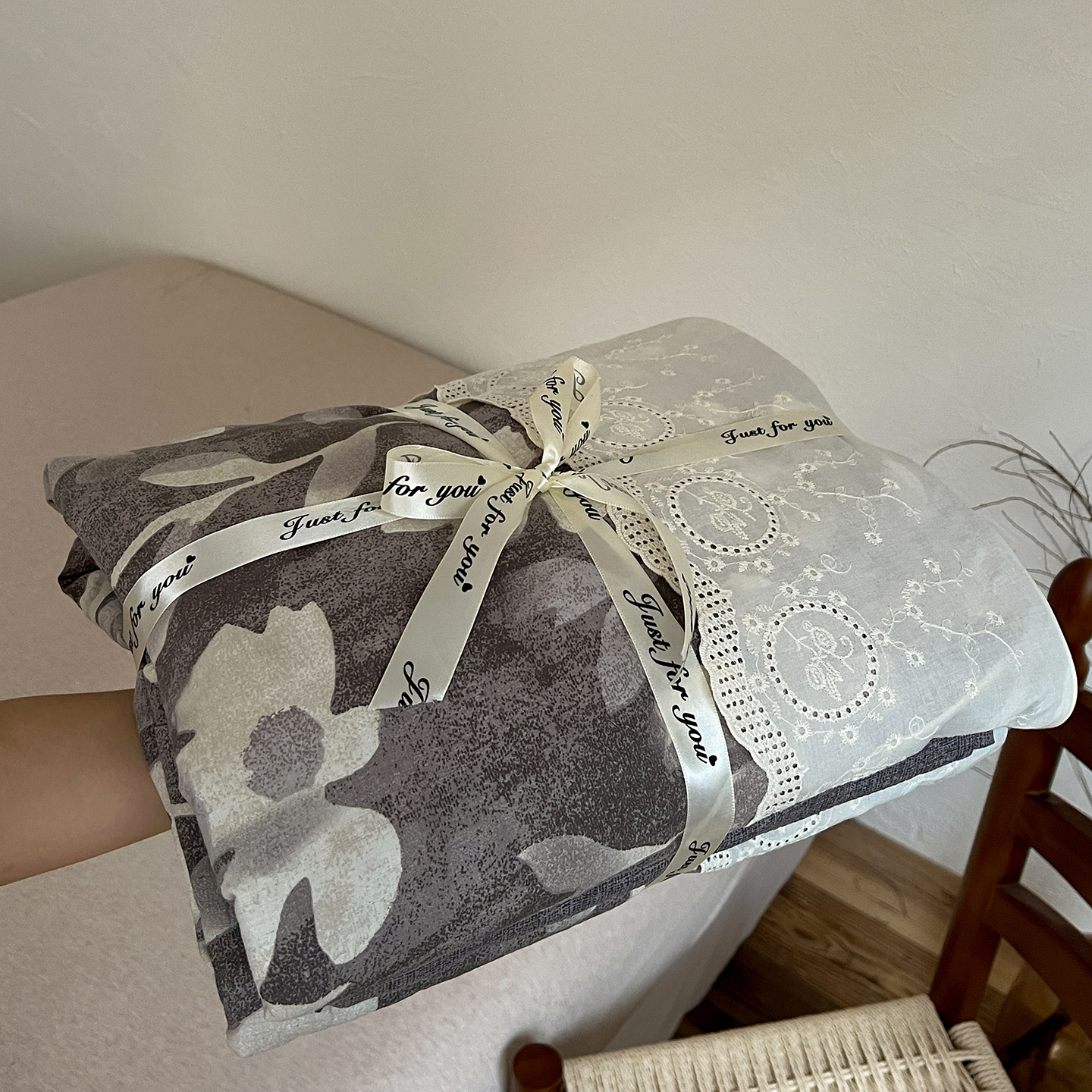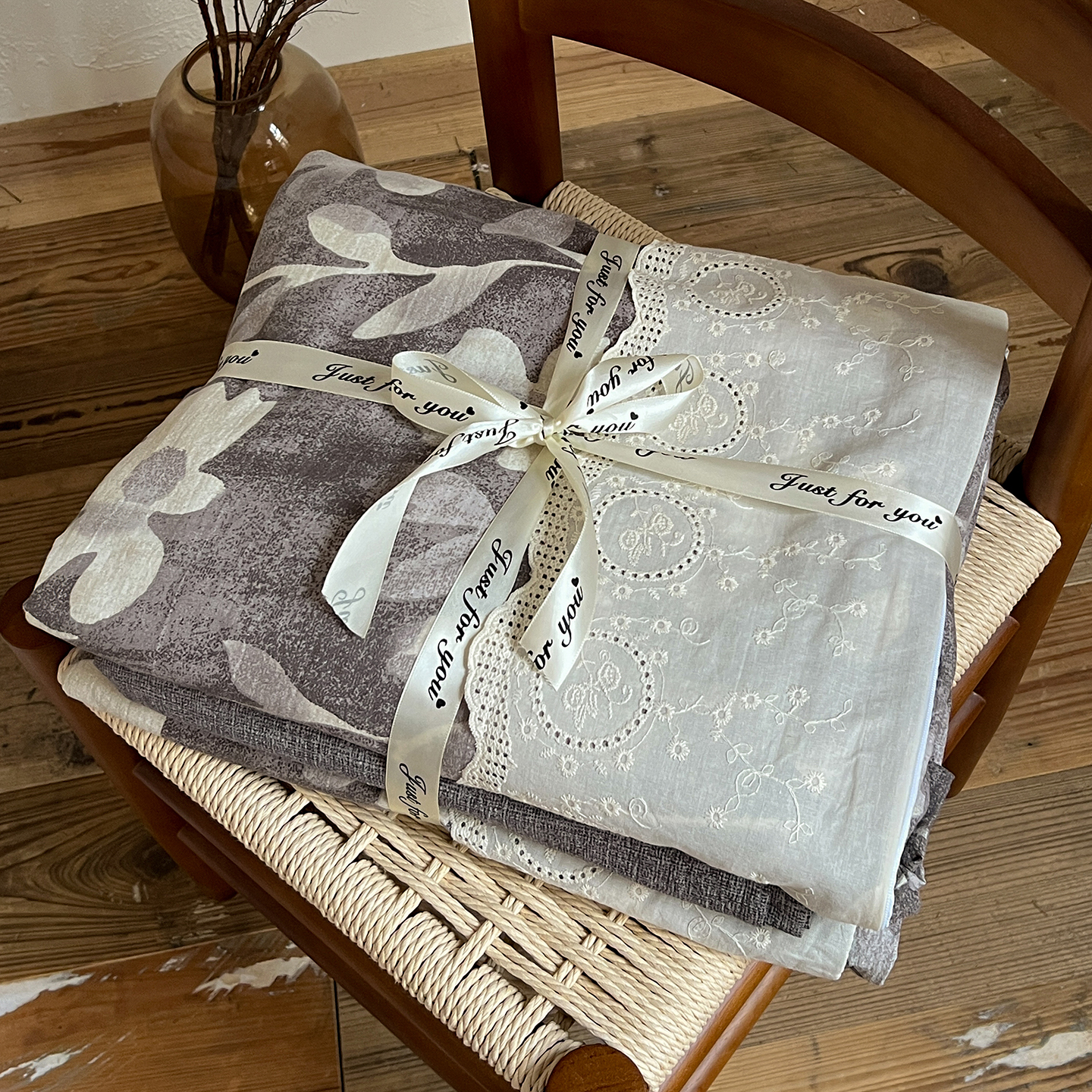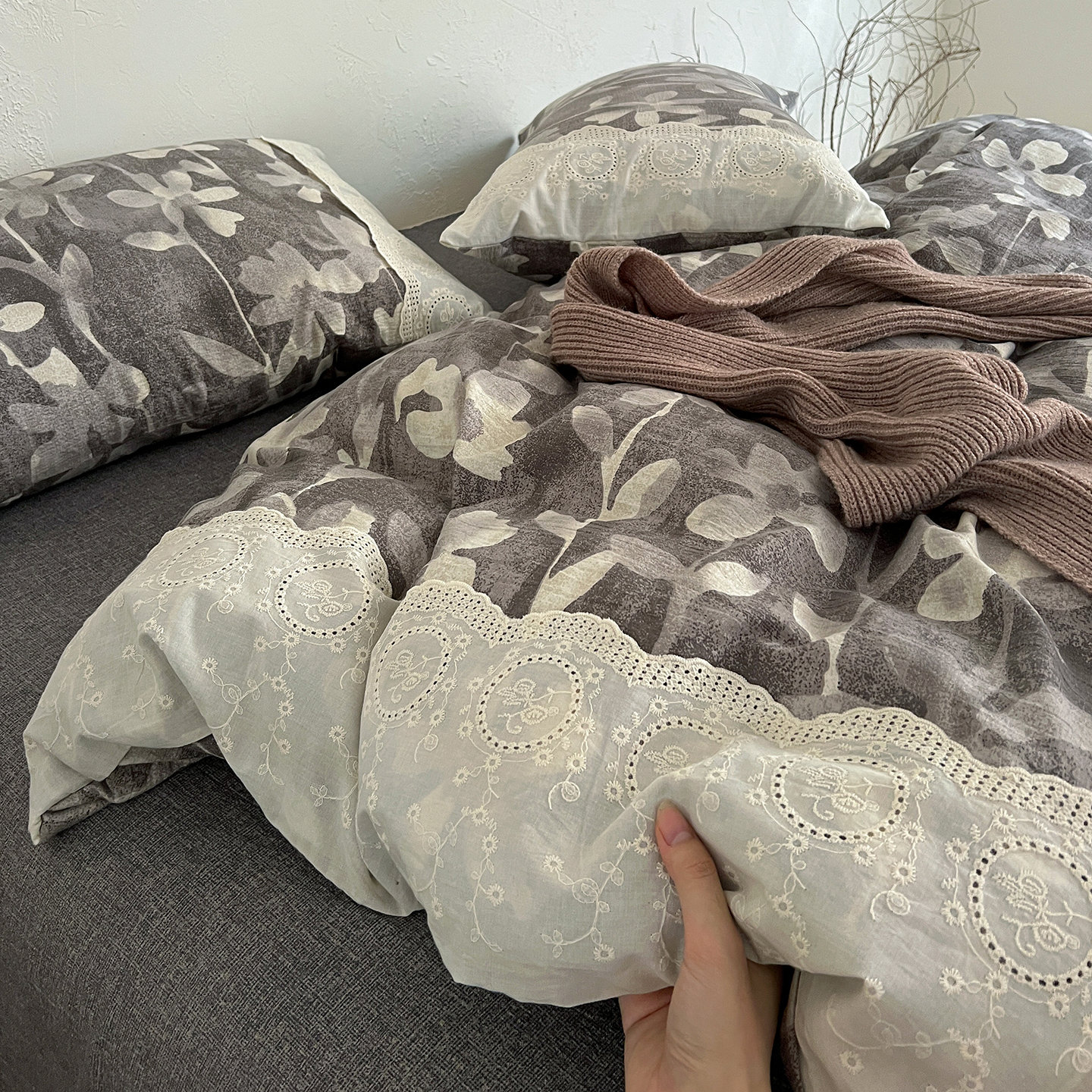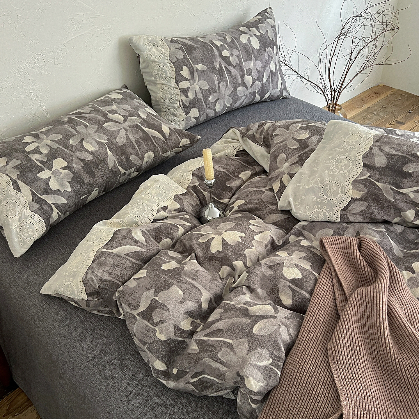 商品名称:一比一家纺 2025秋冬新品高克重原麻复古全棉花边棉麻侘寂风原麻四件套 (控价99元)花影灰