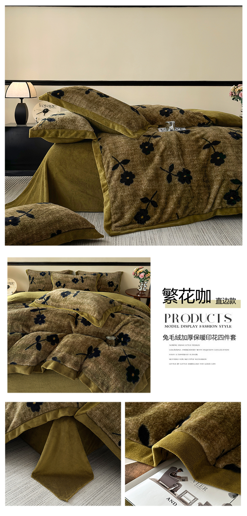 商品名称:金艾草 2025新款轻奢獭兔毛美拉德风印花拼角床单款四件套 繁花咖