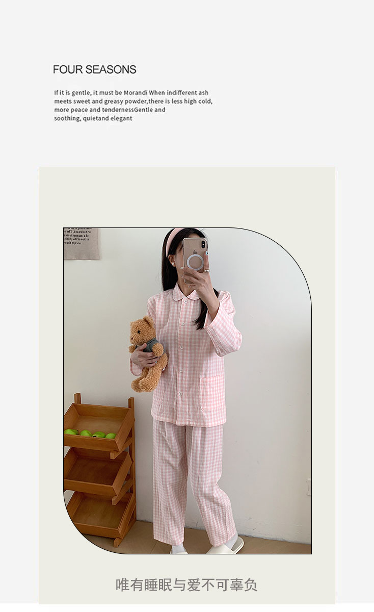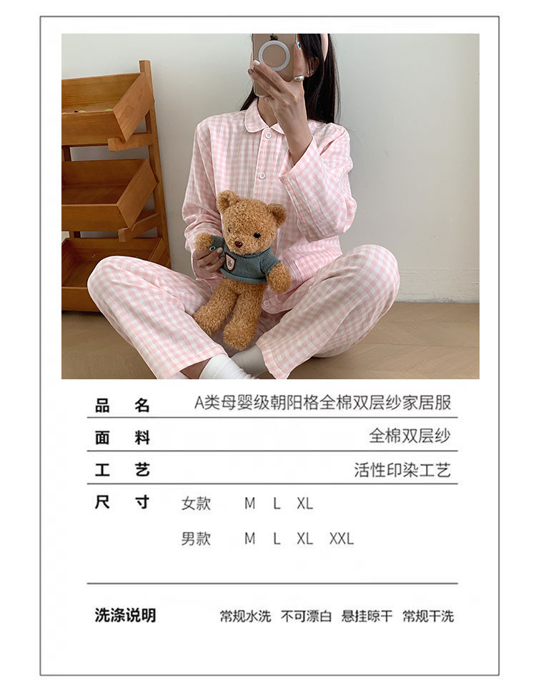 商品名称:观月轩家纺 2025新款A类母婴级朝阳格全棉双层纱家居服 灰小格