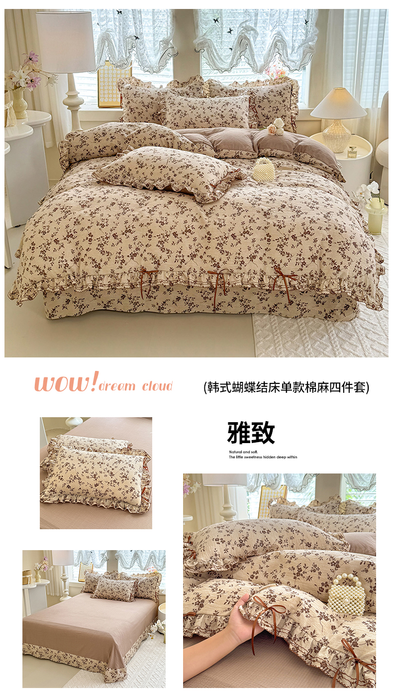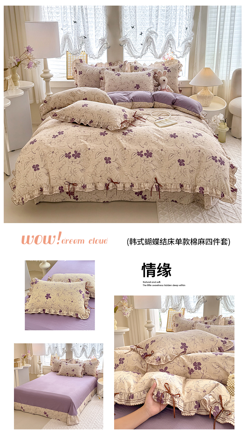 韩约家纺 2025新款1韩式蝴蝶结加厚床单款棉麻四件套 美布多