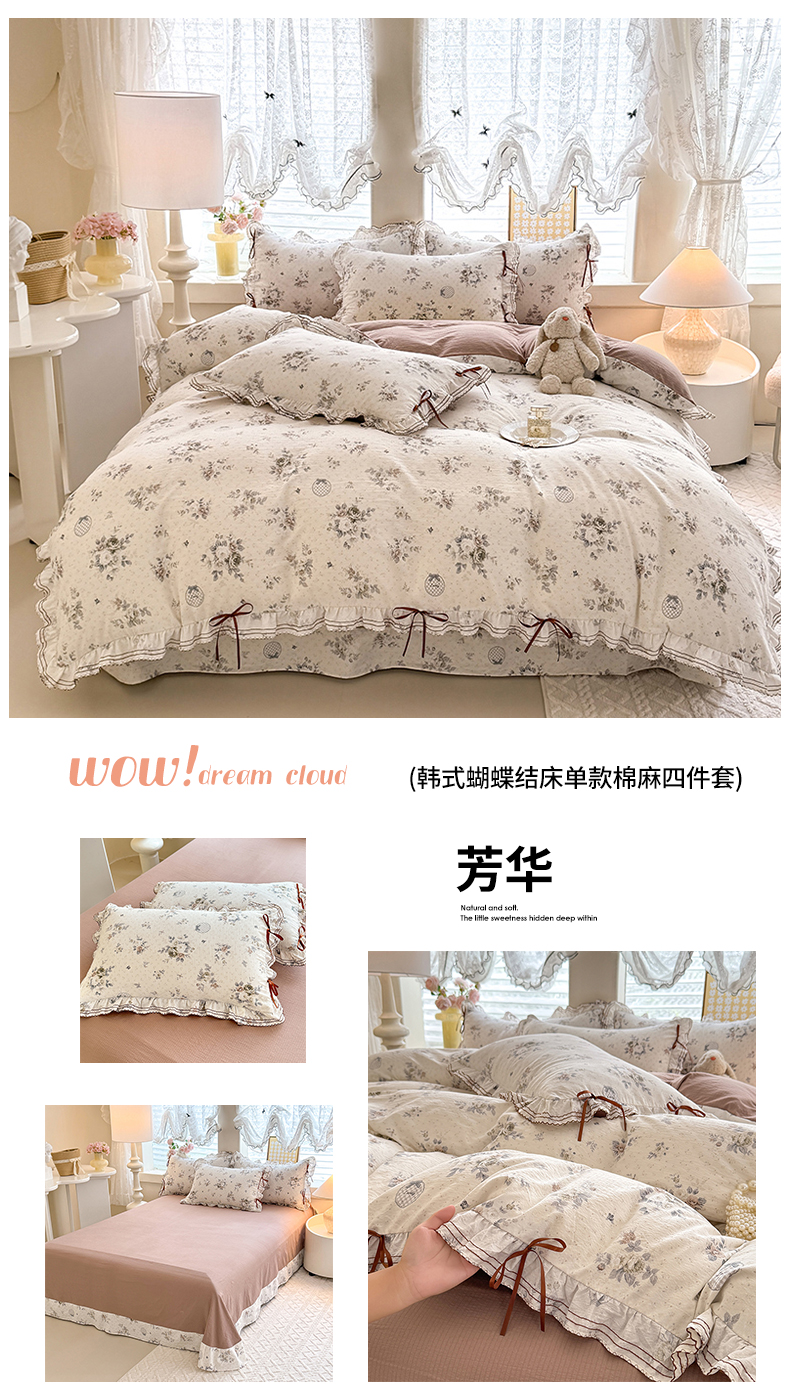 商品名称:韩约家纺 2025新款1韩式蝴蝶结加厚床单款棉麻四件套 美布多
