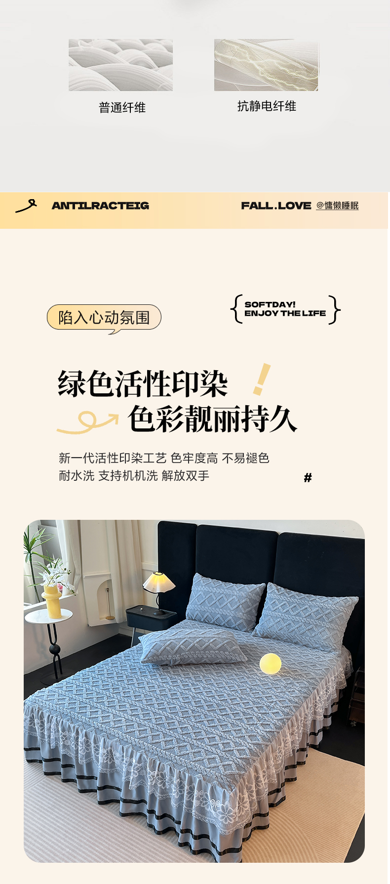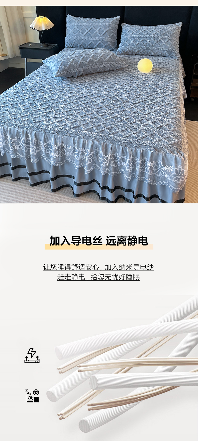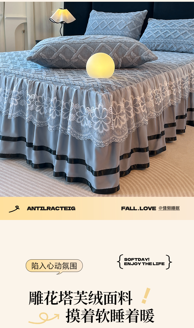 • 91家纺网 家纺一手货源 找家纺 米瑞娜  2025新款塔芙绒雕花蕾丝床裙跨境外贸 蓝灰