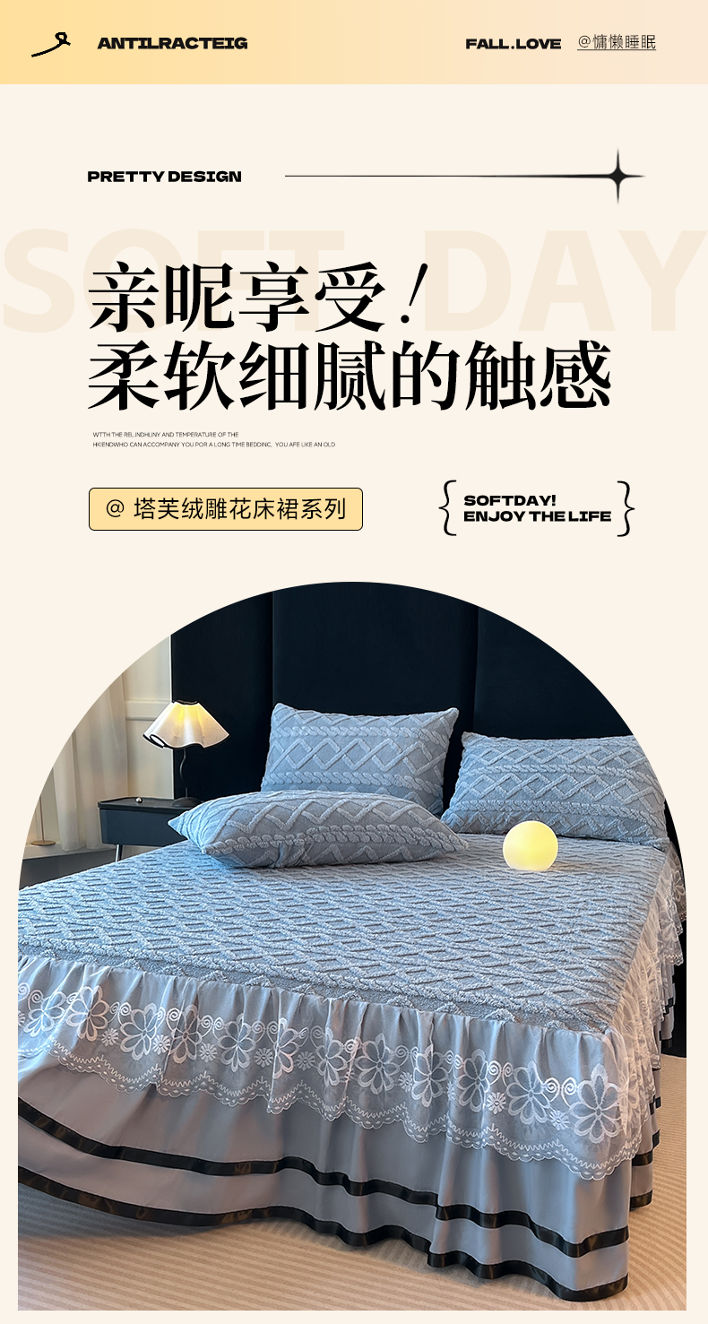 • 91家纺网 家纺一手货源 找家纺 (总)米瑞娜  2025新款塔芙绒雕花蕾丝床裙跨境外贸,白色,宝蓝,果绿,灰色,卡其,蓝灰,玫红,浅紫