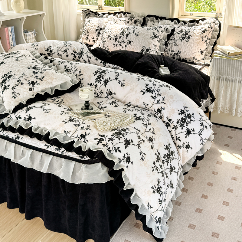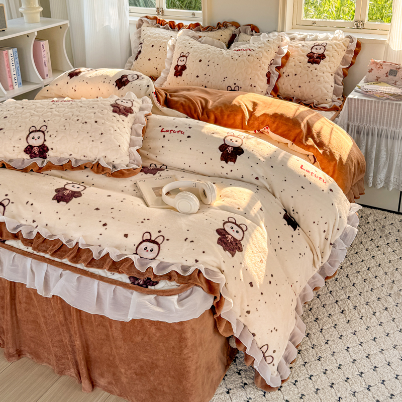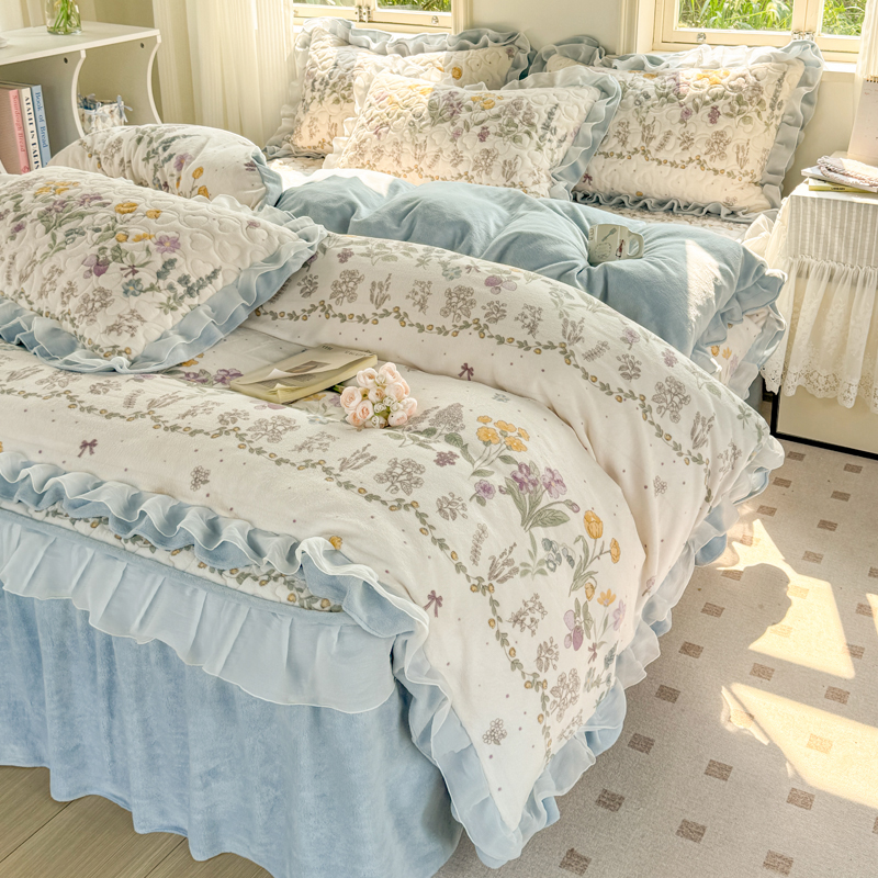 (总)禧缘家纺(原梦想家) 2025新款夹棉双层花边牛奶绒床笠三件套系列,布布乐园,步步生花,杏花微雨,雾都茶花,摩卡小镇,猫咪心事,浪漫花开,蓝铃风语,狗狗岛屿,落日云舒