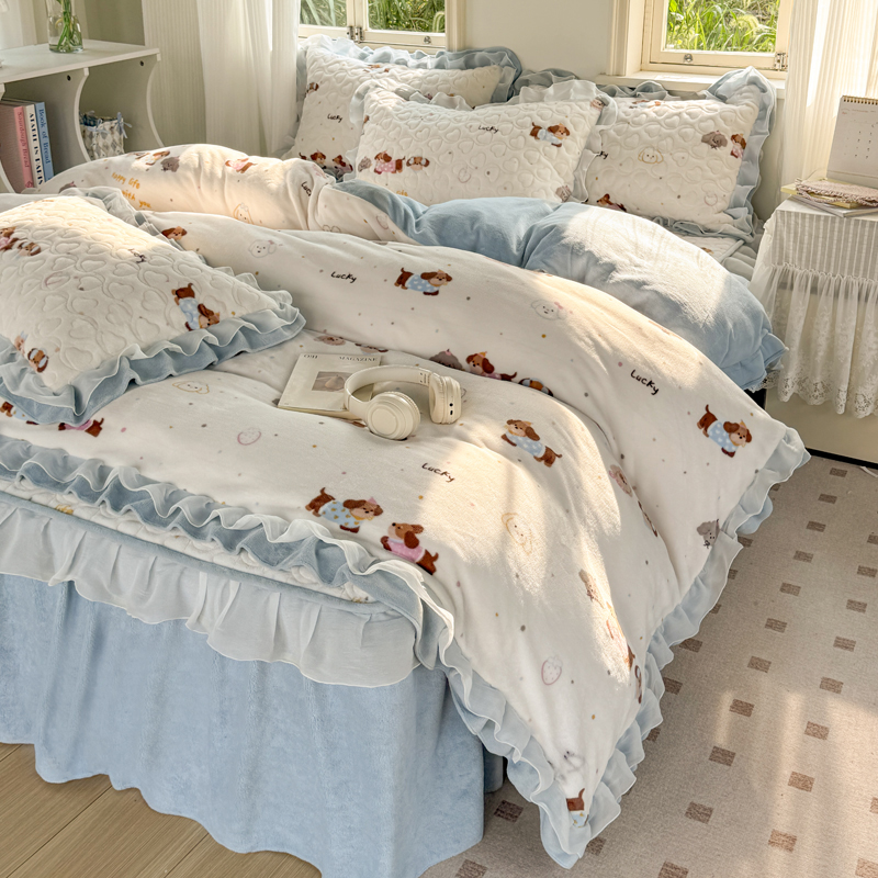 (总)禧缘家纺(原梦想家) 2025新款夹棉双层花边床笠牛奶绒系列四件套,布布乐园,步步生花,狗狗岛屿,蓝铃风语,浪漫花开,落日云舒,猫咪心事,摩卡小镇,雾都茶花,杏花微雨