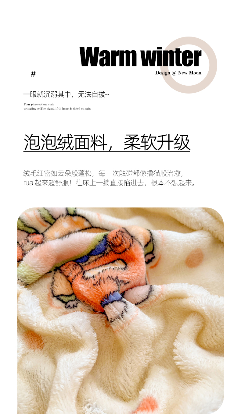 (总)慕梵家居 2024新款雪花绒四件套牛奶绒法莱绒套件,爱心兔,彩虹,草莓兔,繁花似锦,欢乐花朵,恐龙蓝,毛球,绅士熊,太空熊,泰迪熊,桃子少女,小波浪,小恐龙,小萝卜,小南瓜,心想事橙,星星熊,樱桃女孩,枝繁叶茂,字母熊