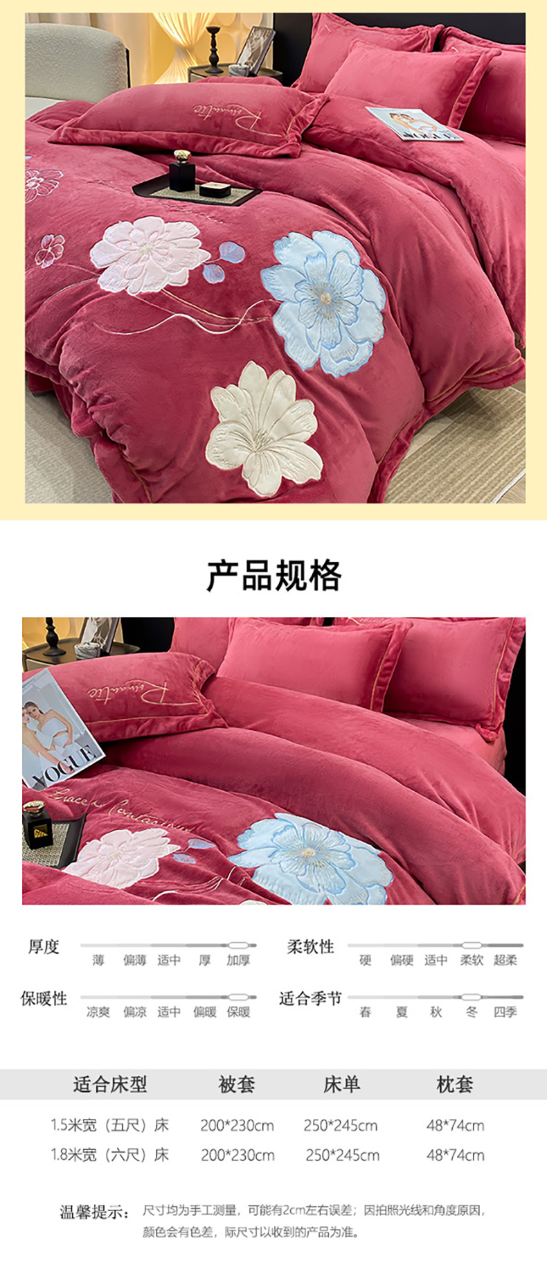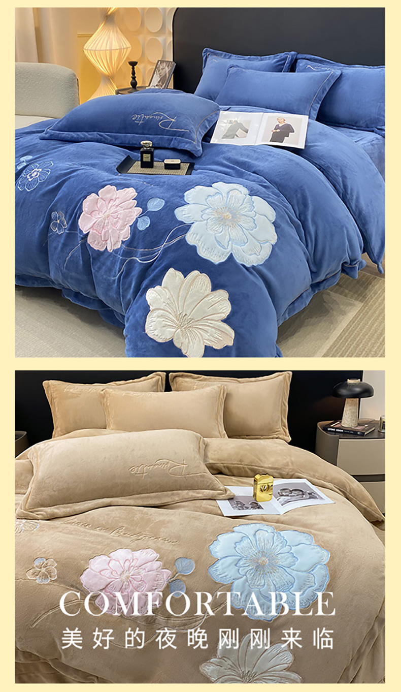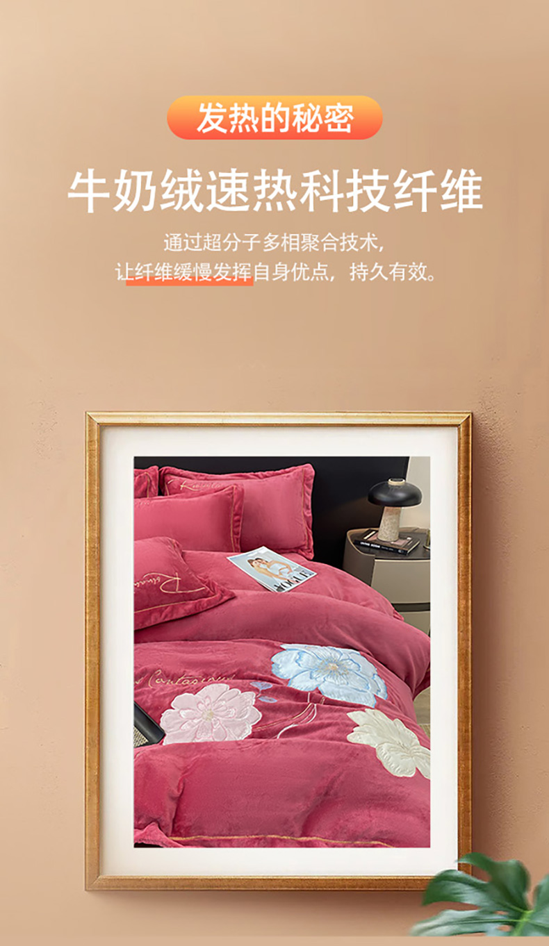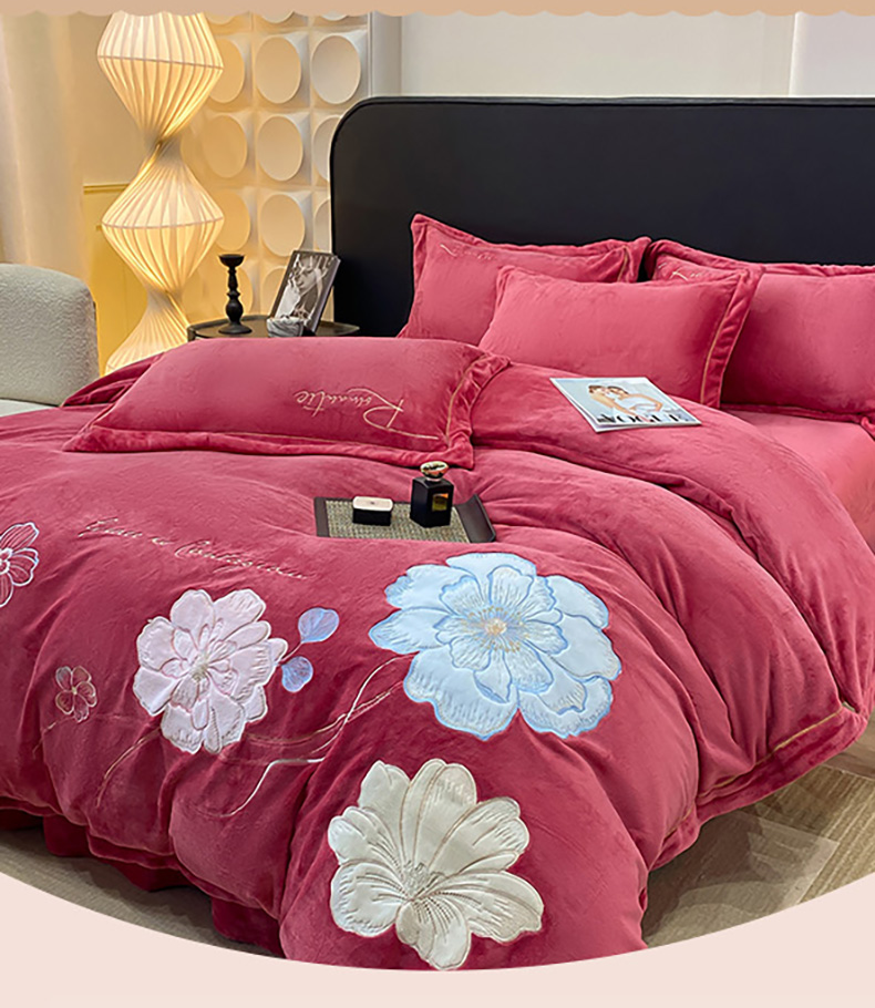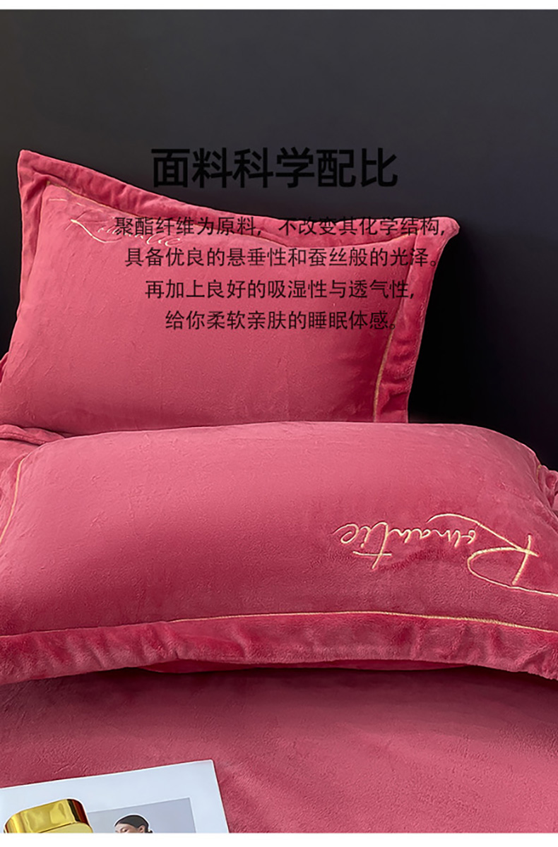商品名称:悦织湾家纺 2025新款9斤重牛奶绒四件套纯色贴布绣人件富贵系列240克重高密保暖轻奢时尚床上用品4件套 黛西-豆沙红
