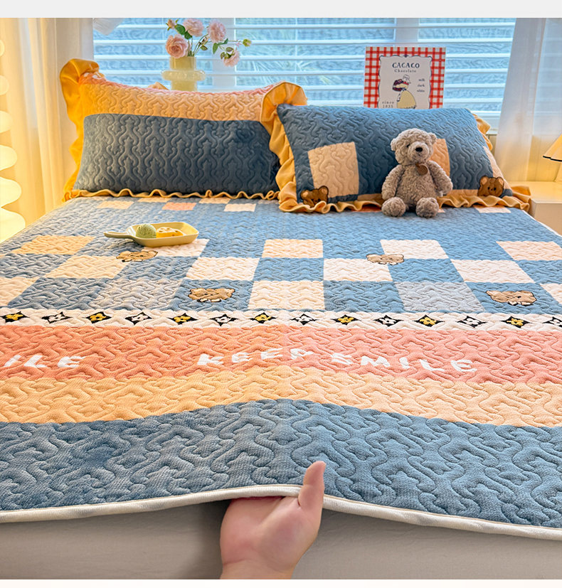 (总)美达家纺 2025新款高克重牛奶绒花边款夹棉床盖三件套,巴拉巴拉,格子萌熊,恐龙星球,梦蝶,时来运转,甜蜜奶吧,微笑熊,针织熊