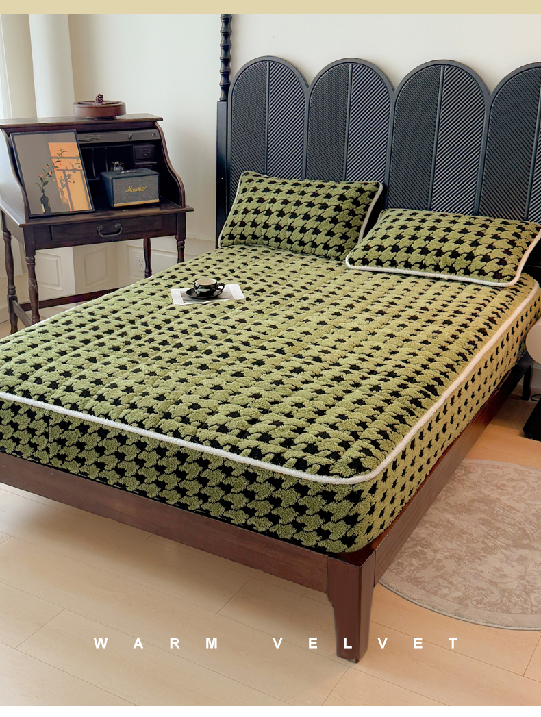 LIFE.丽芙 2025秋冬新款色纱提花舒棉绒加厚夹棉单床笠款床垫子保护套保暖床罩子三件套 千鸟格-草绿