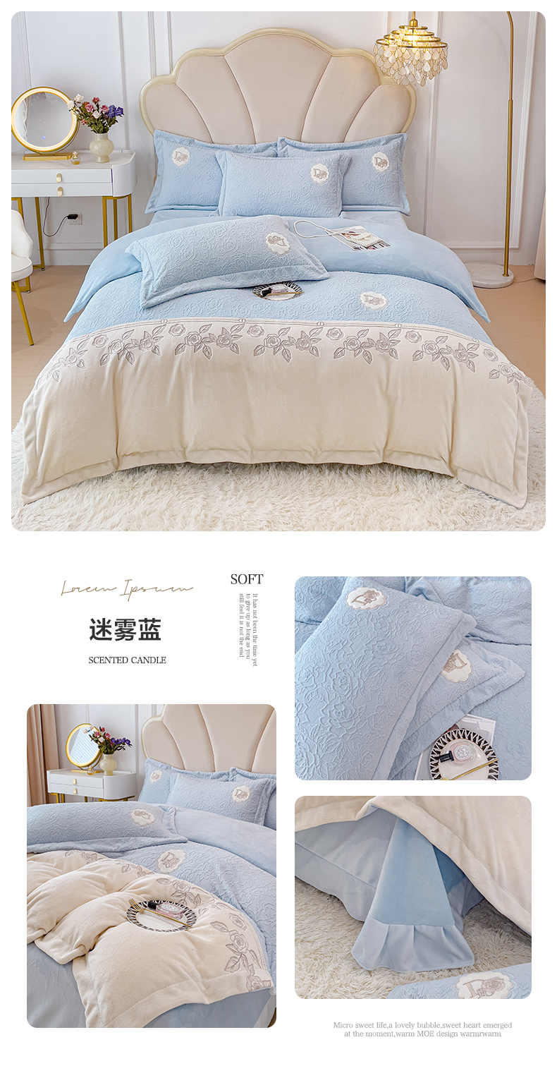 梵克保罗 2025秋冬新款牛奶绒雕花双拼拼接刺绣款四件套-维多利亚(含买家秀) 维多利亚-迷雾蓝