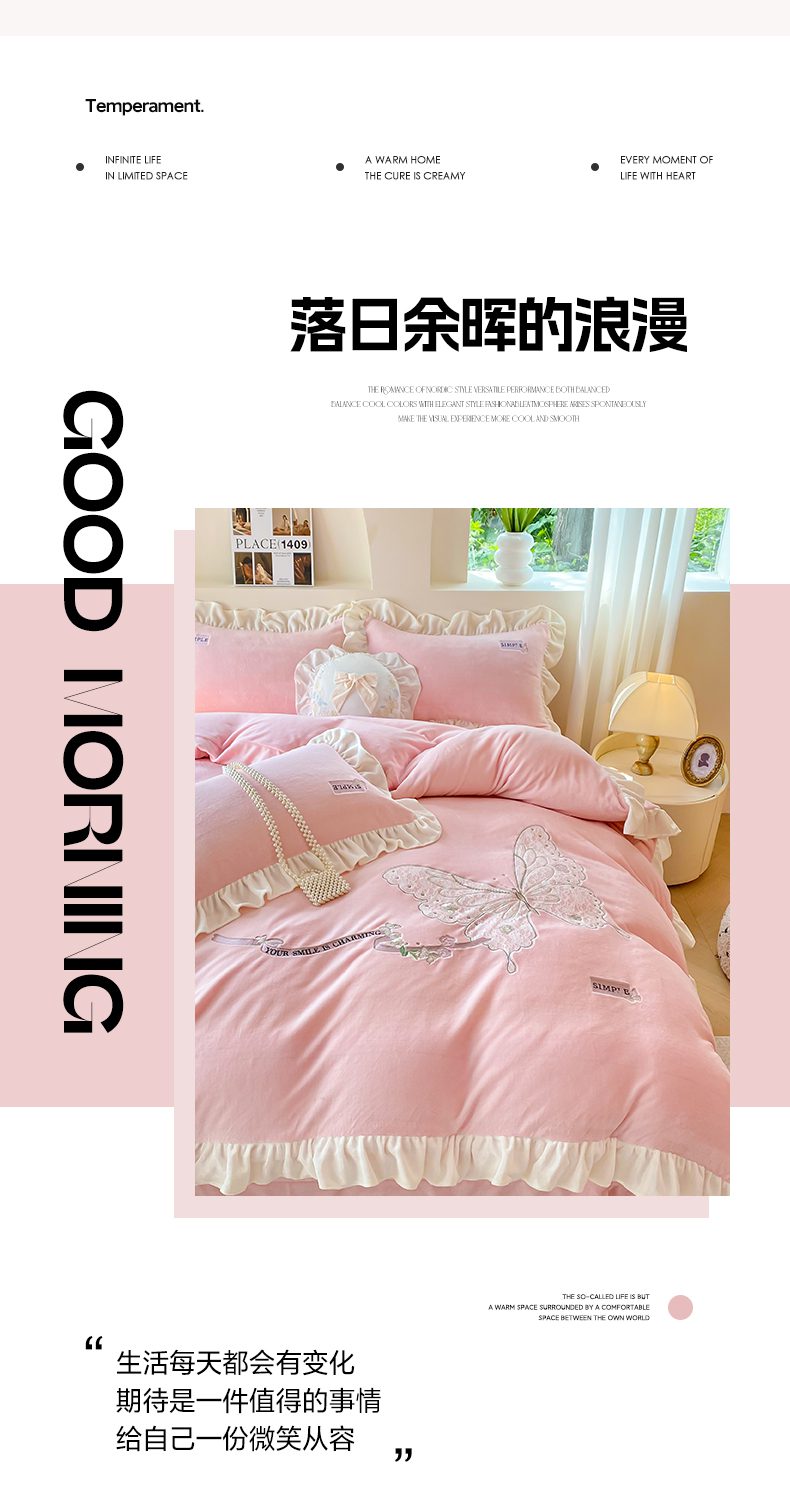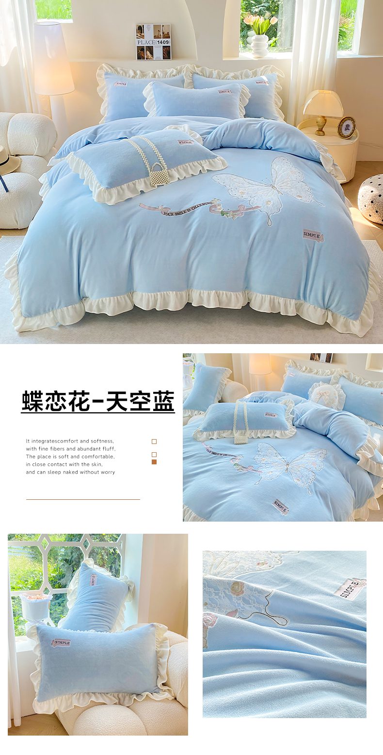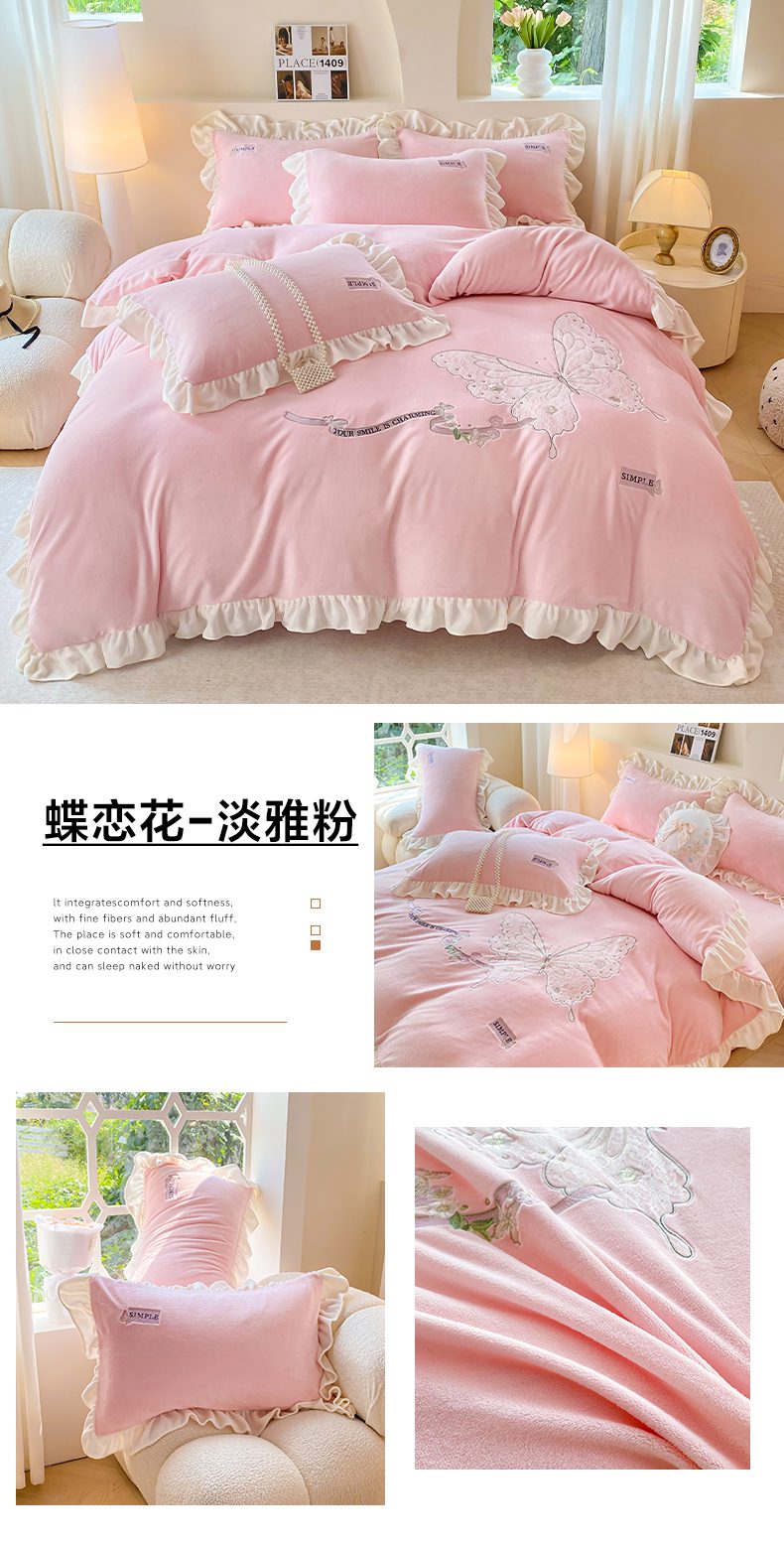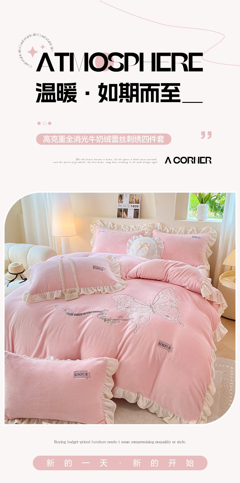 梵克保罗 2025新款高克重全消光牛奶绒蕾丝刺绣韩版花边四件套-蝶恋花(带无纺布包装) 柠檬黄