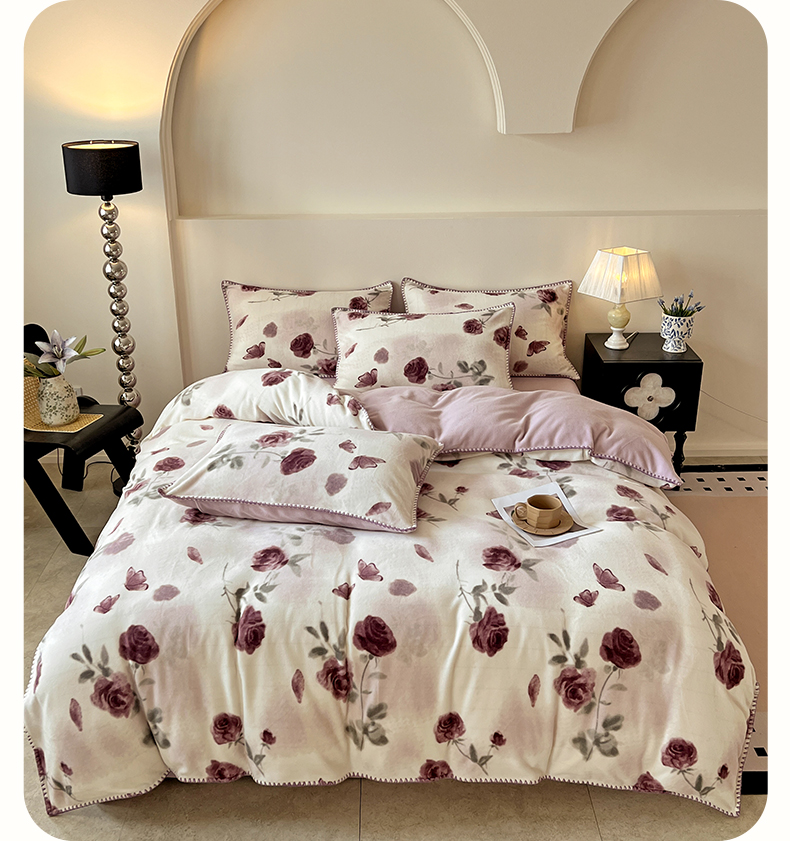 品乐家纺 2025秋冬新款糯米绒缇肤绒印花贝壳边四件套 素影-酒红
