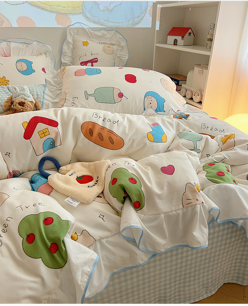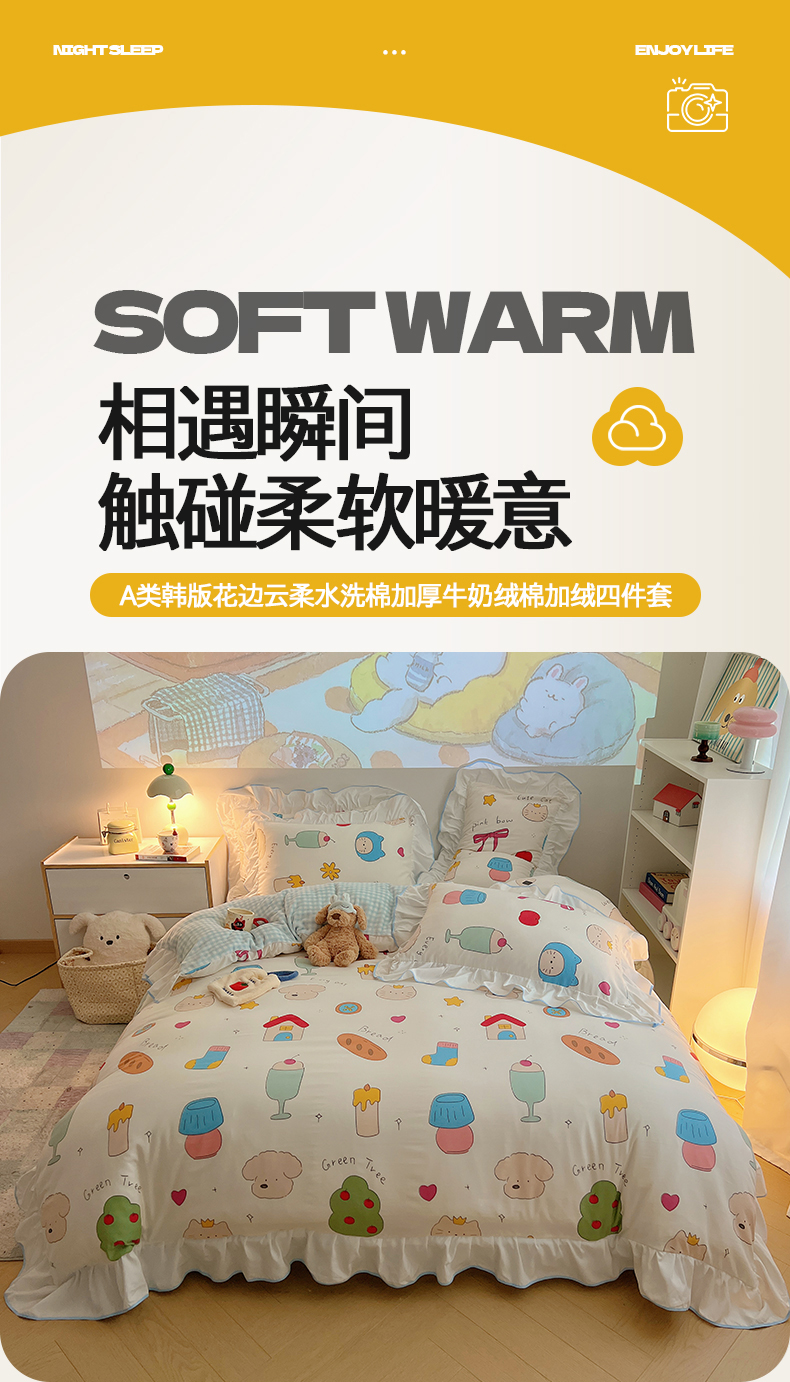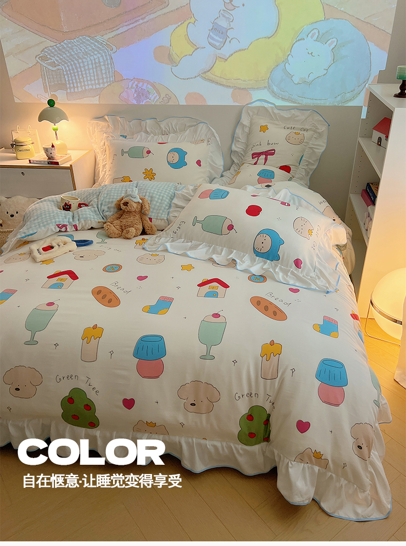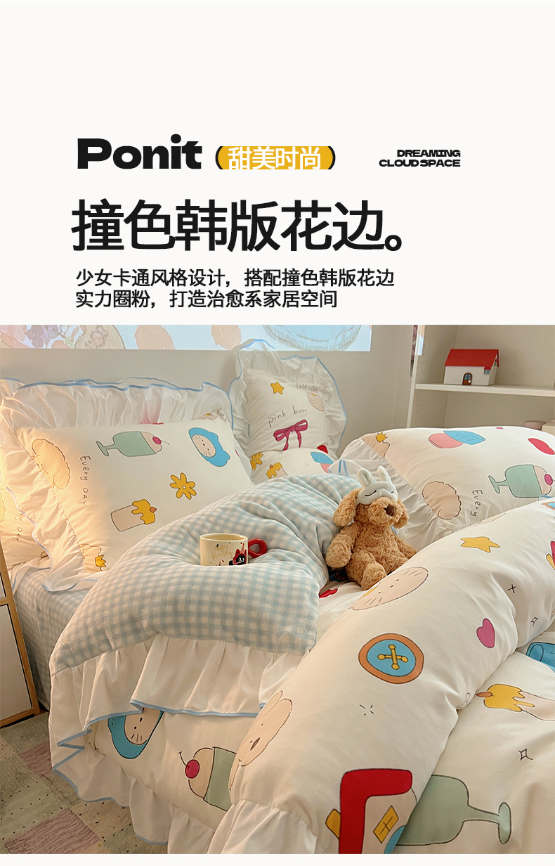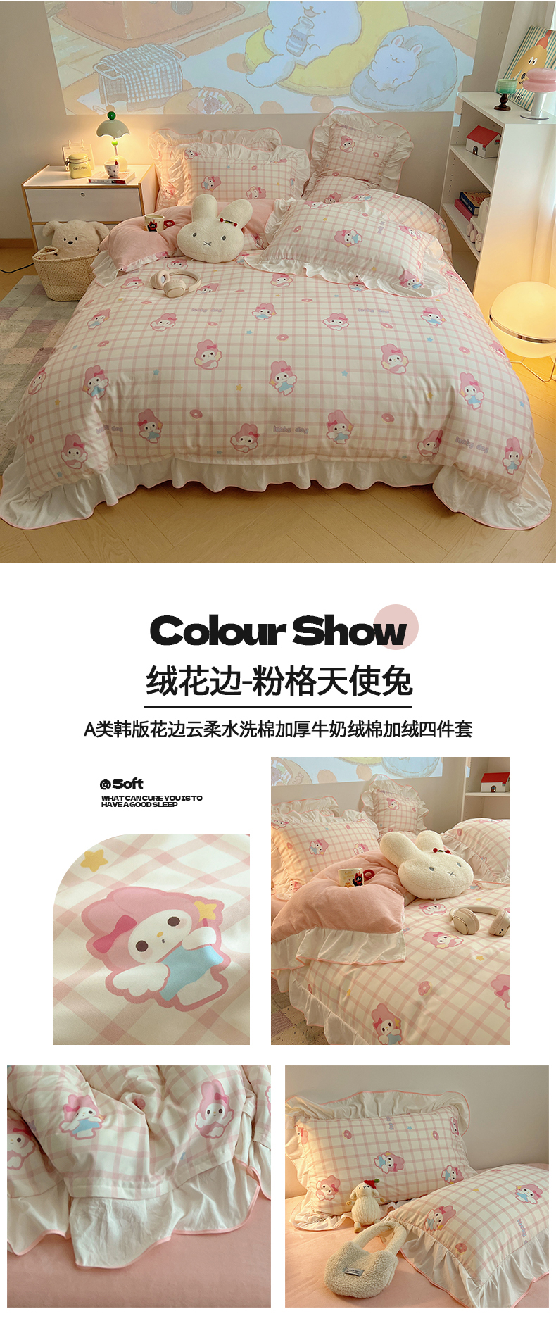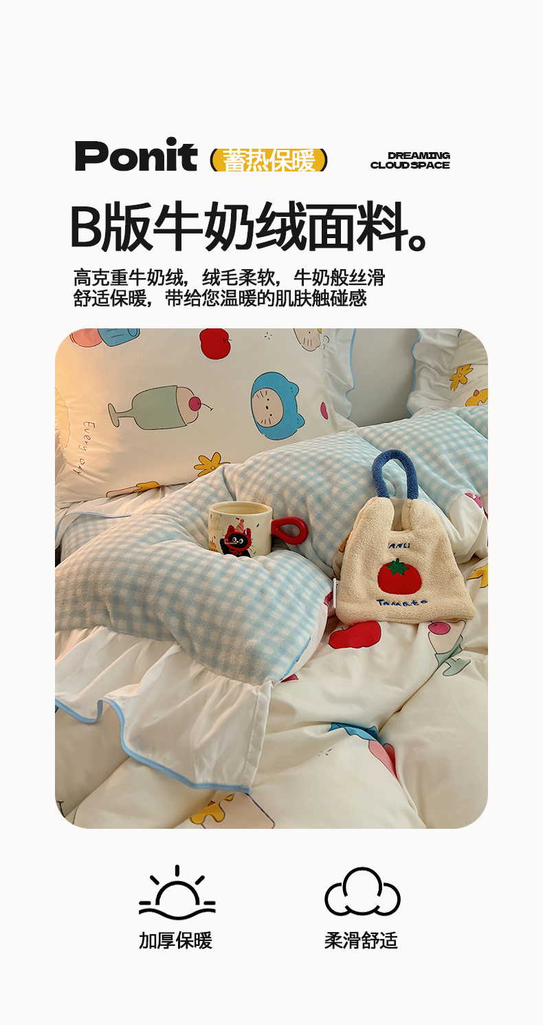 当前位置: 91家纺网 > 商品网购 > 床品套件 > 四件套 > 牛奶绒四件套 > 桃心家居 2025新款A类韩版花边撞色云柔水洗棉加厚牛奶绒少女猫咪棉绒四件套系列 绒花边-蓝蓝日记