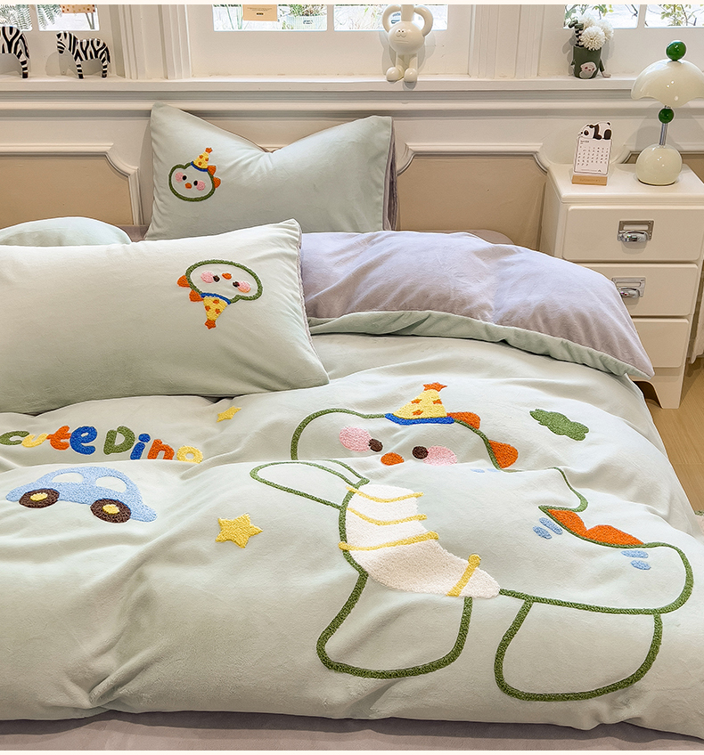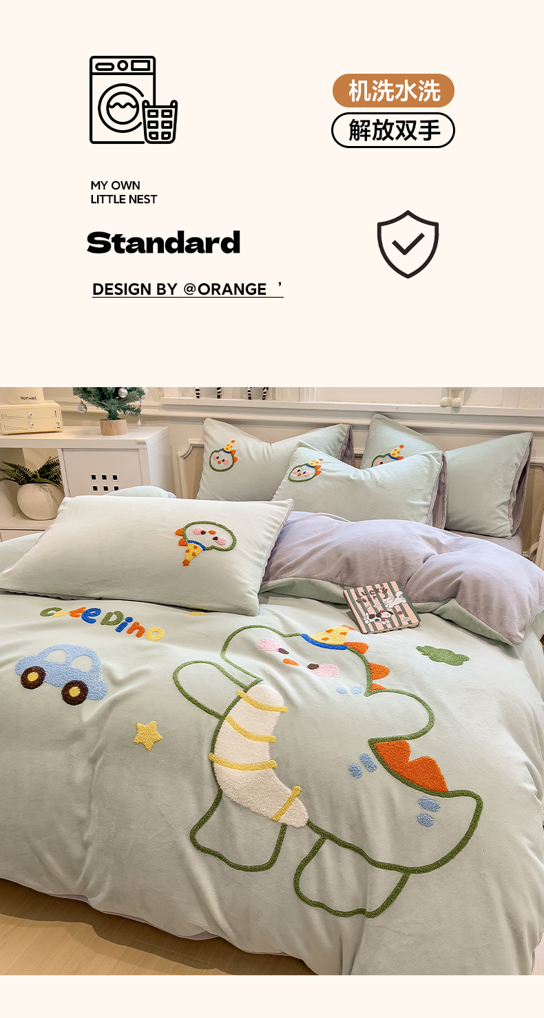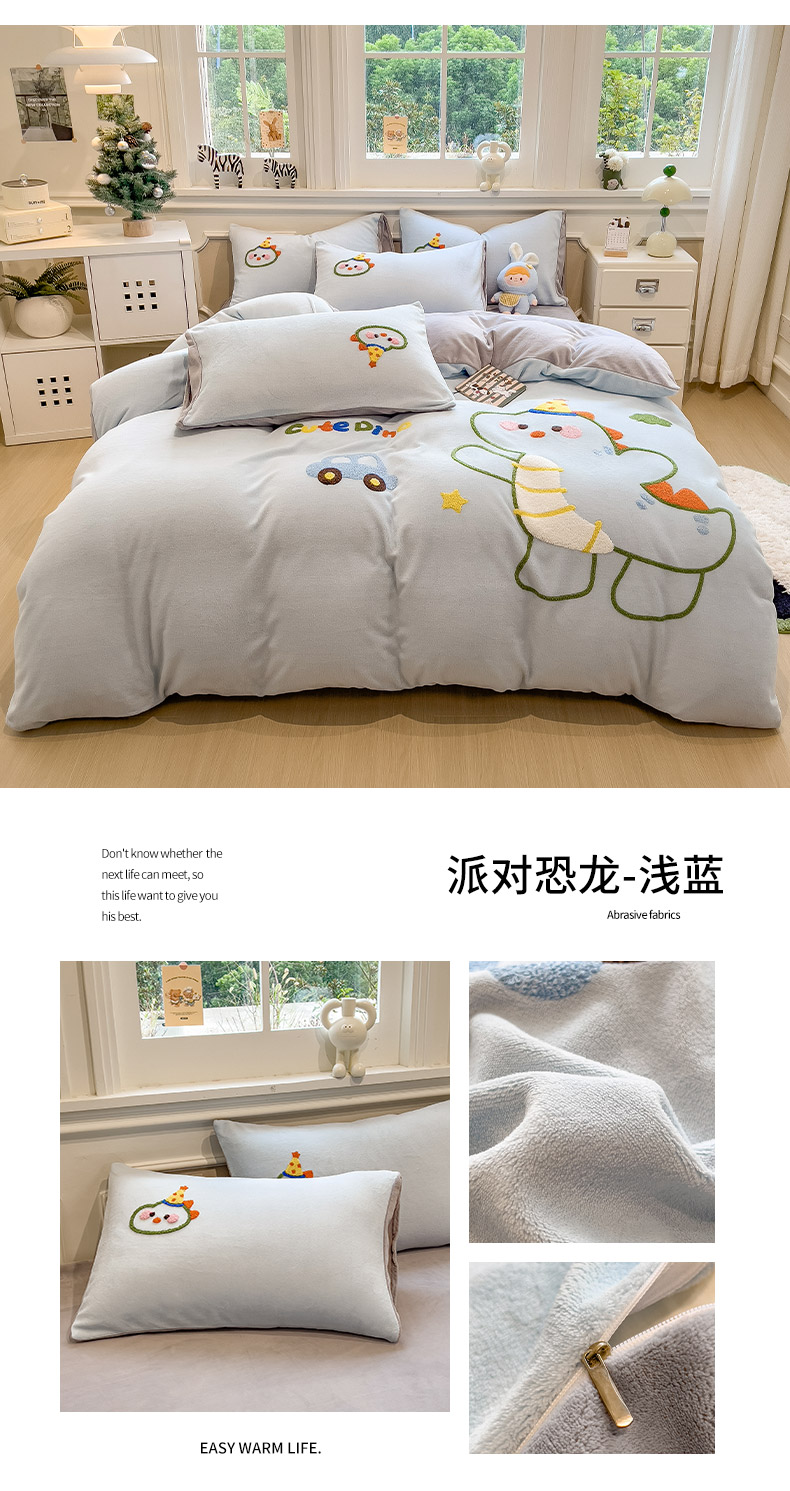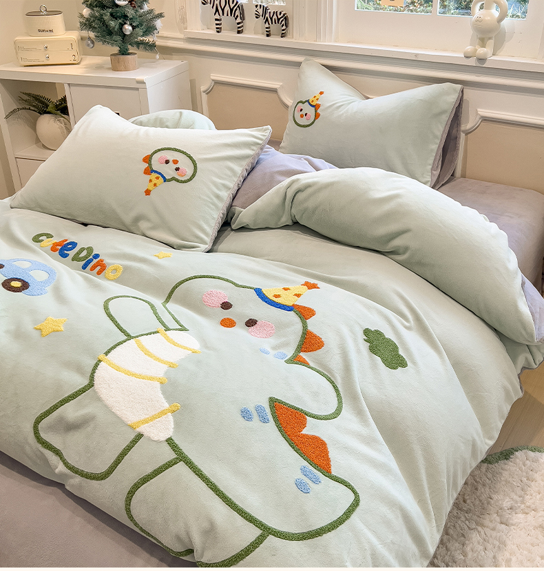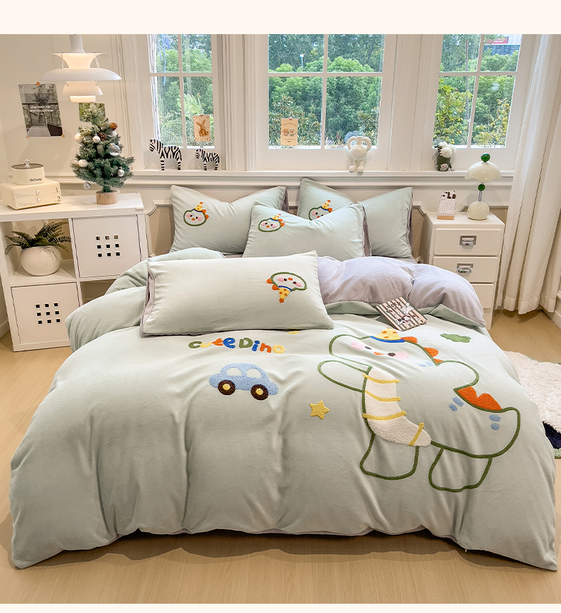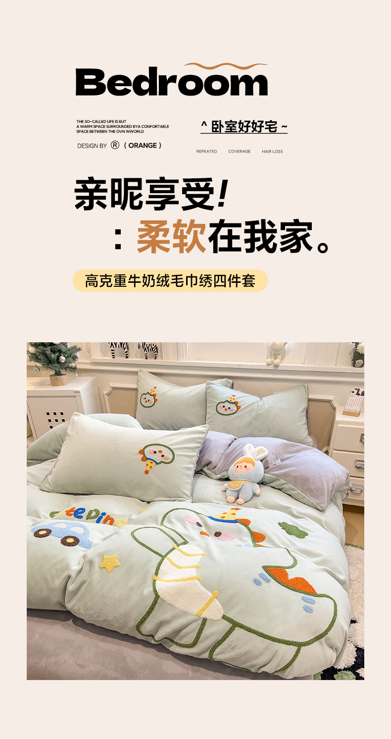 当前位置: 91家纺网 > 商品网购 > 床品套件 > 四件套 > 牛奶绒四件套 > 悦织语 2025新款加厚200克高克重毛巾绣牛奶绒四件套 派对恐龙-浅绿