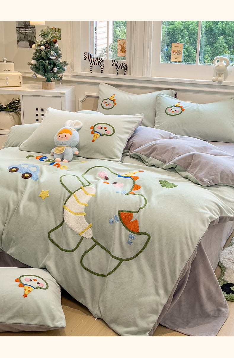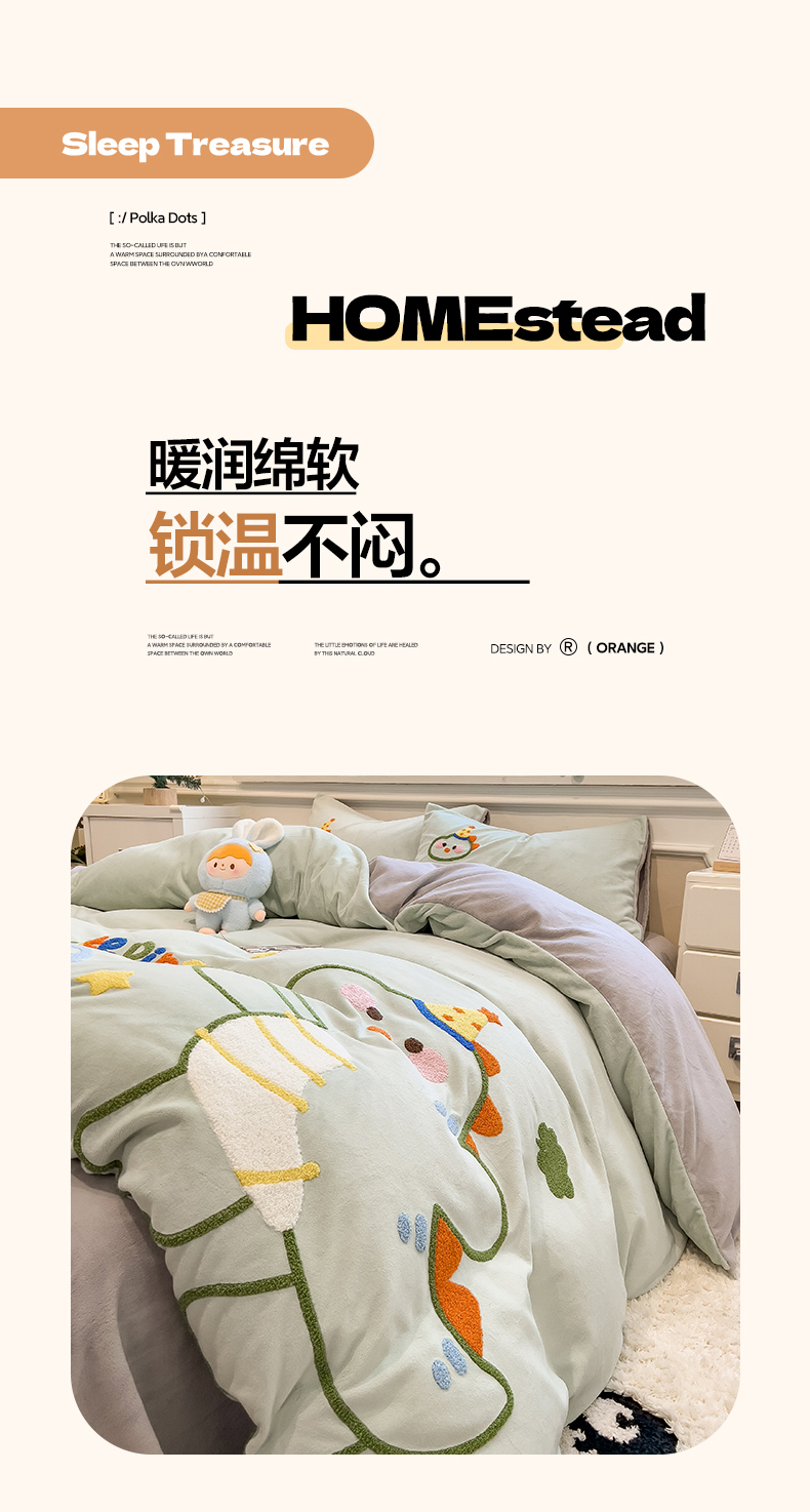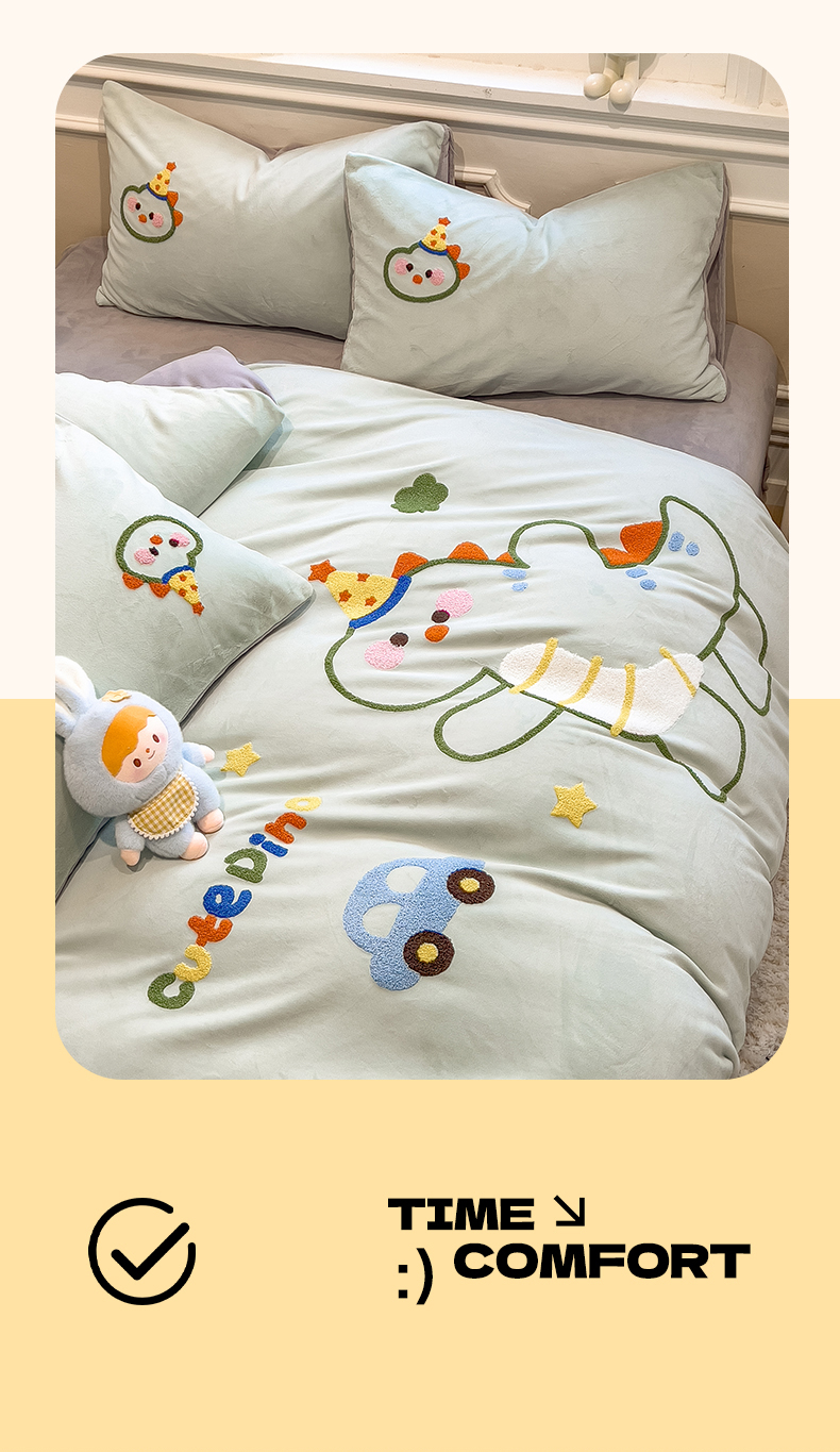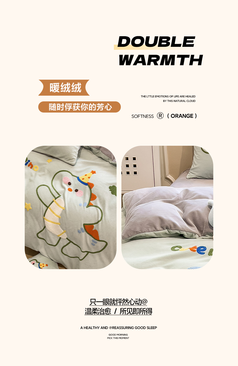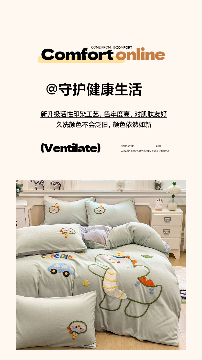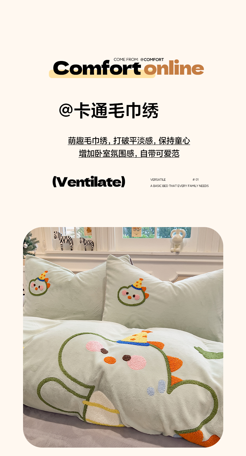 当前位置: 91家纺网 > 商品网购 > 床品套件 > 四件套 > 牛奶绒四件套 > 悦织语 2025新款加厚200克高克重毛巾绣牛奶绒四件套 派对恐龙-浅绿