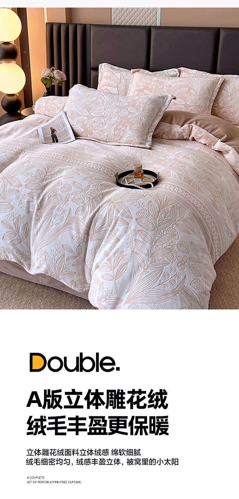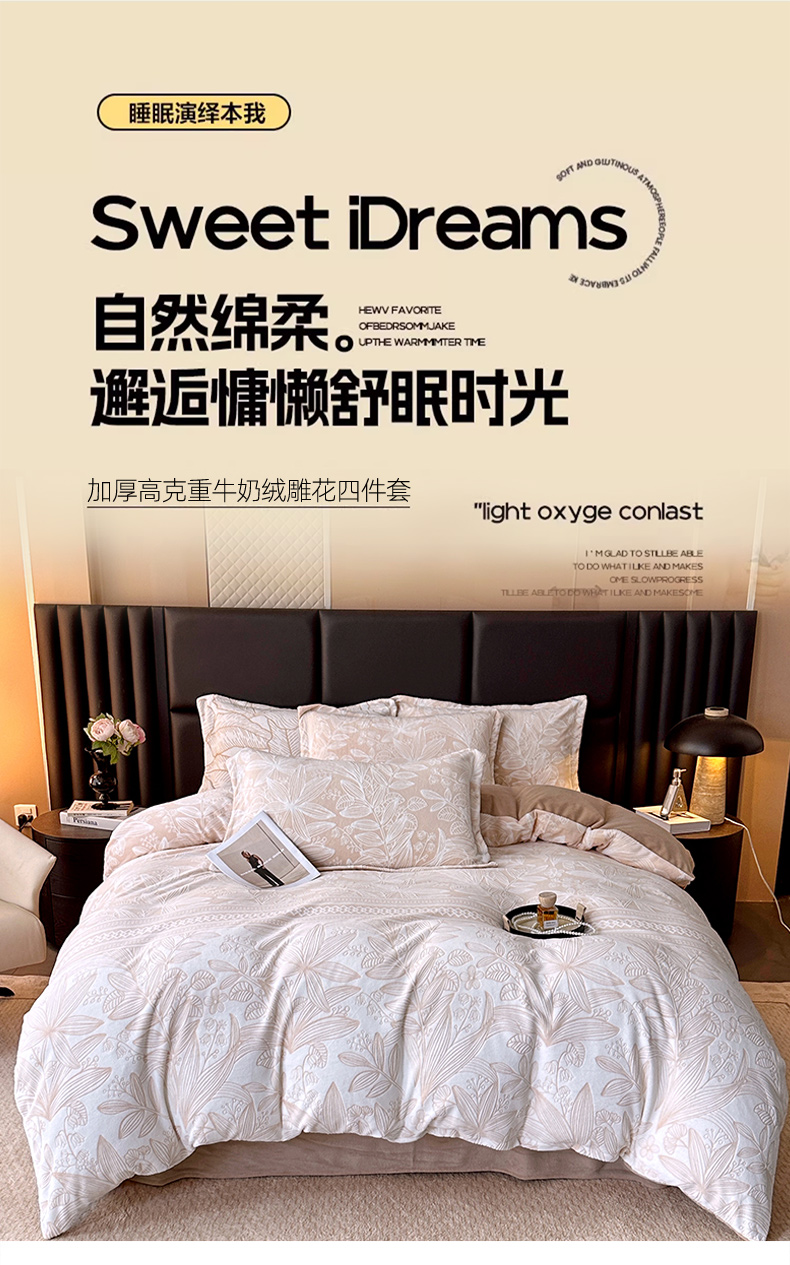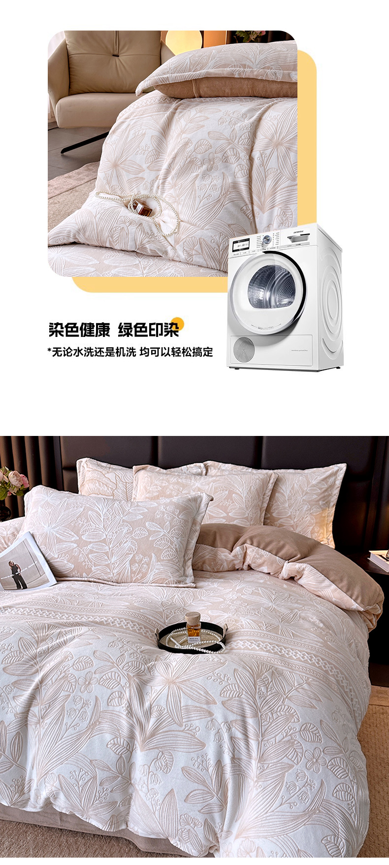 当前位置: 91家纺网 > 商品网购 > 床品套件 > 四件套 > 牛奶绒四件套 > 家贝爱 2025新款230克烂花雕花牛奶绒四件套 叶繁咖