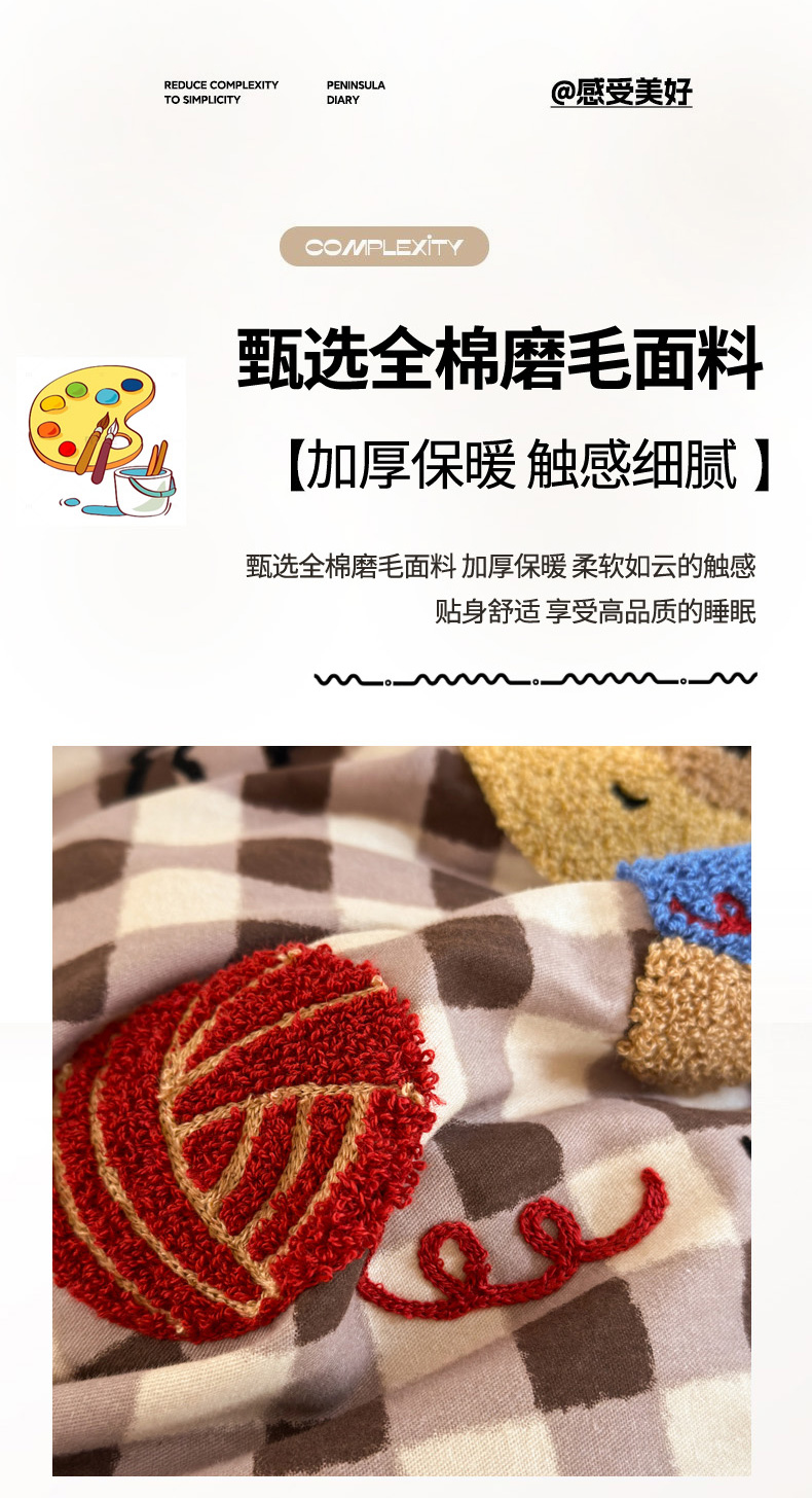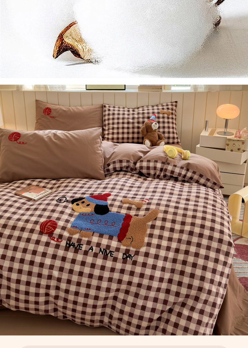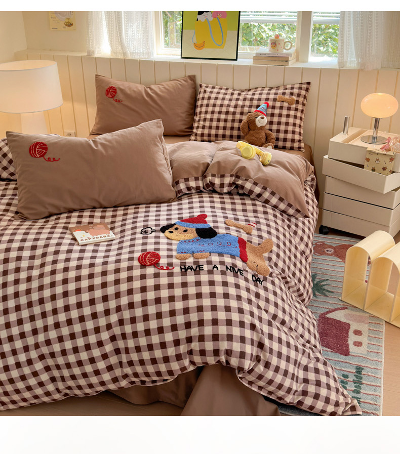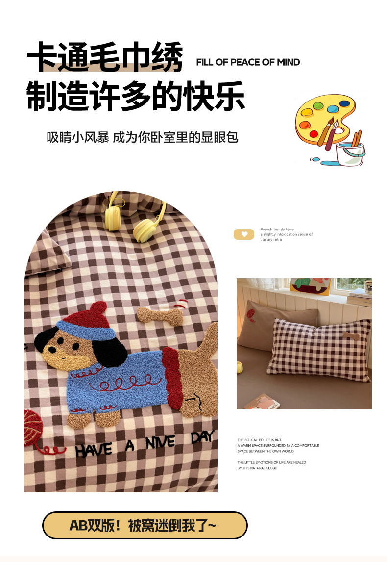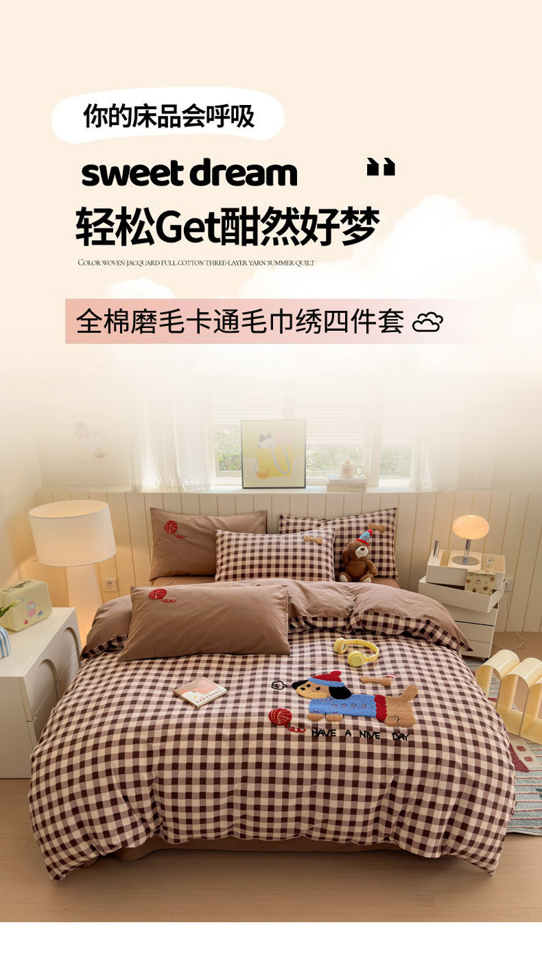 当前位置: 91家纺网 > 商品网购 > 床品套件 > 四件套 > 毛巾绣四件套 > 如意朵 2025新款全棉磨毛卡通毛巾绣四件套(专版花型)-场景二 毛线小狗