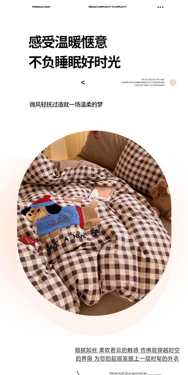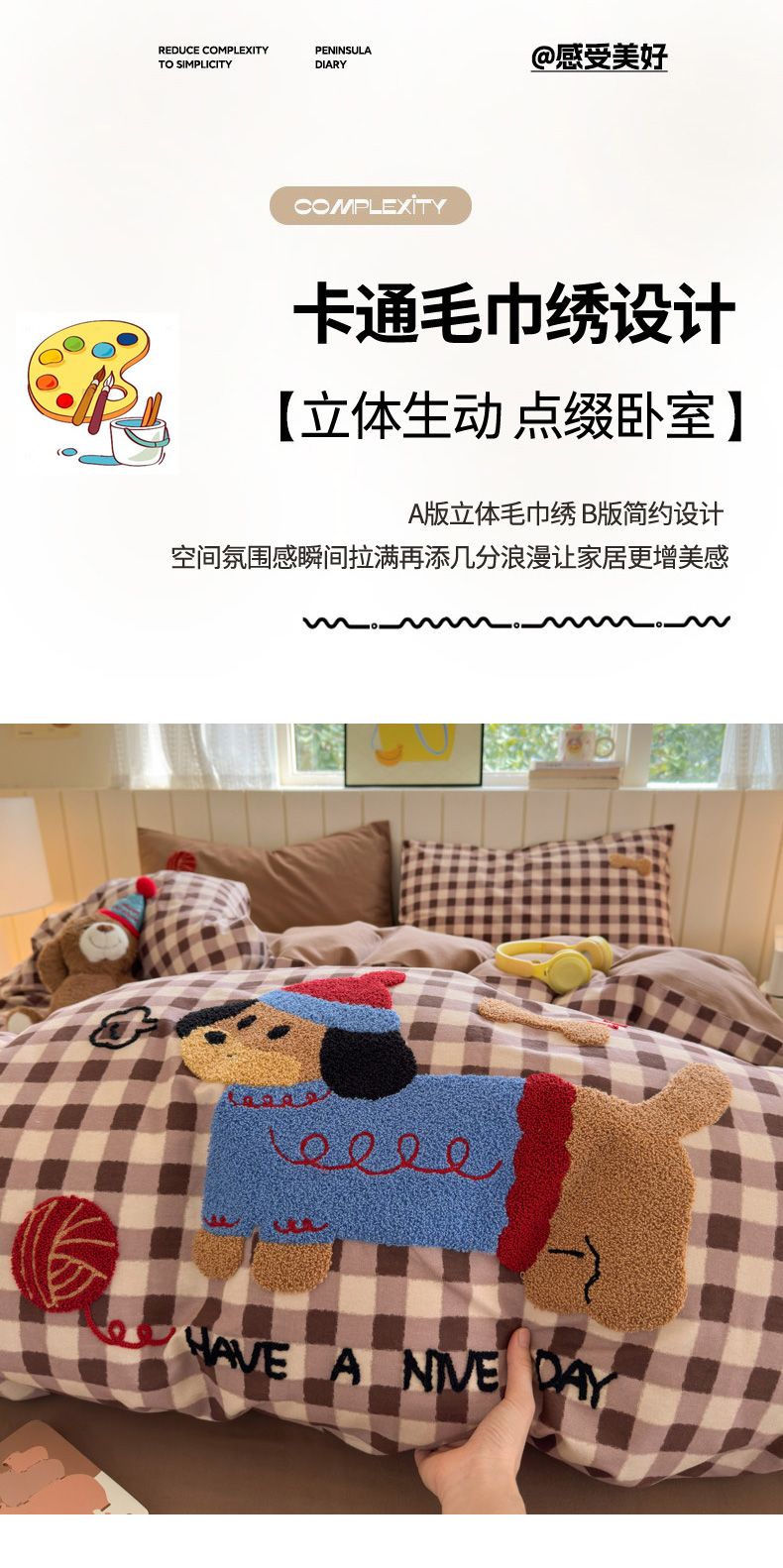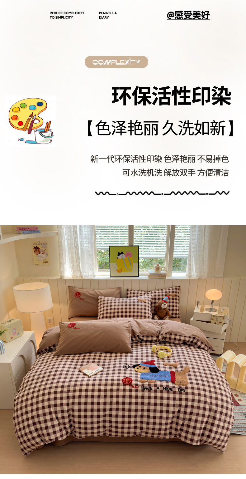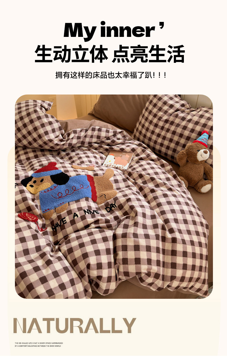 当前位置: 91家纺网 > 商品网购 > 床品套件 > 四件套 > 毛巾绣四件套 > 如意朵 2025新款全棉磨毛卡通毛巾绣四件套(专版花型)-场景二 毛线小狗
