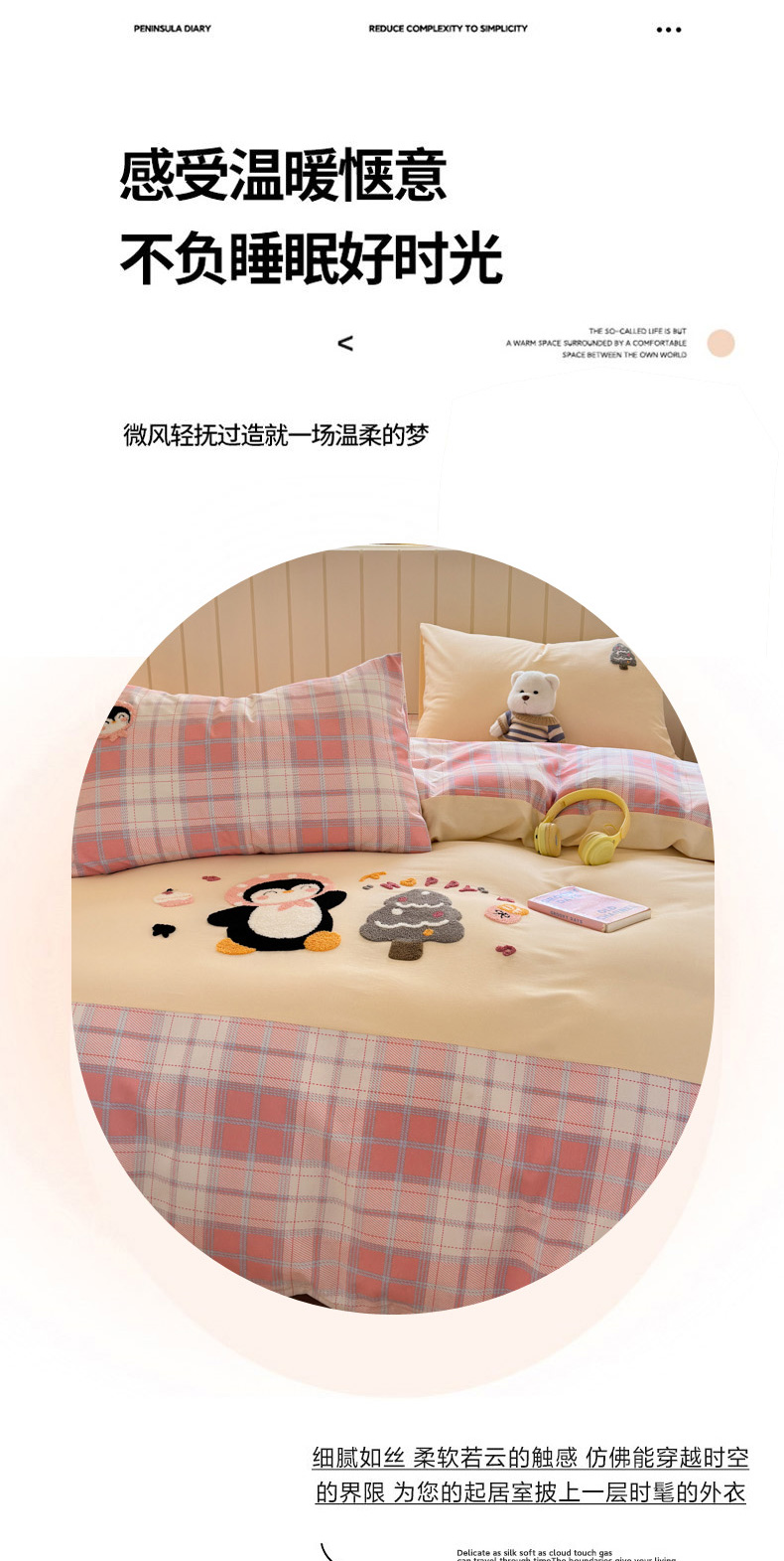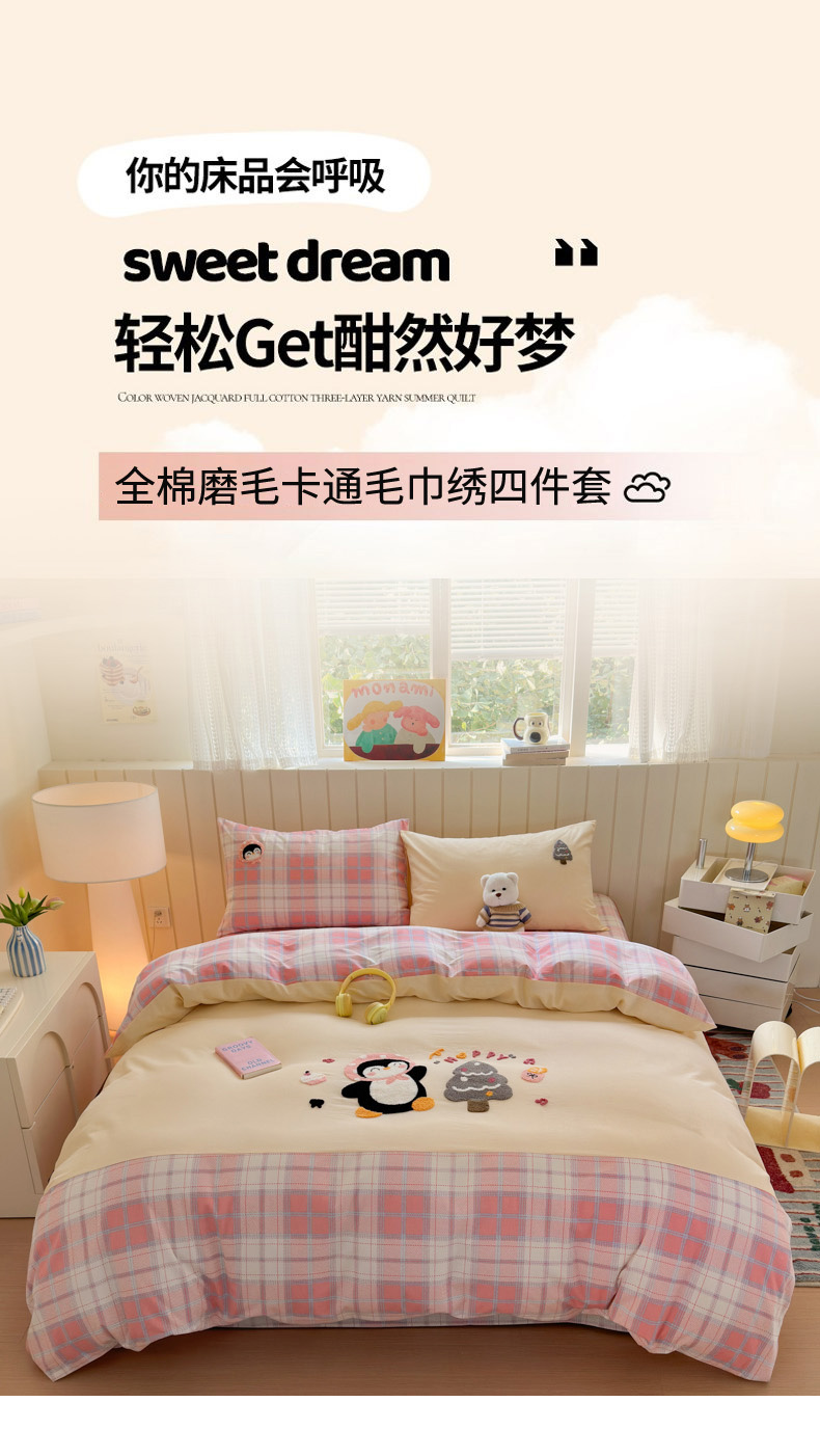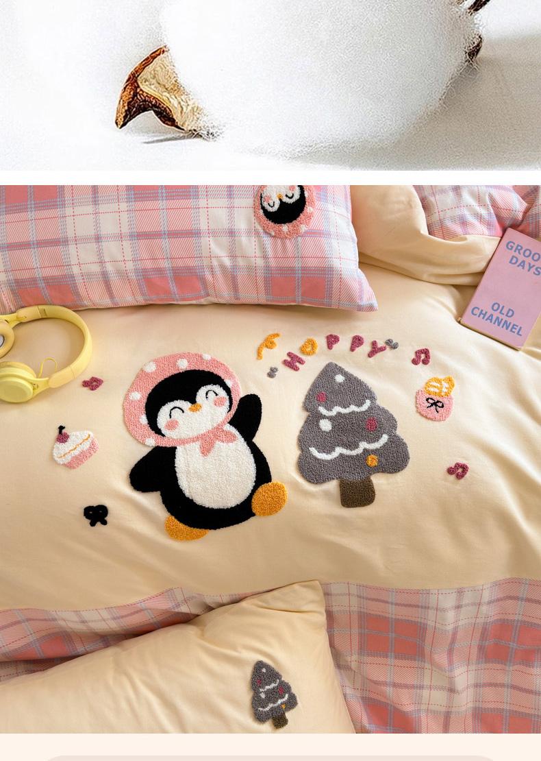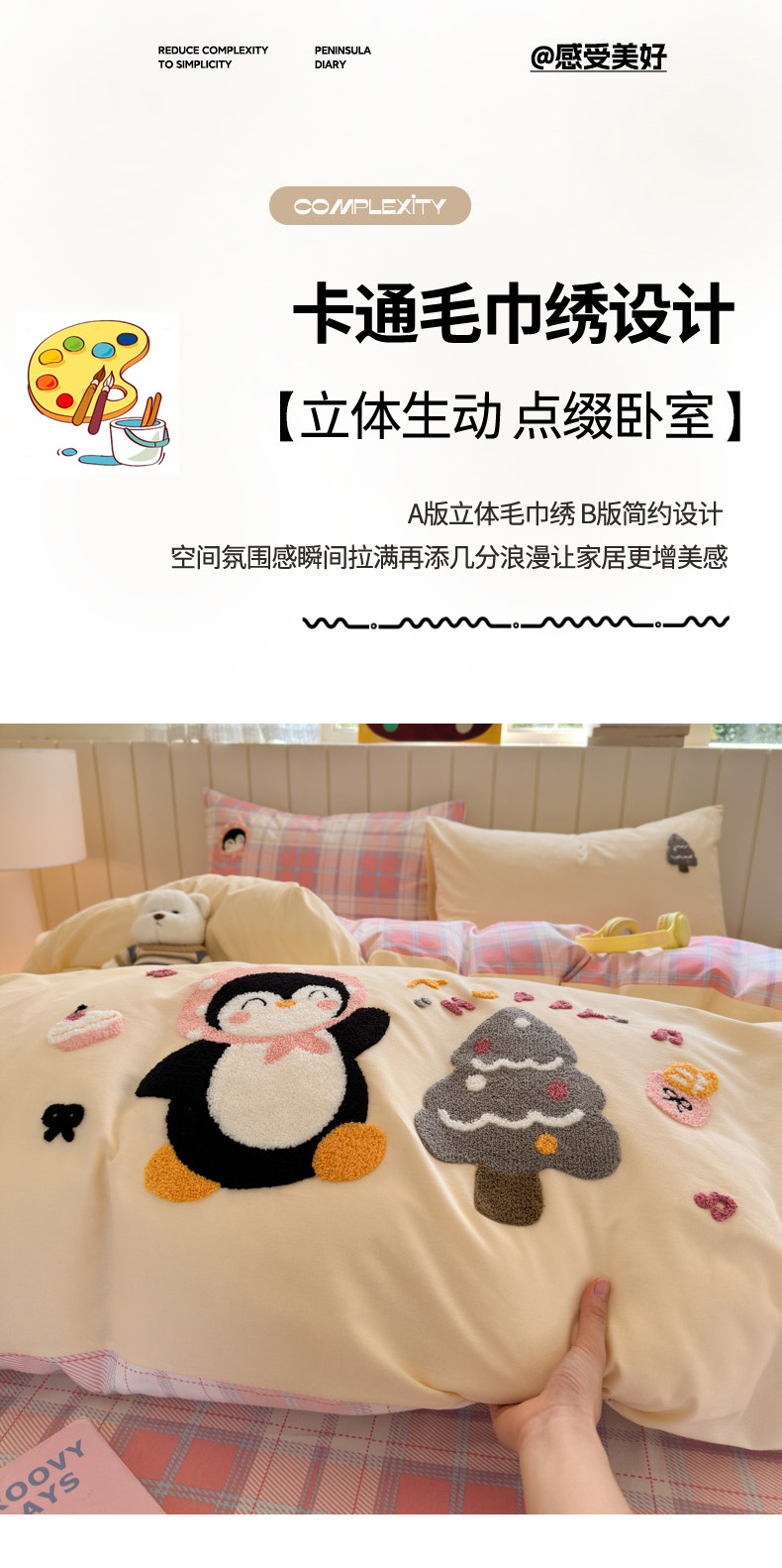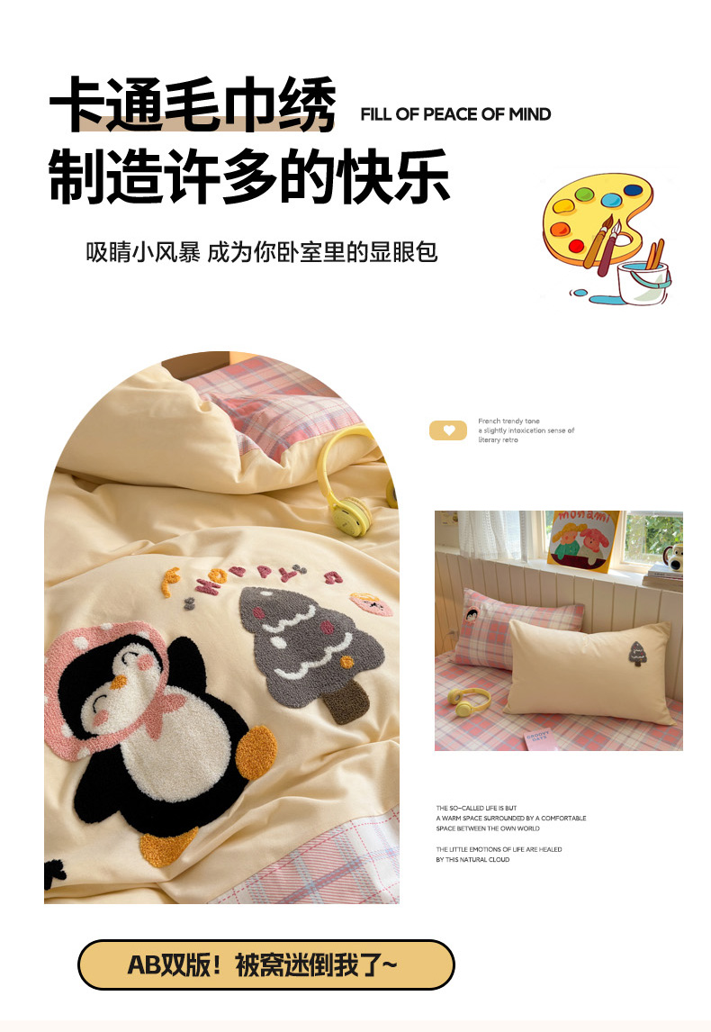 当前位置: 91家纺网 > 商品网购 > 床品套件 > 四件套 > 毛巾绣四件套 > 如意朵 2025新款全棉磨毛卡通毛巾绣四件套(专版花型)-场景二 音乐企鹅