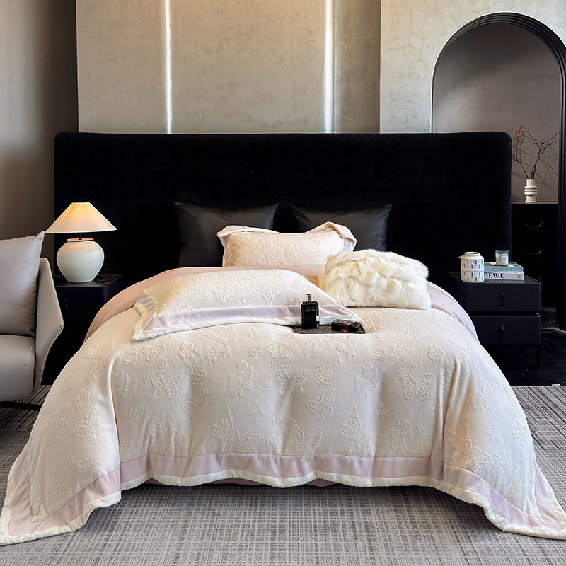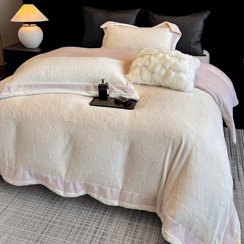 商品名称:若未家居 LOVEWE HOUSE 2025新款250克全消光纯色蝴蝶雕花双拼牛奶绒四件套-晨光蝶影 光蝶影-奶白