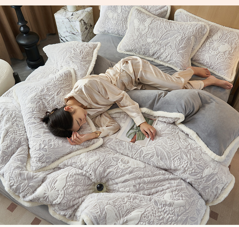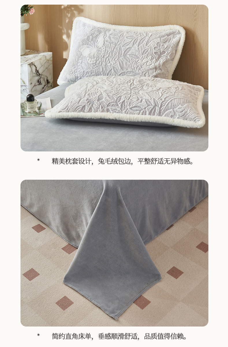商品名称:金鹰 2025新款A类兔毛绒烂花四件套加厚牛奶绒四件套 蝶恋-灰色