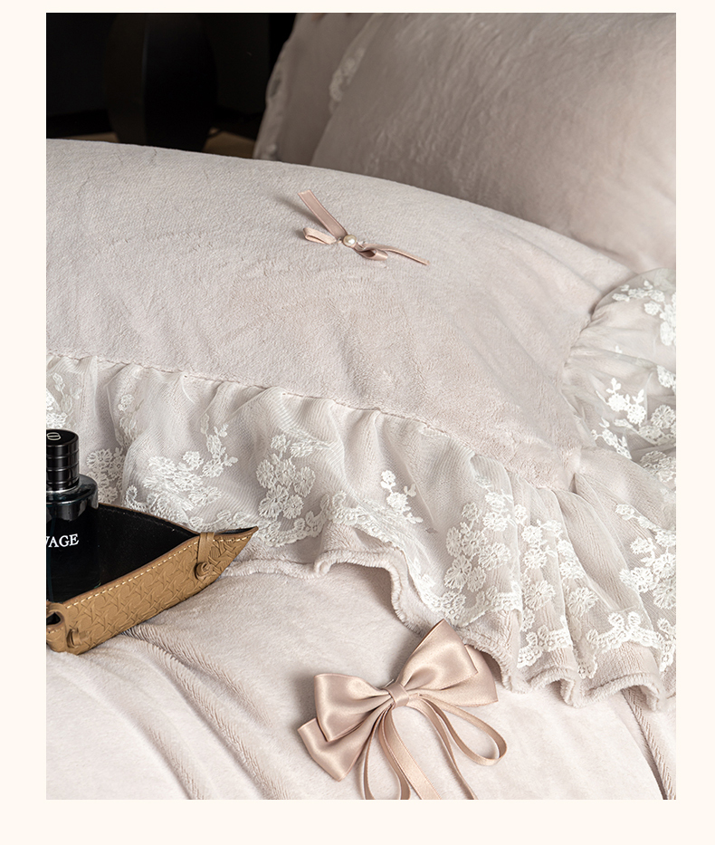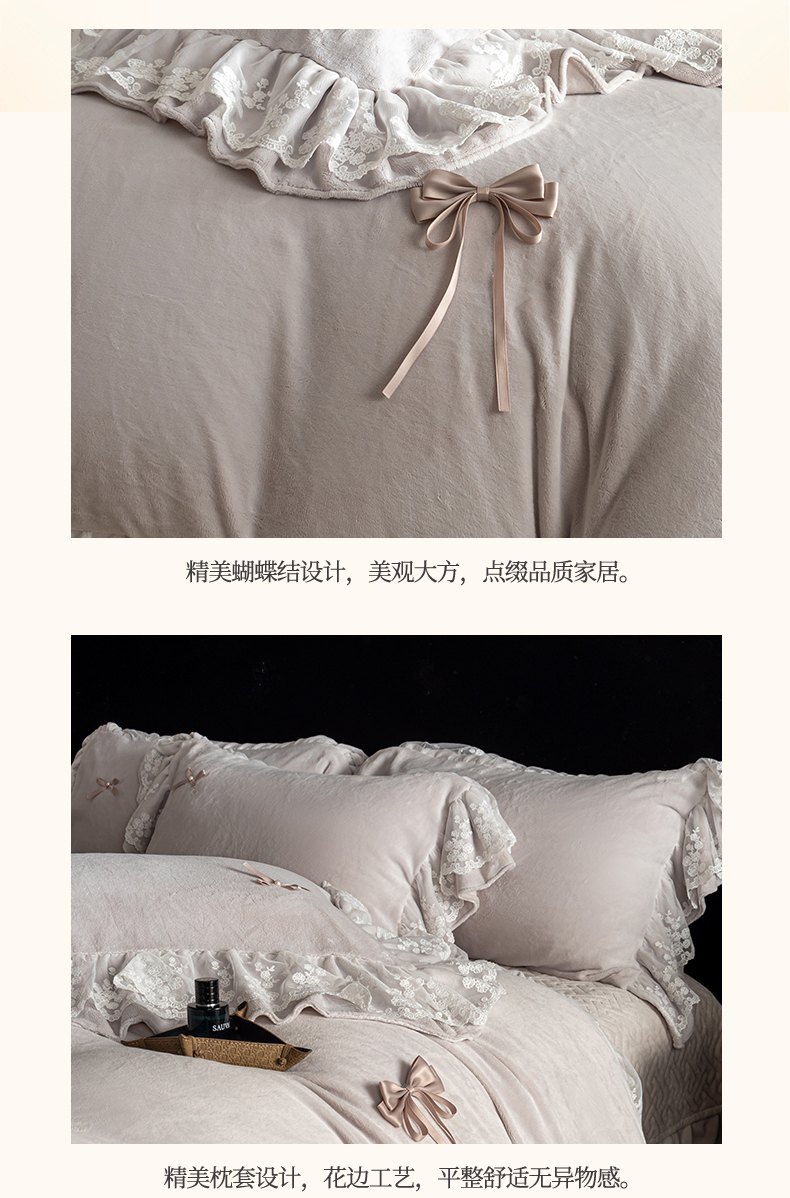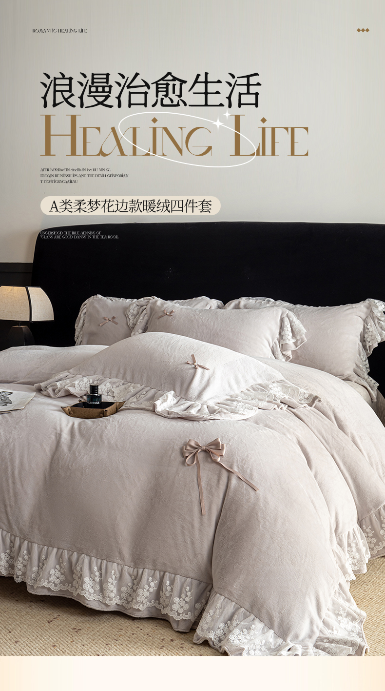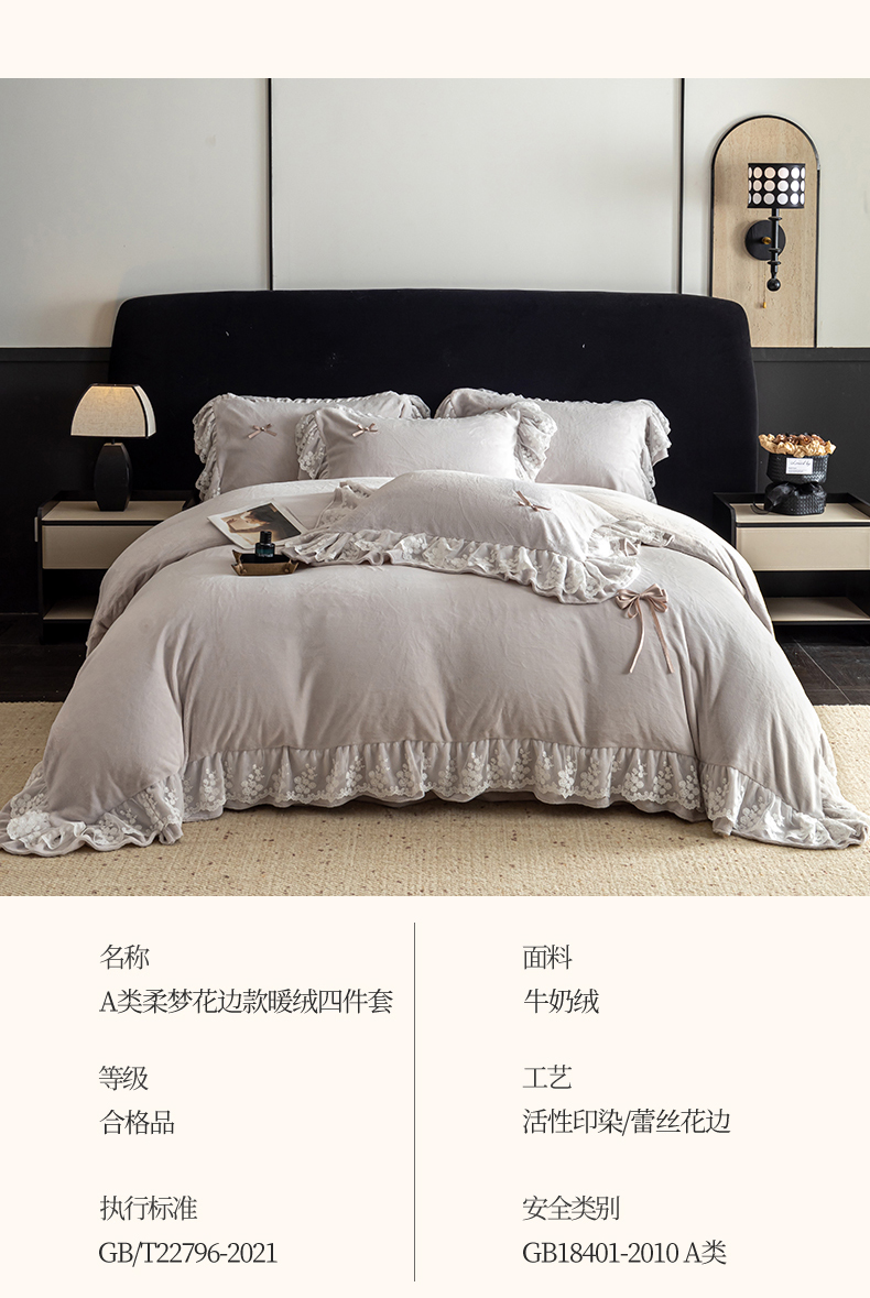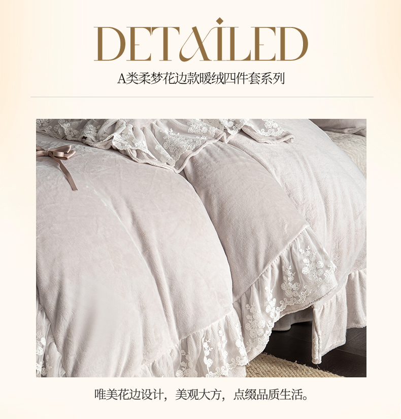 (总)罗优家纺 2025新款柔梦花边款暖绒四件套,暖杏色,柔雾蓝,柔雅灰,甜梦粉
