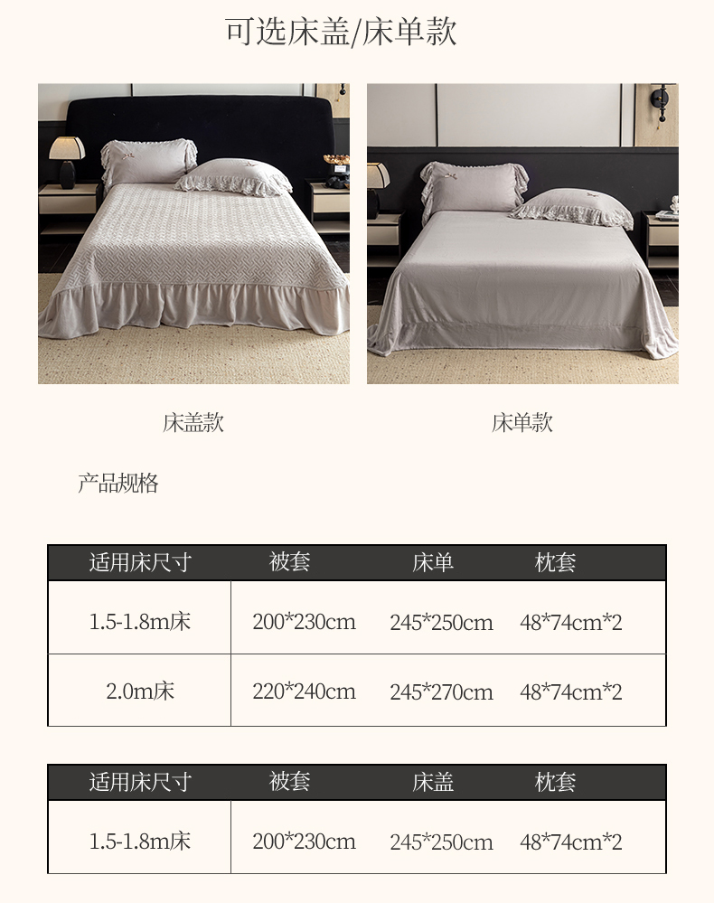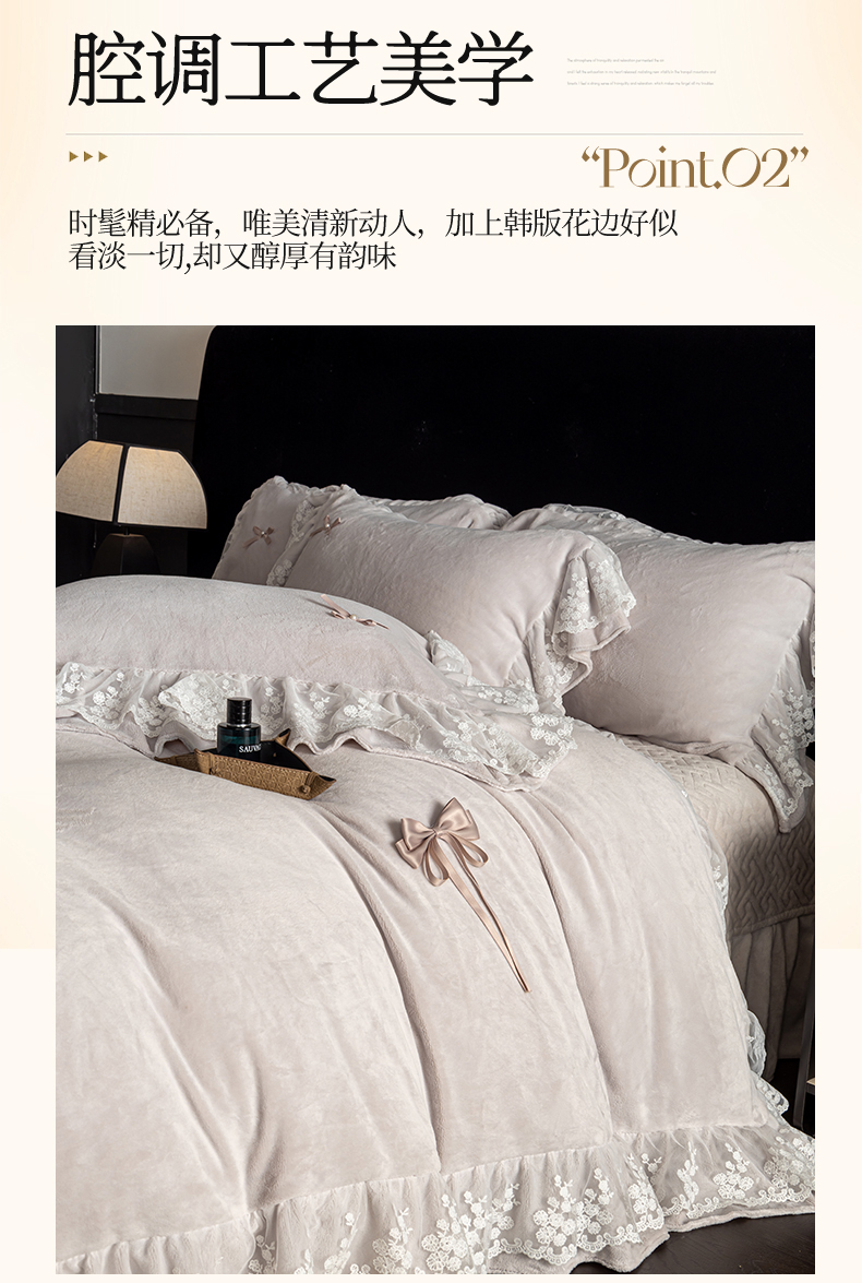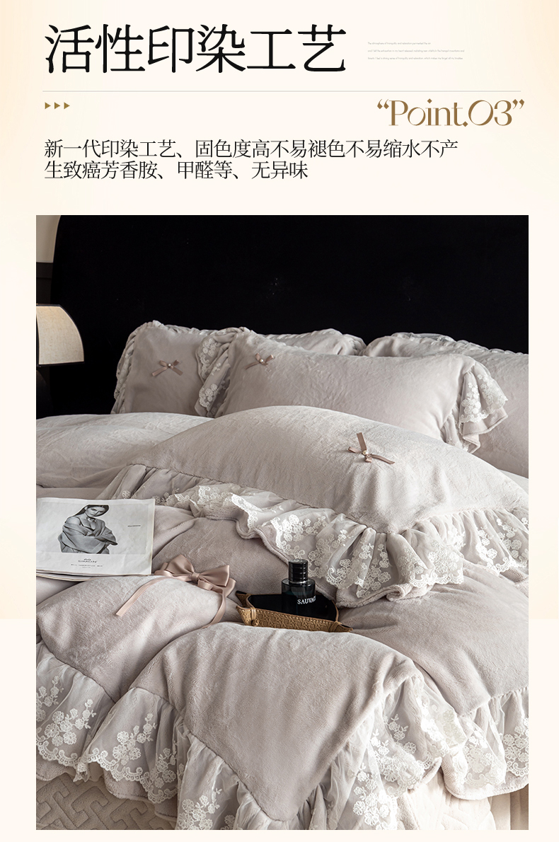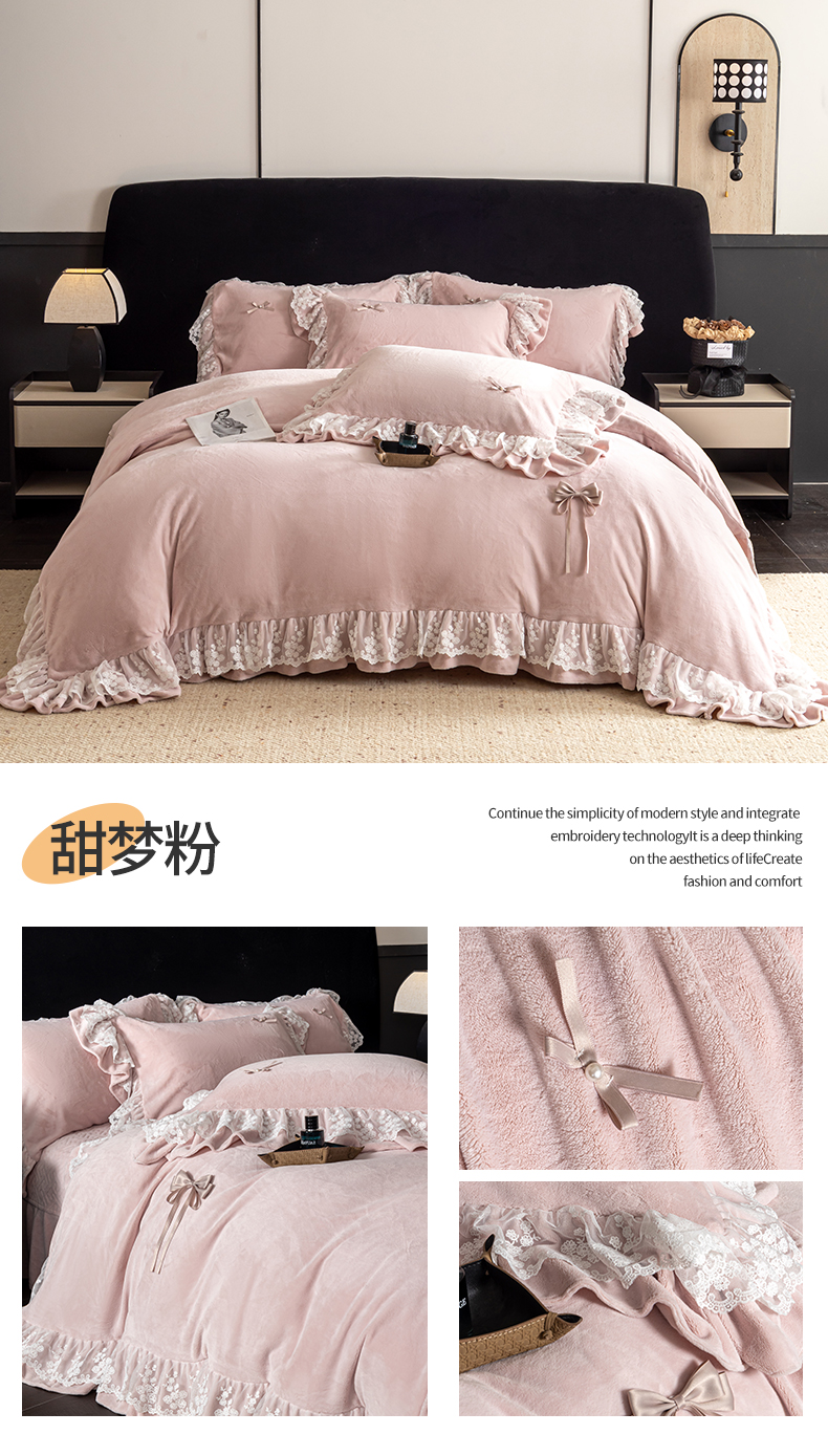(总)罗优家纺 2025新款柔梦花边款暖绒四件套,暖杏色,柔雾蓝,柔雅灰,甜梦粉
