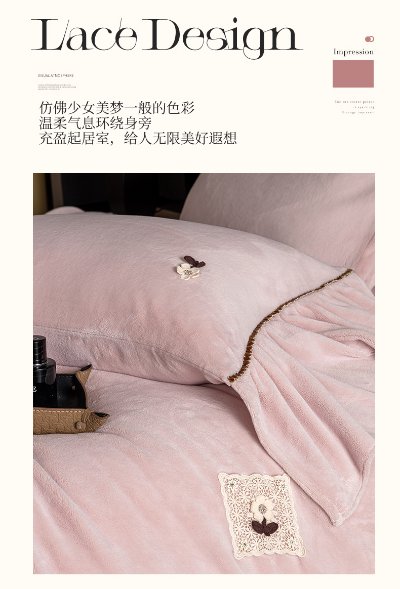 (总)罗优家纺 2025新款柔梦花边款暖绒四件套,暖杏色,柔雾蓝,柔雅灰,甜梦粉