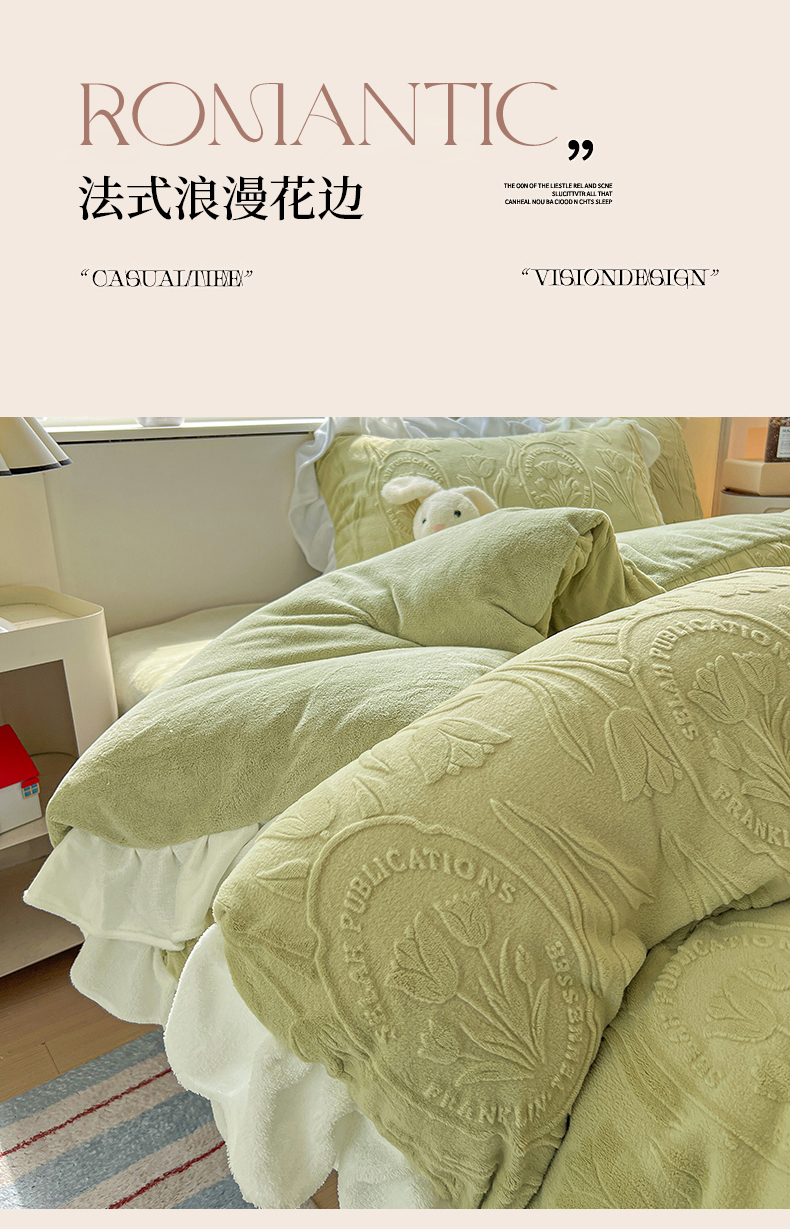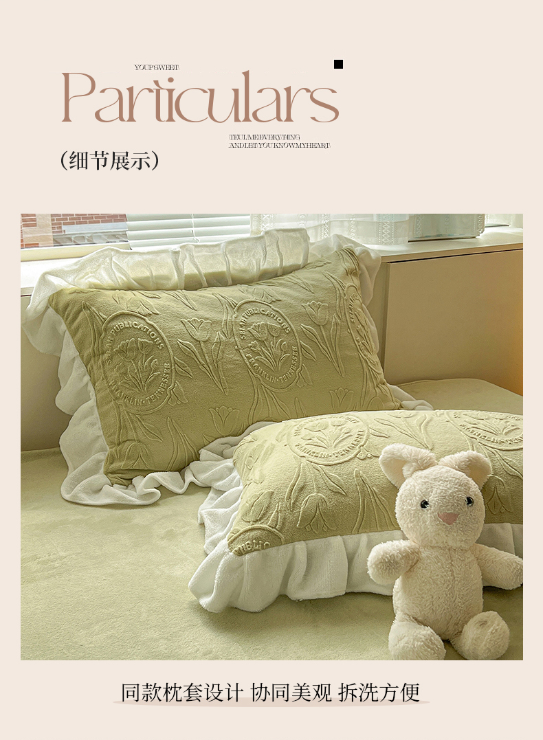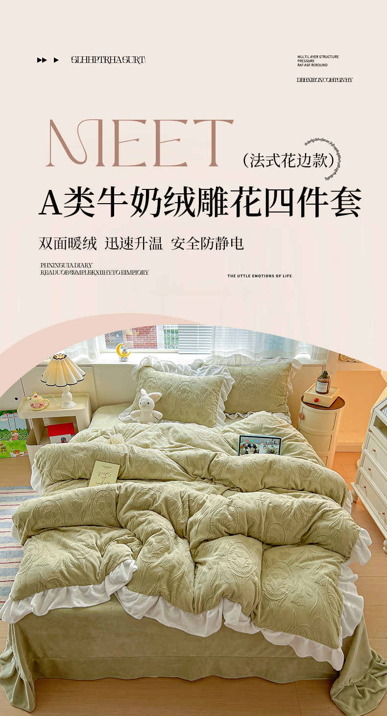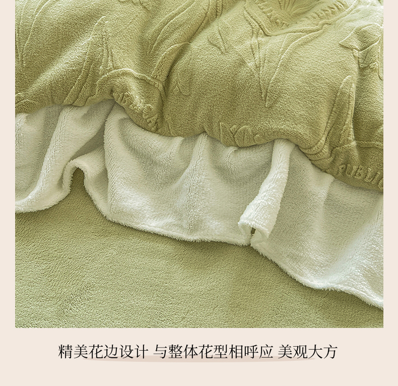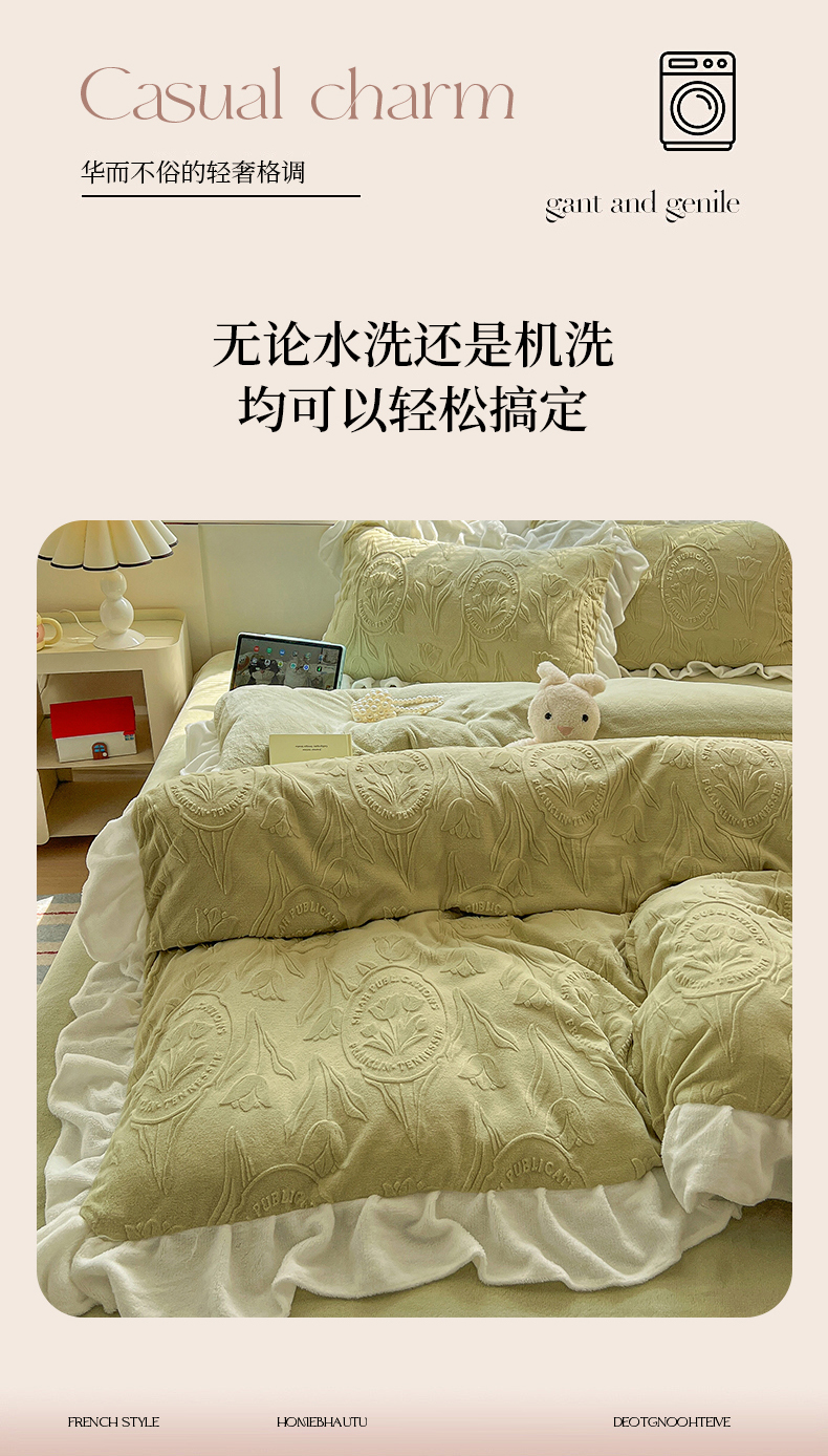 当前位置: 91家纺网 > 商品网购 > 床品套件 > 四件套 > 牛奶绒四件套 > 亿梵家居 2025新款法式花边款A类5D牛奶绒立体雕花四件套(提供买家秀) 花边款 郁金香-原野绿