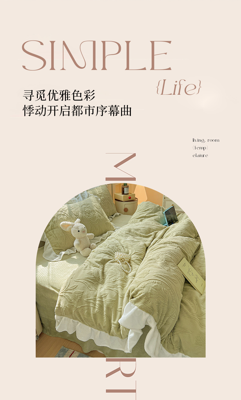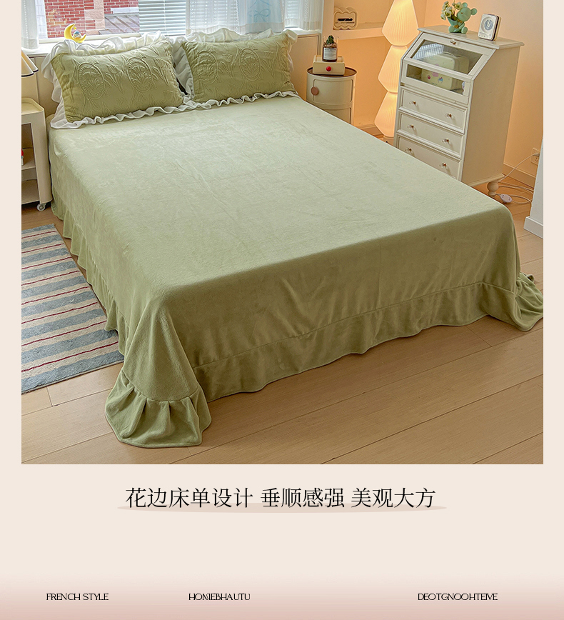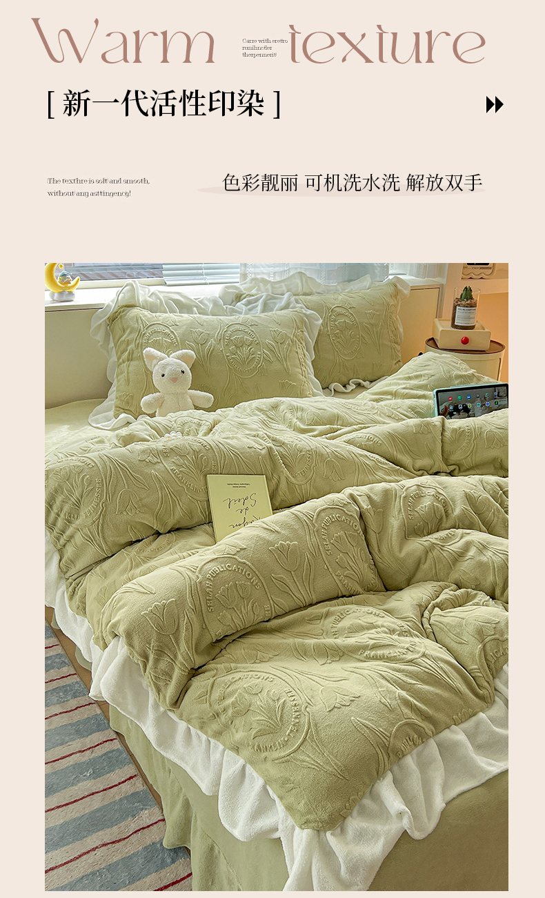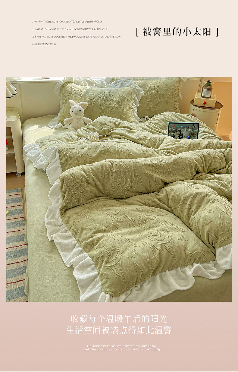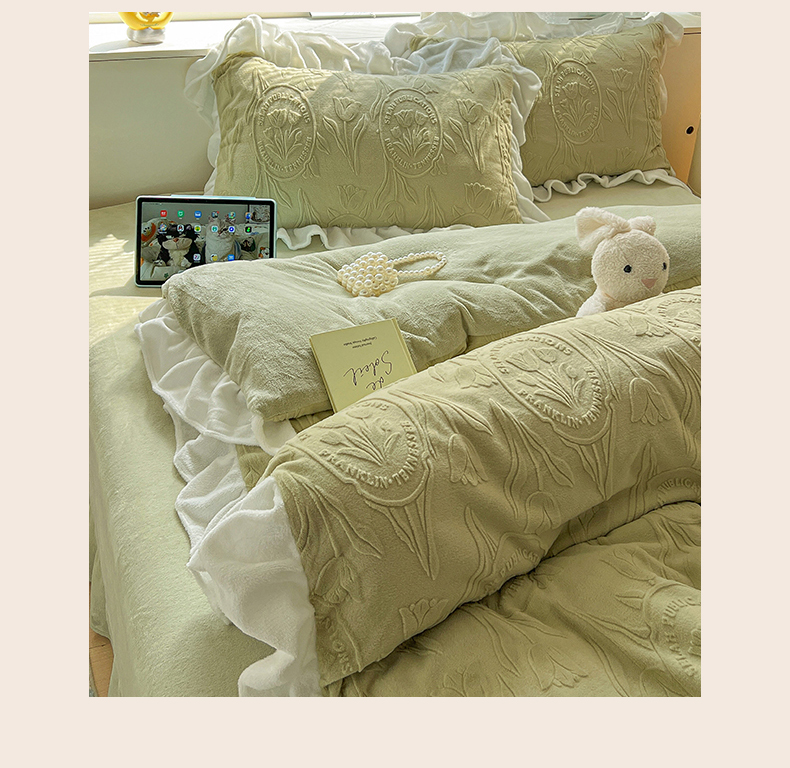 当前位置: 91家纺网 > 商品网购 > 床品套件 > 四件套 > 牛奶绒四件套 > 亿梵家居 2025新款法式花边款A类5D牛奶绒立体雕花四件套(提供买家秀) 花边款 郁金香-原野绿