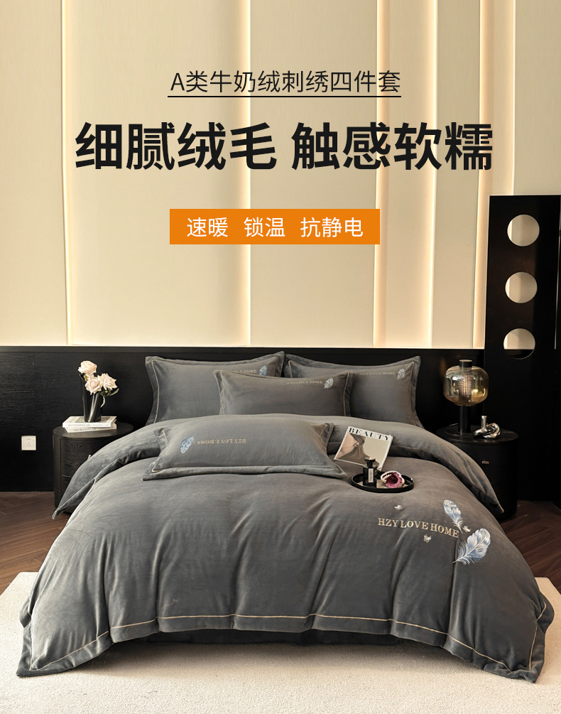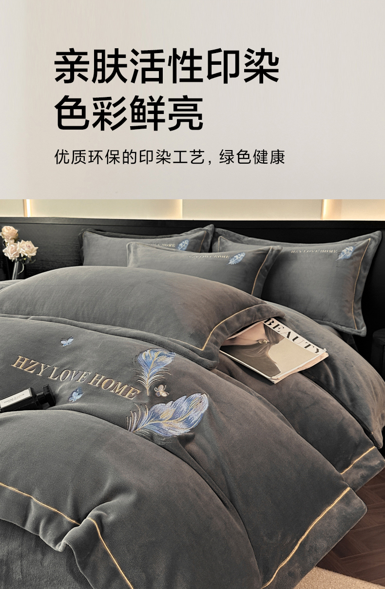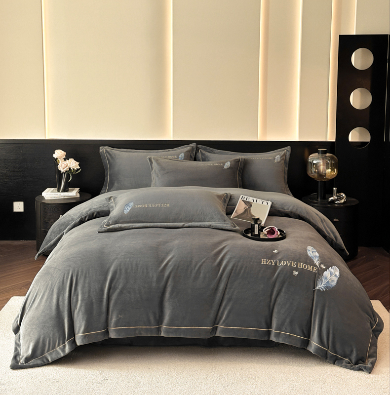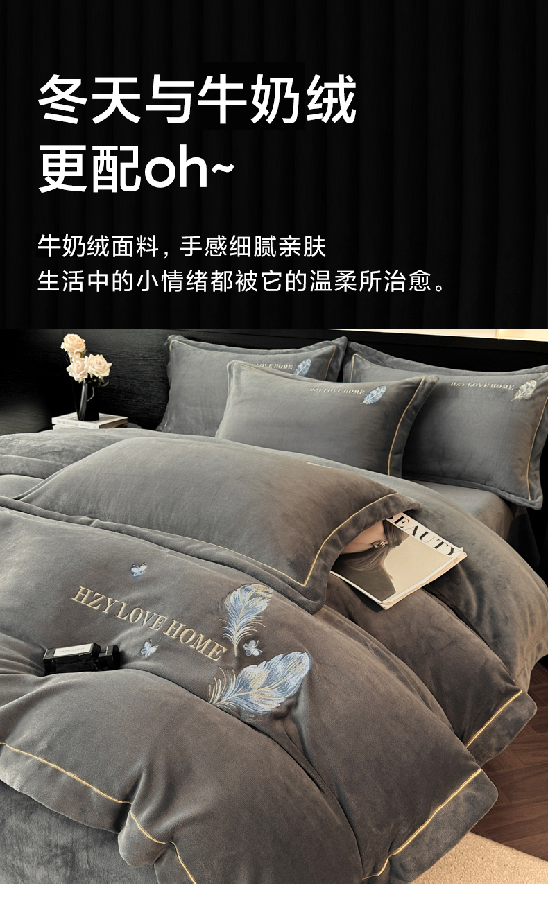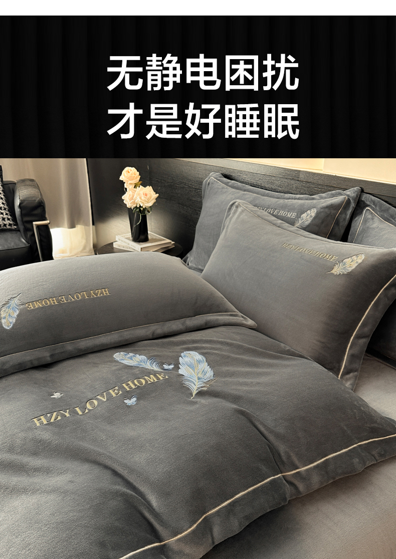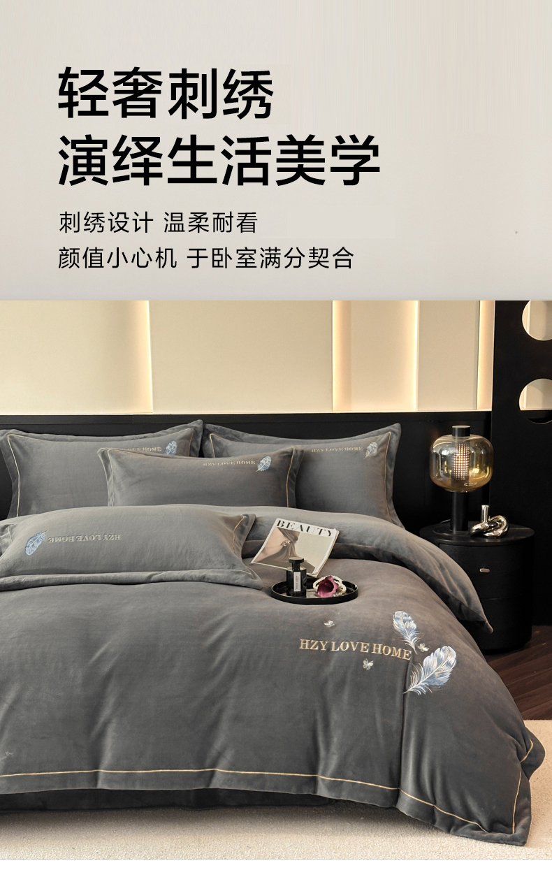 商品名称:鸿织源家纺 2025新款牛奶绒刺绣四件套-羽蝶 羽蝶-极致灰