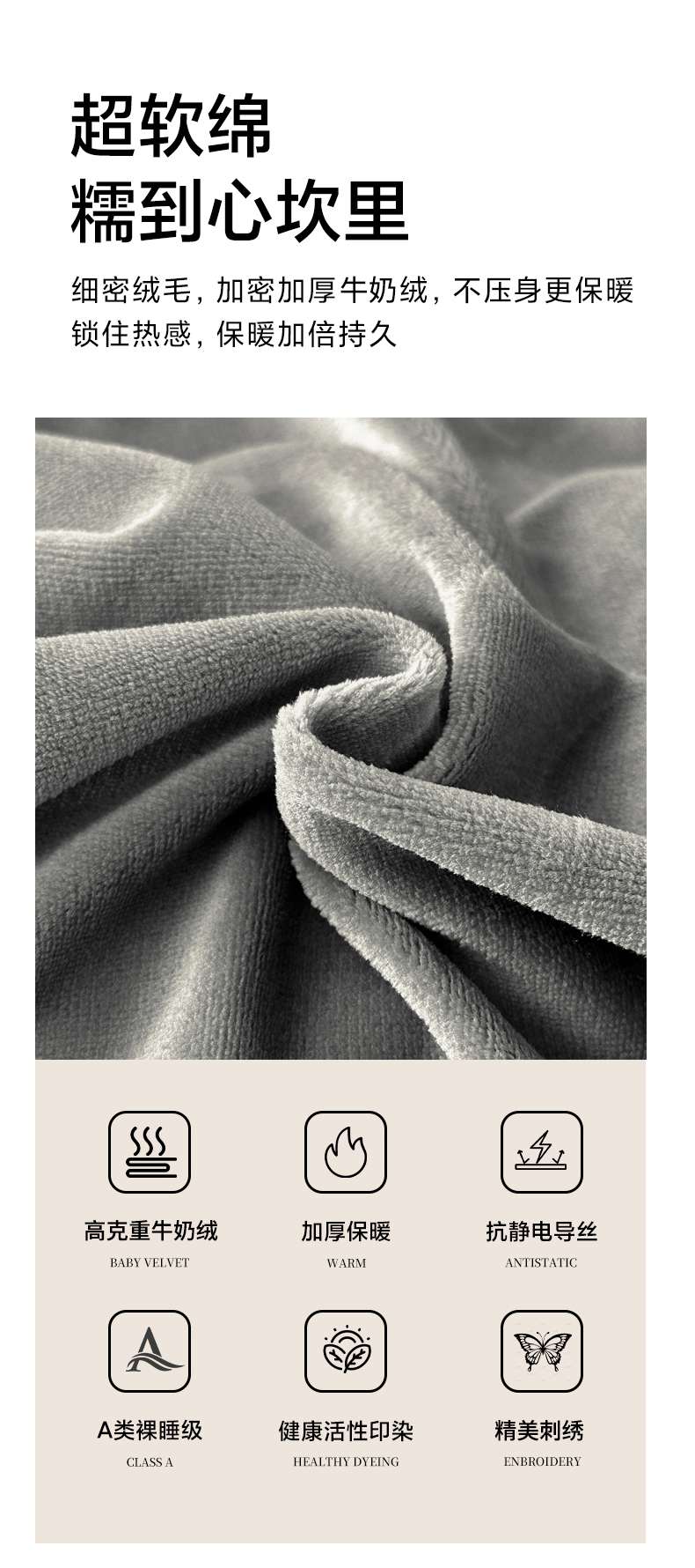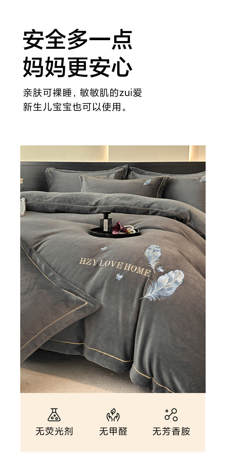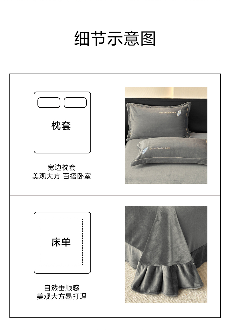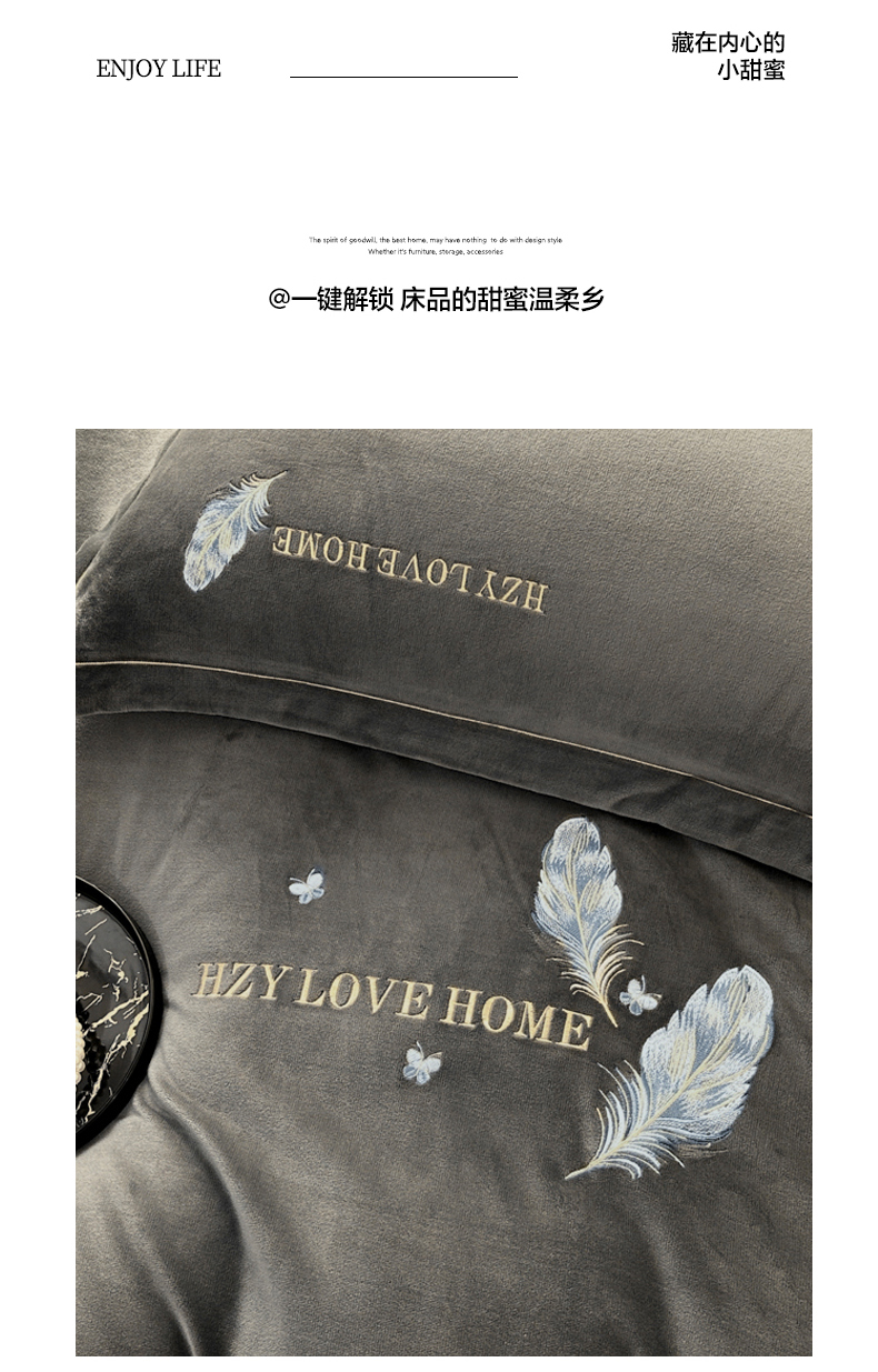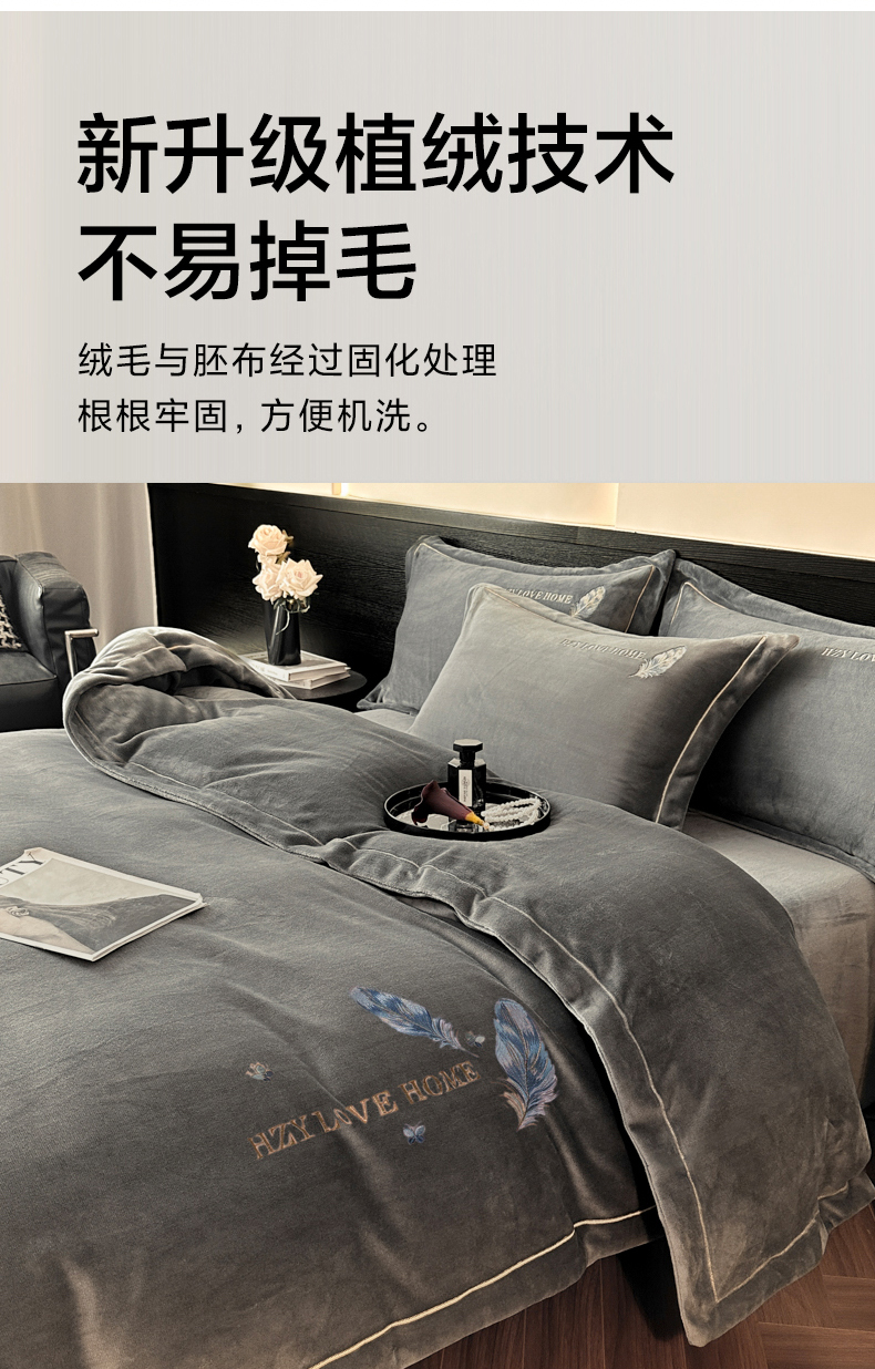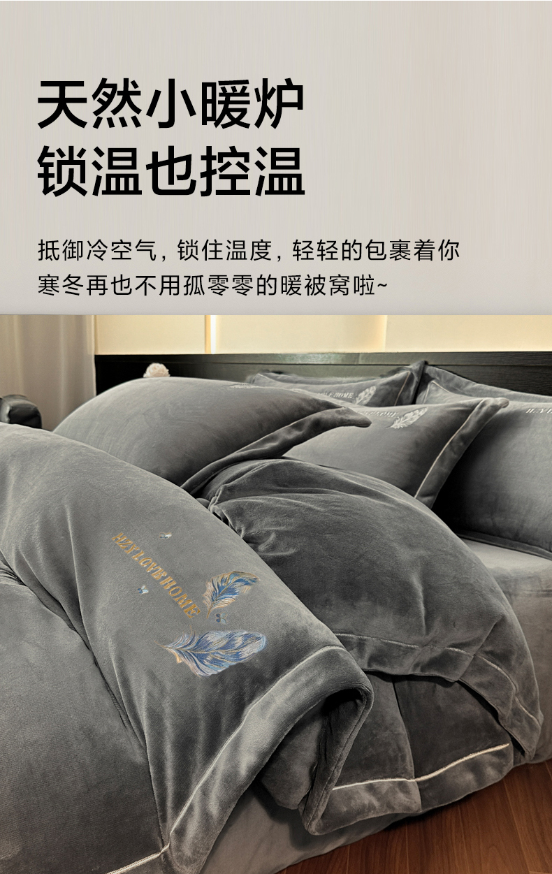 商品名称:鸿织源家纺 2025新款牛奶绒刺绣四件套-羽蝶 羽蝶-极致灰