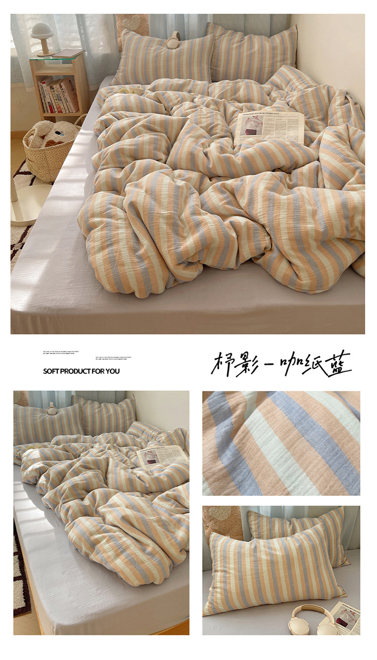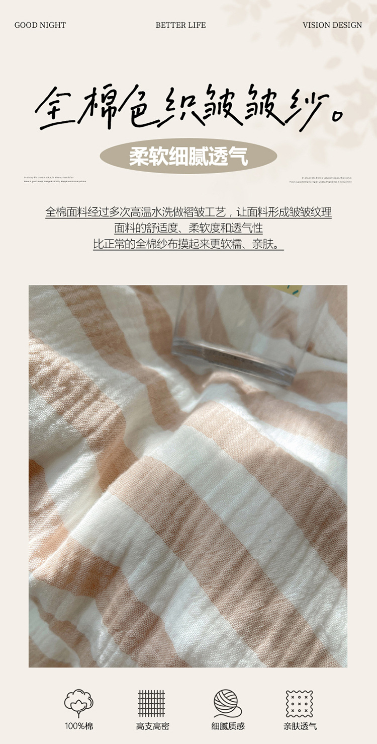 商品名称:良品汇馆 2025【全棉色织皱皱纱四件套】条纹A类双层纱套件民宿柔软床品 杼影-奶泡粉
