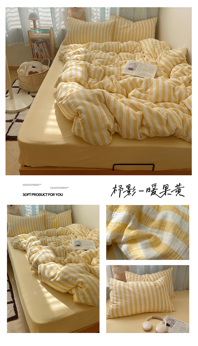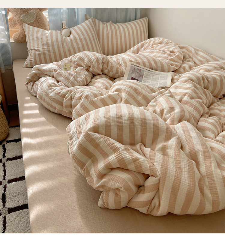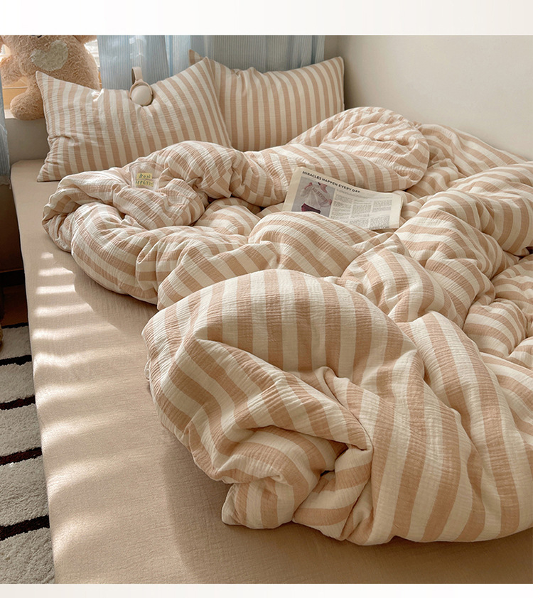 良品汇馆 2025【全棉色织皱皱纱四件套】条纹A类双层纱套件民宿柔软床品 杼影-奶泡粉