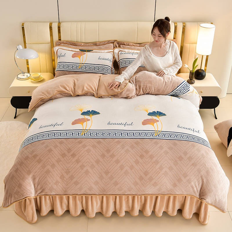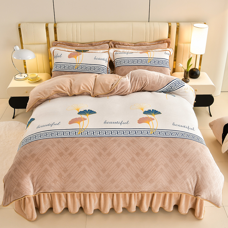 绘萱2025新品爆款8斤包边印花牛奶绒四件套床裙款法莱绒金貂貂狐 杏运-卡其