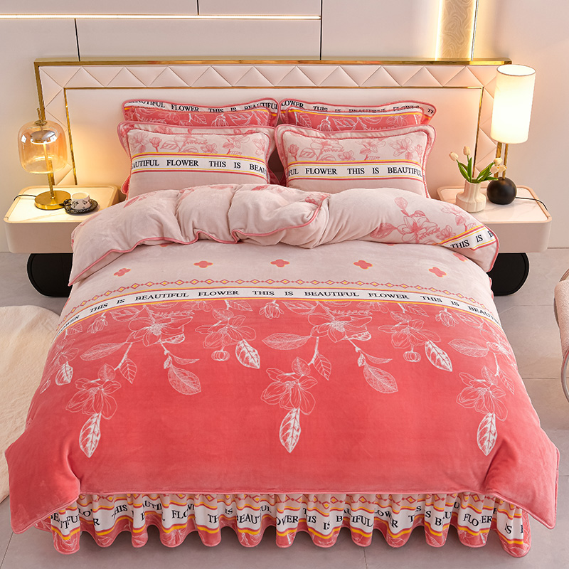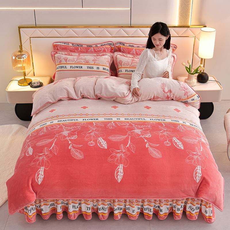 绘萱2025新品爆款8斤包边印花牛奶绒四件套床裙款法莱绒金貂貂狐 枝繁叶茂-粉
