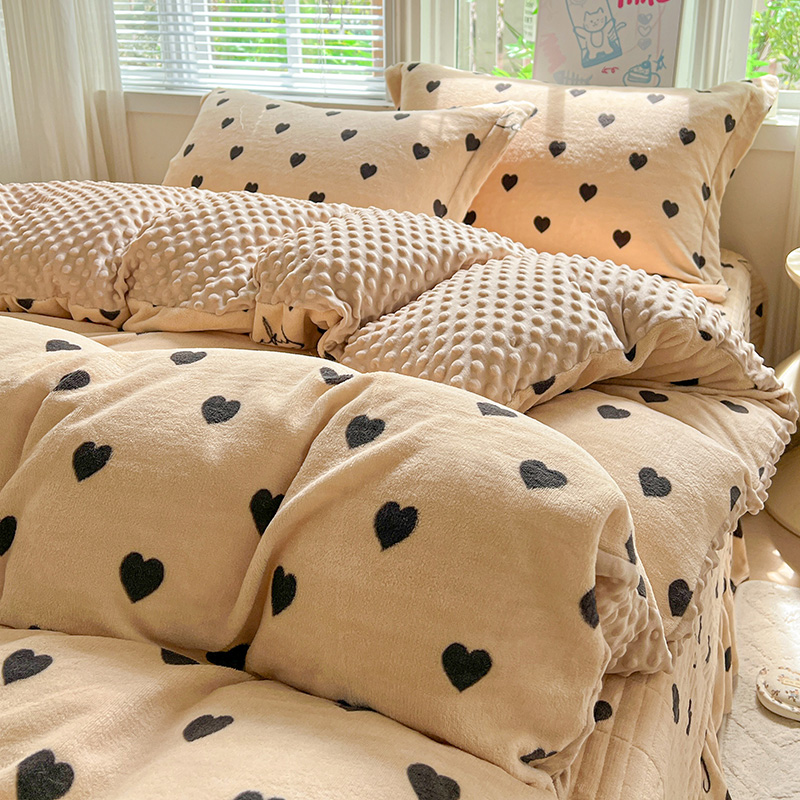 当前位置: 91家纺网 > 商品网购 > 床品套件 > 四件套 > 牛奶绒四件套 > 一比一 2025新款加厚保暖豆豆牛奶绒床盖款四件套咖色小心心