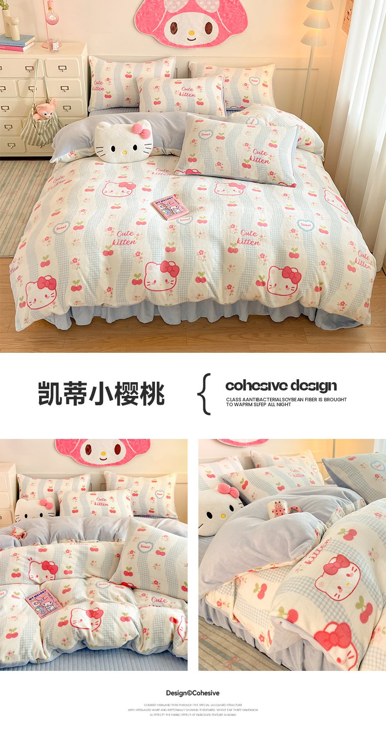 (总)摩妮卡 2025新款牛奶绒枕套混搭卡通复古床盖四件套,甜点凯蒂猫,傍晚凯蒂猫,幸运小猫,线条腊肠狗,生日小猫,粉帽小狗,豹纹小猫,庆祝凯蒂猫