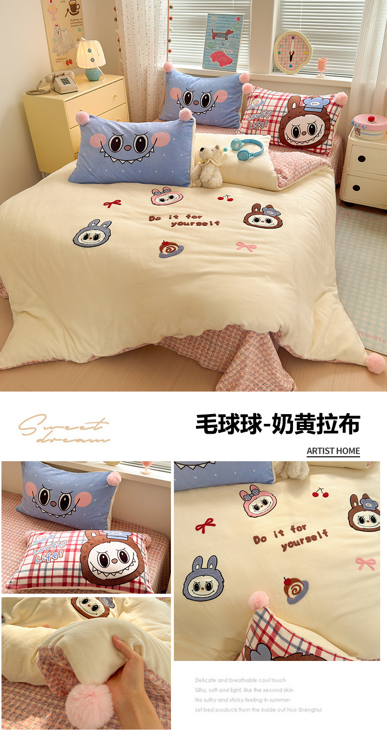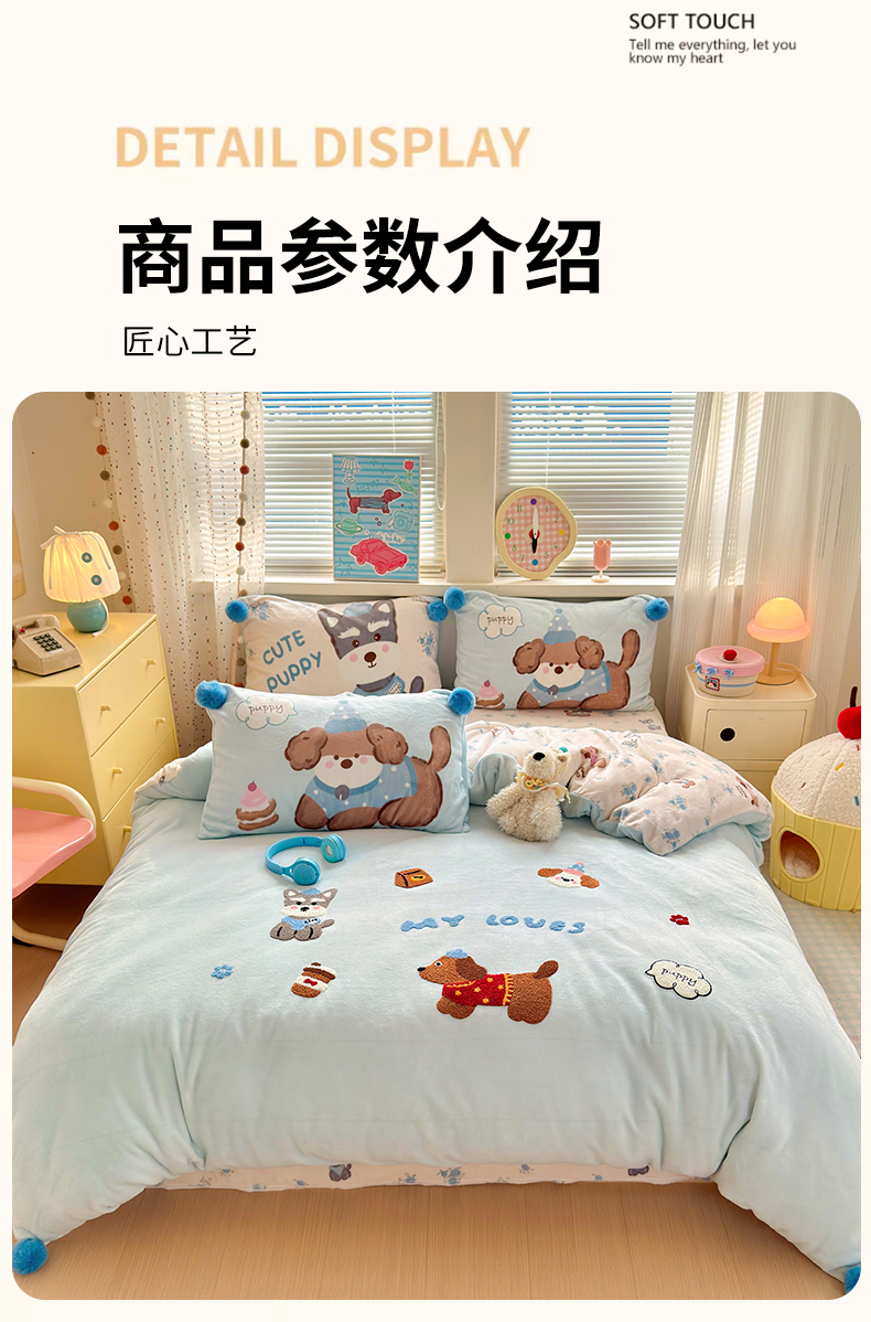 (总)寐居家纺 2025新款贴布绣高克重牛奶绒四件套,安吉拉喵,查理狗,粉糯kitty,皮皮布布