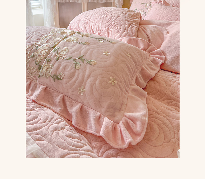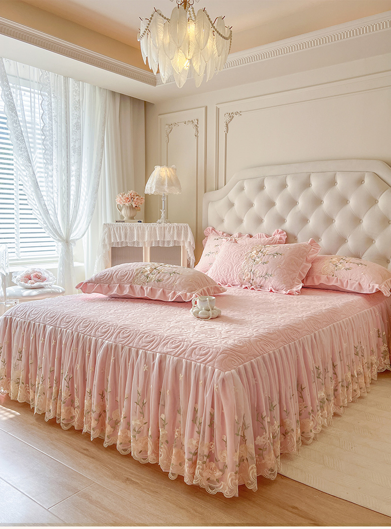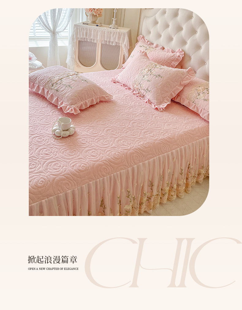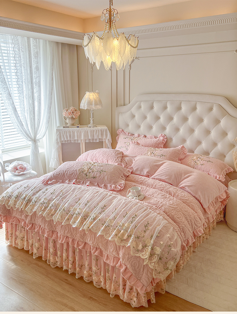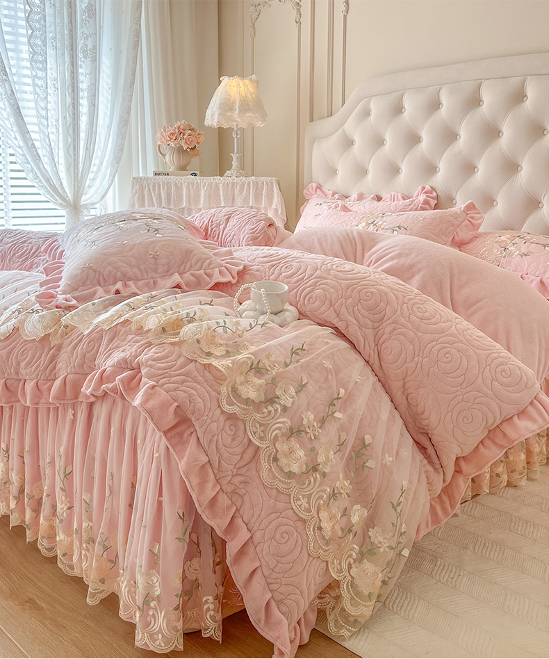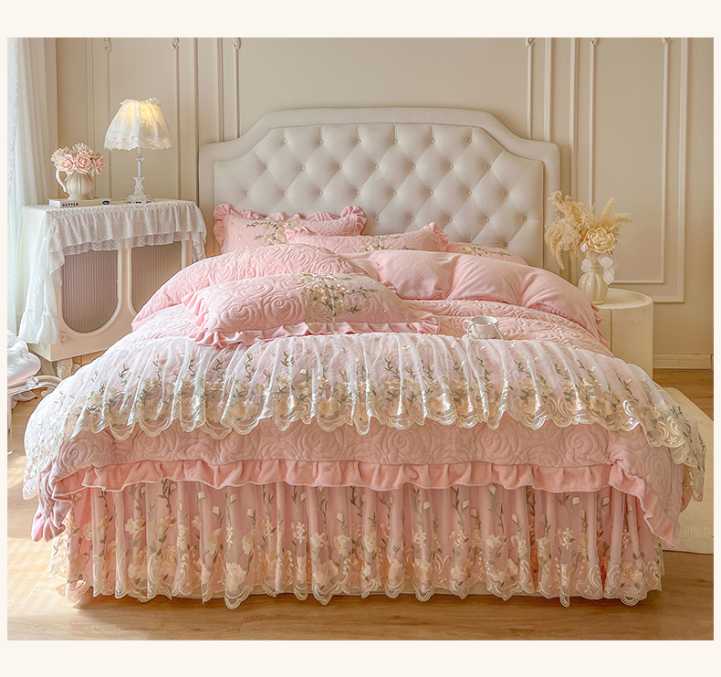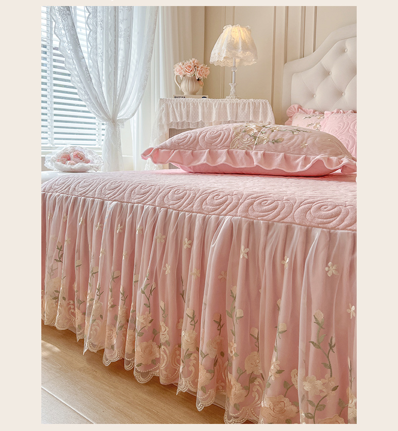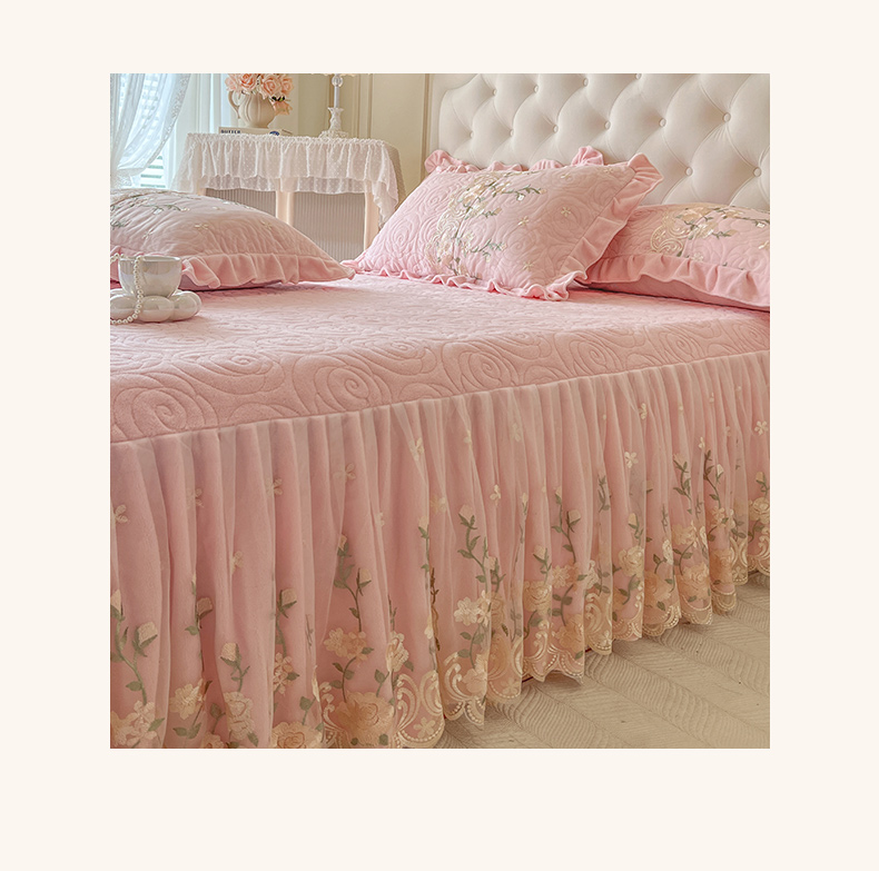 当前位置: 91家纺网 > 商品网购 > 床品套件 > 四件套 > 牛奶绒四件套 > 恋尚 2025新款柔软牛奶绒保暖蕾丝床裙四件套-玫瑰故事(控价305) 玫瑰故事-清新粉